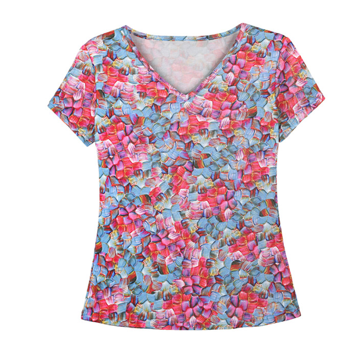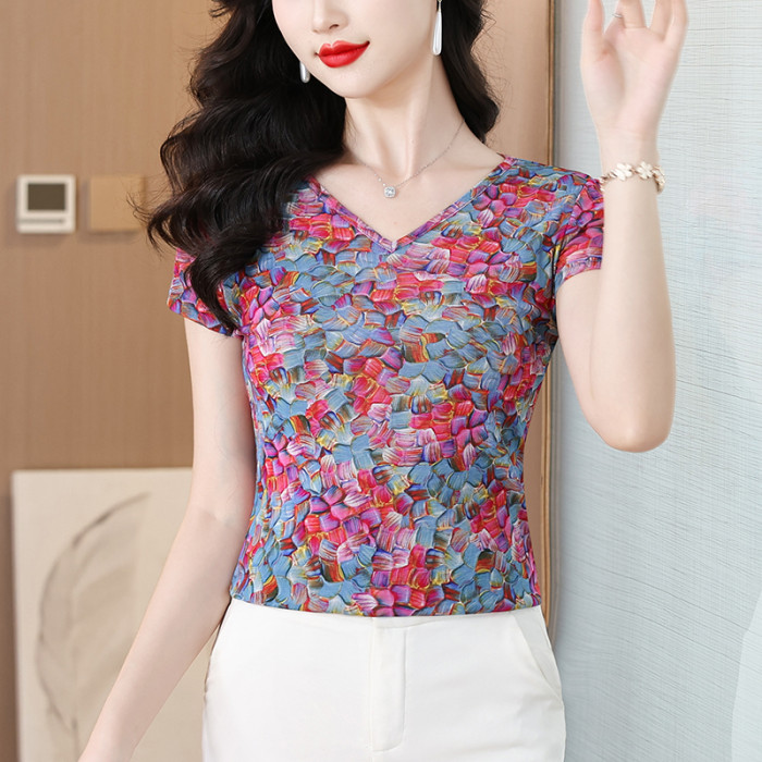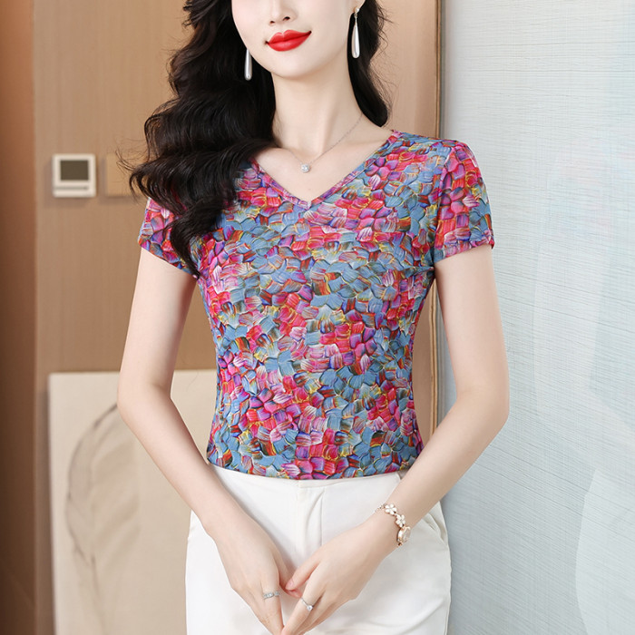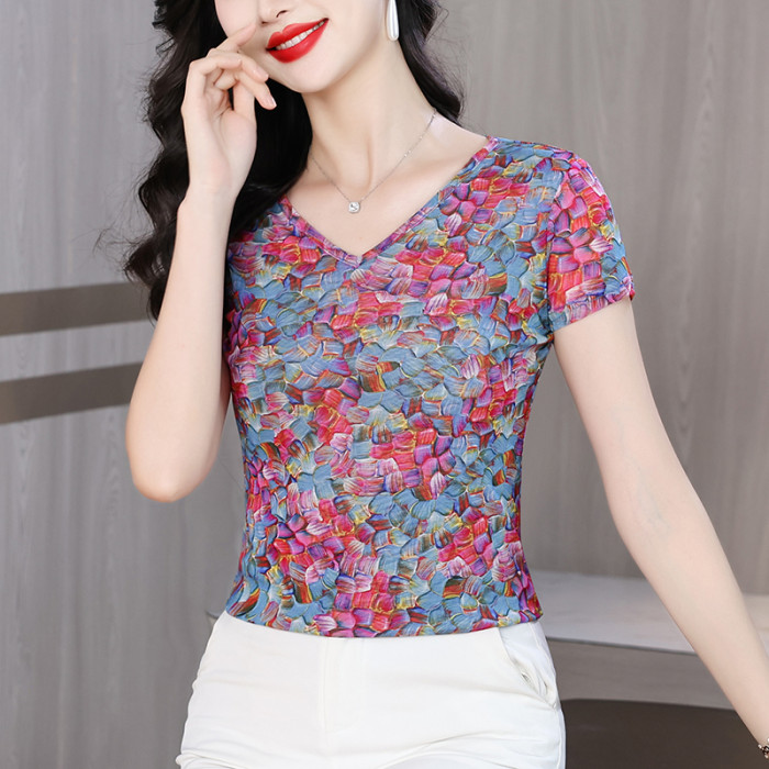 網紗短袖V領花色打底衫女夏季2025新款時髦外穿洋氣修身顯瘦上衣