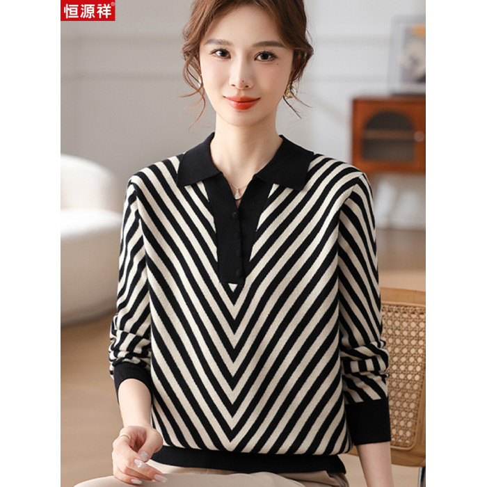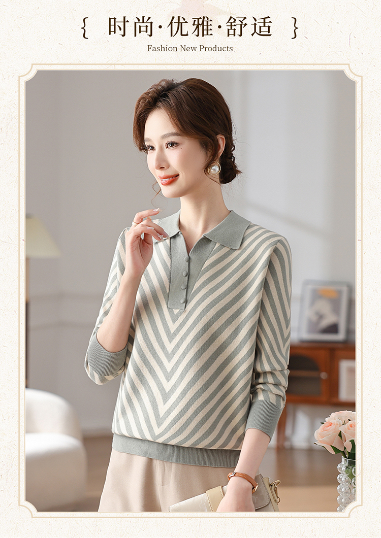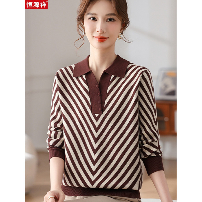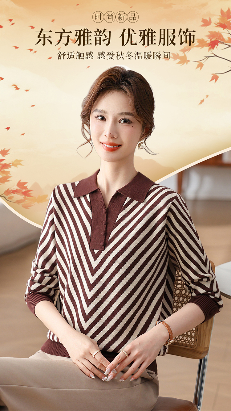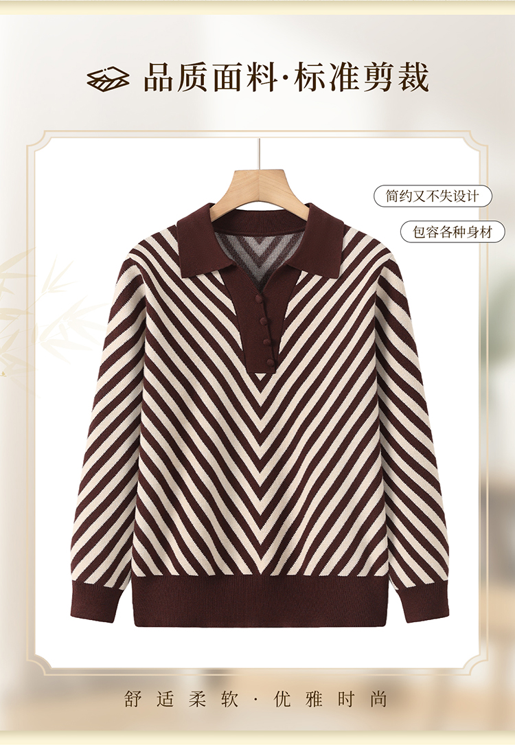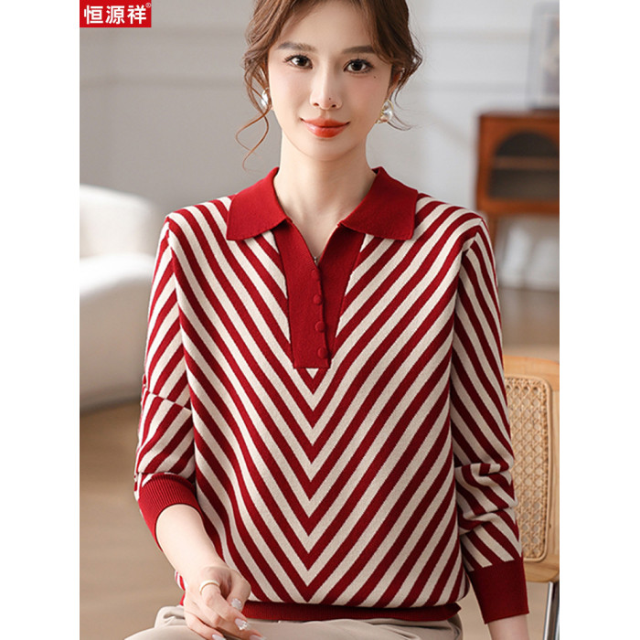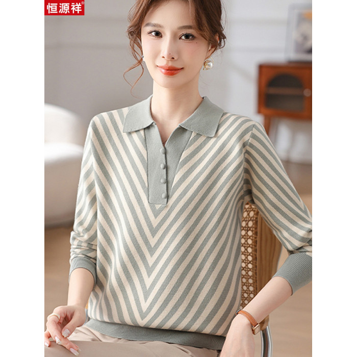 恒源祥媽媽裝春秋羊毛針織衫小衫加大碼中老年時尚翻領條紋打底衫