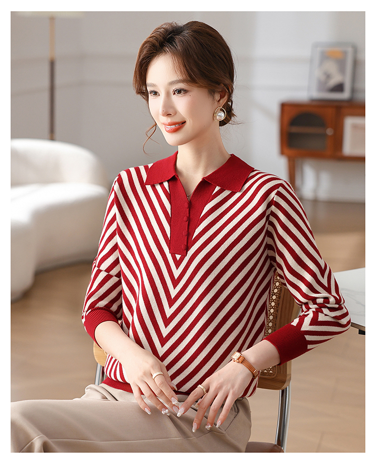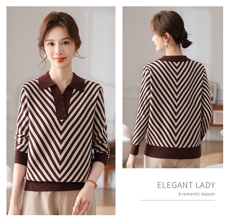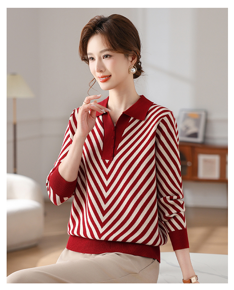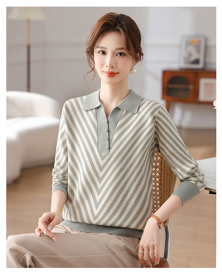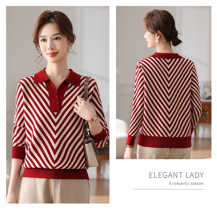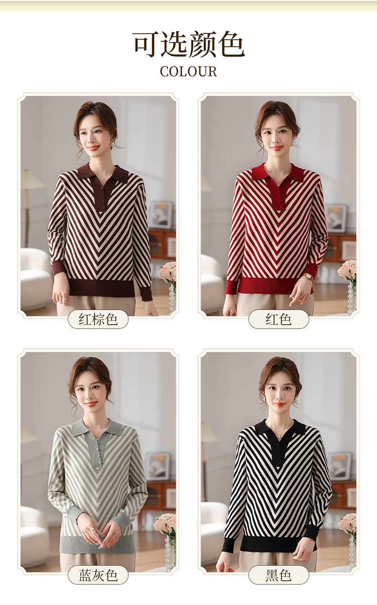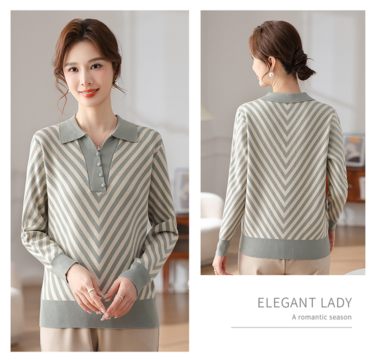 恒源祥媽媽裝春秋羊毛針織衫小衫加大碼中老年時尚翻領條紋打底衫