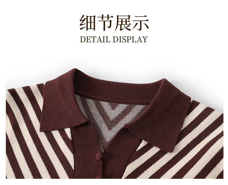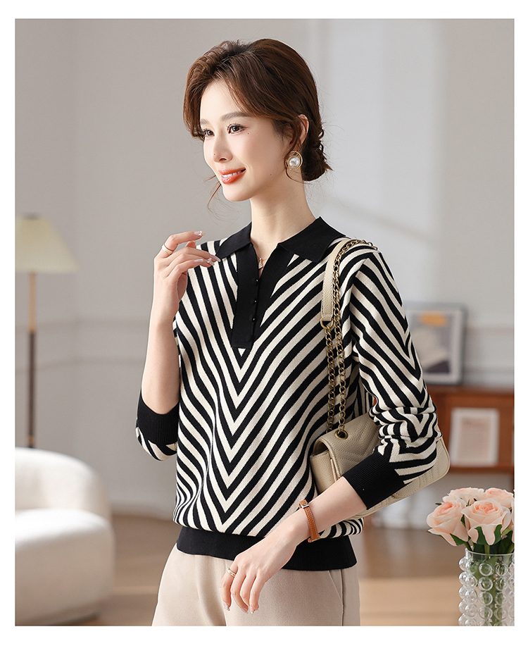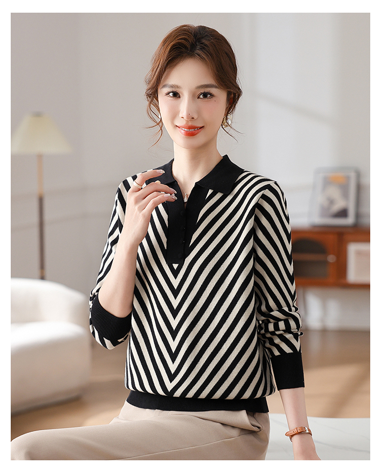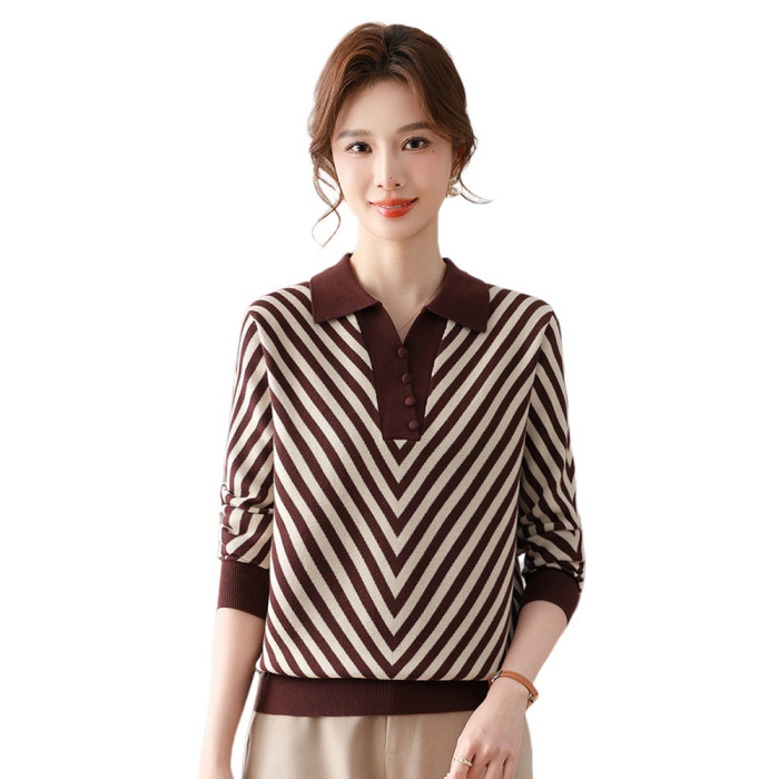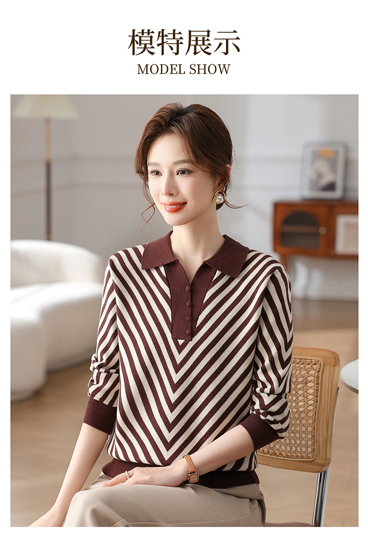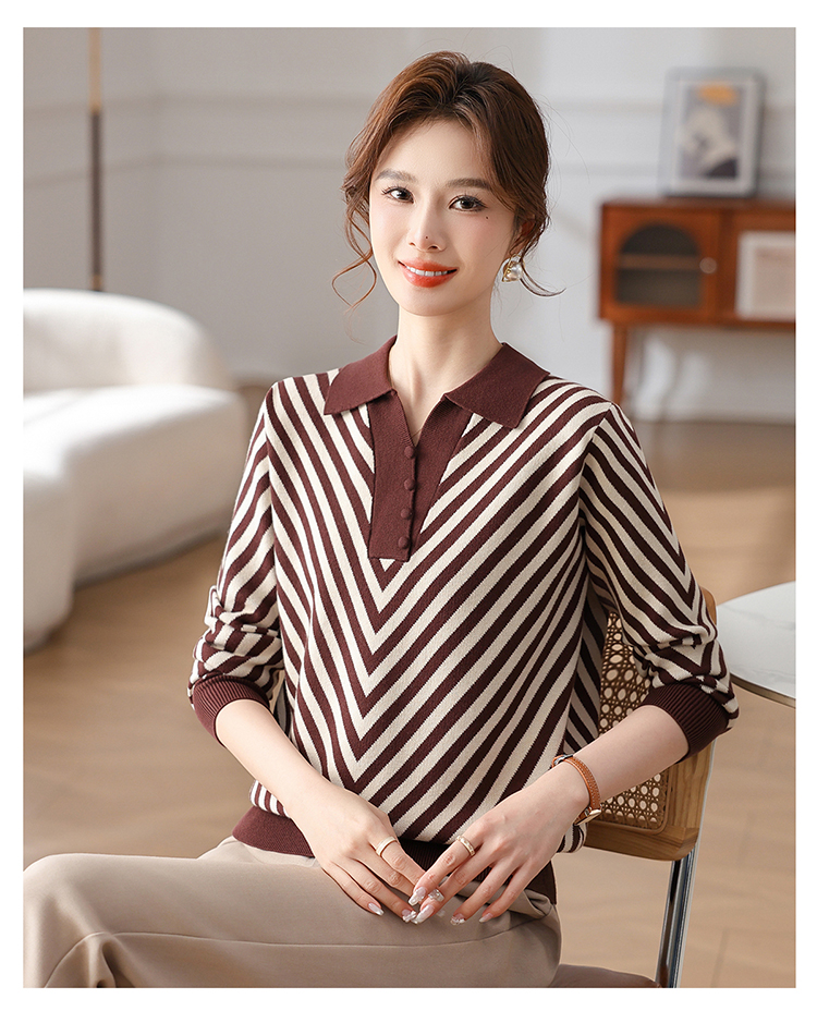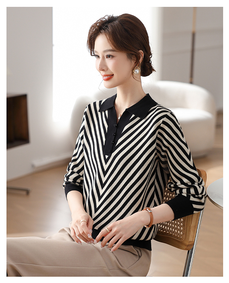 恒源祥媽媽裝春秋羊毛針織衫小衫加大碼中老年時尚翻領條紋打底衫