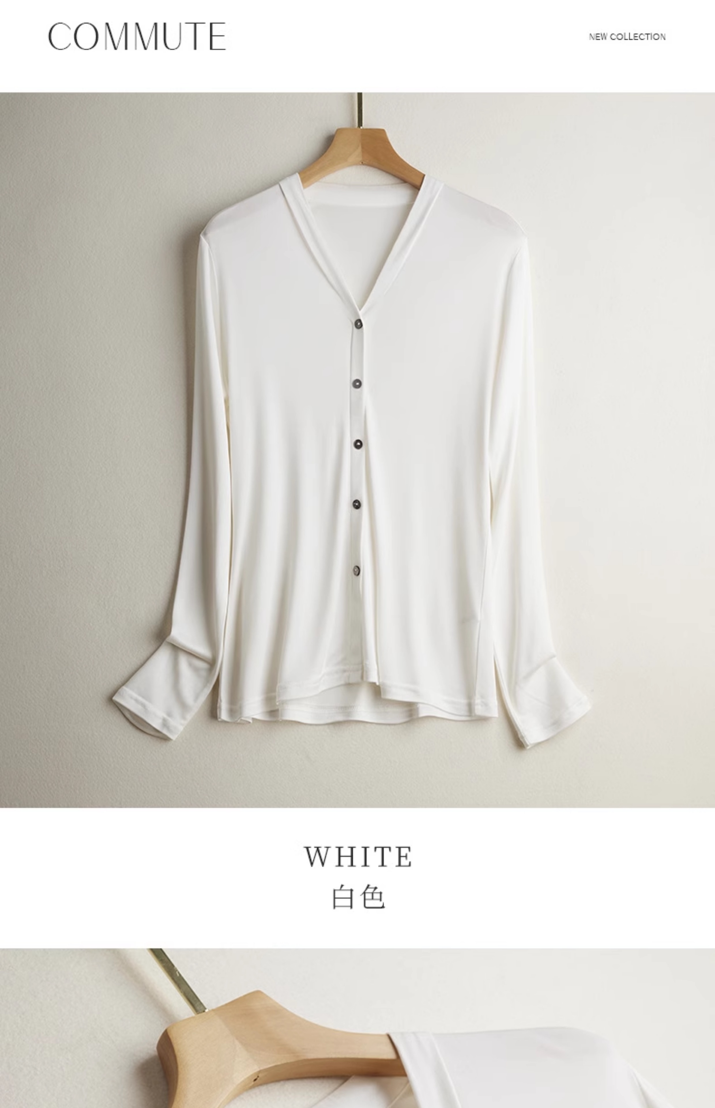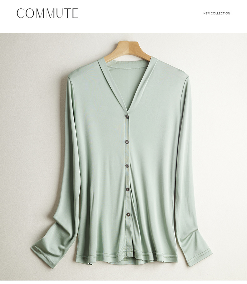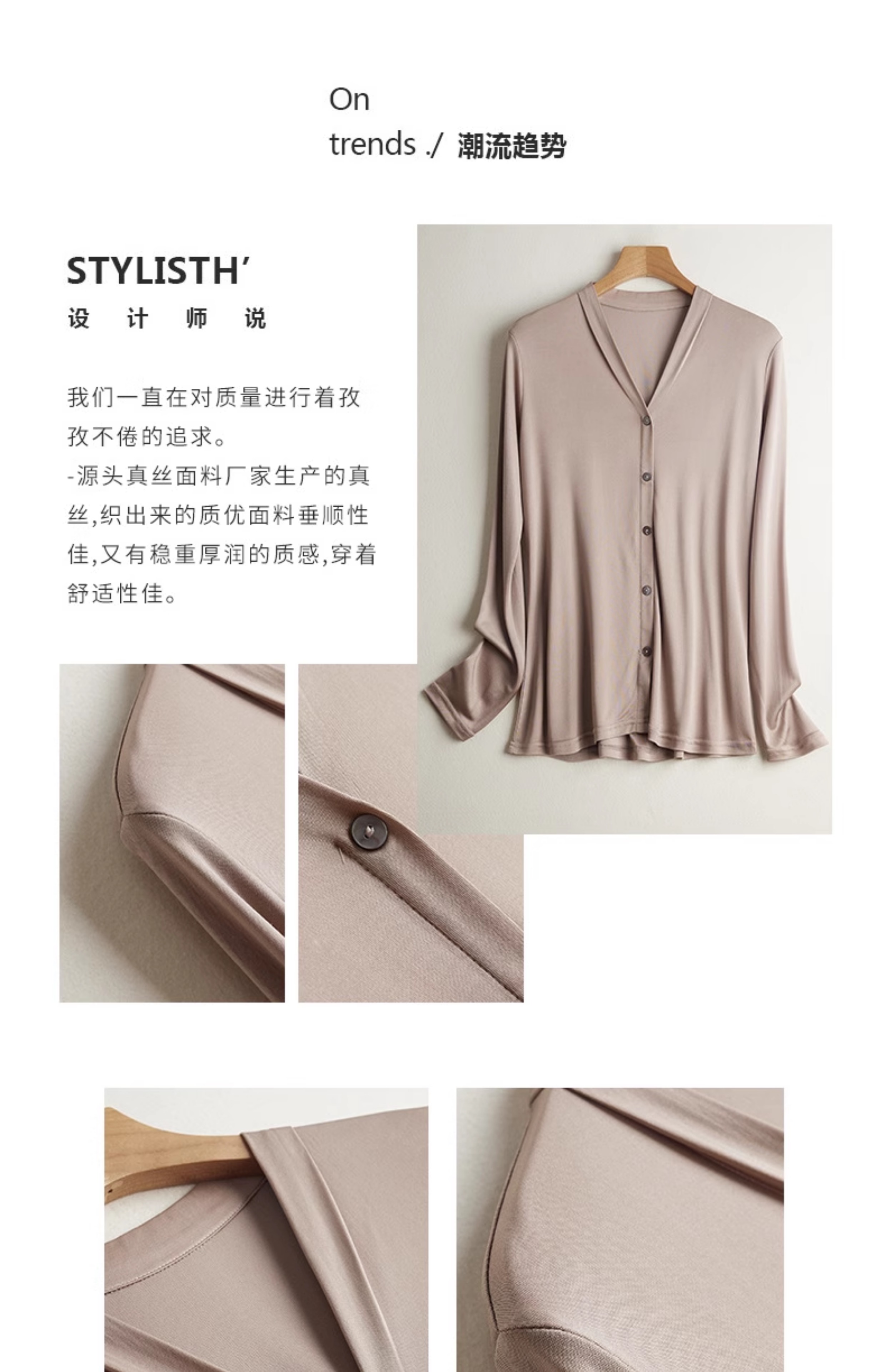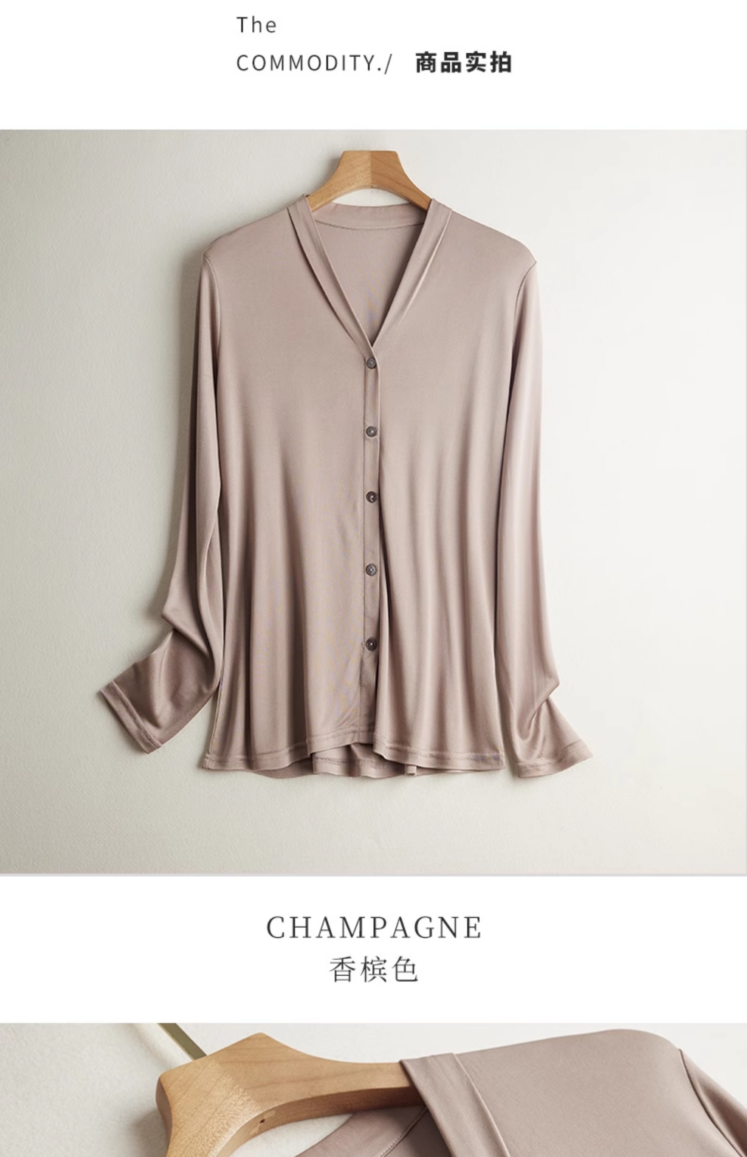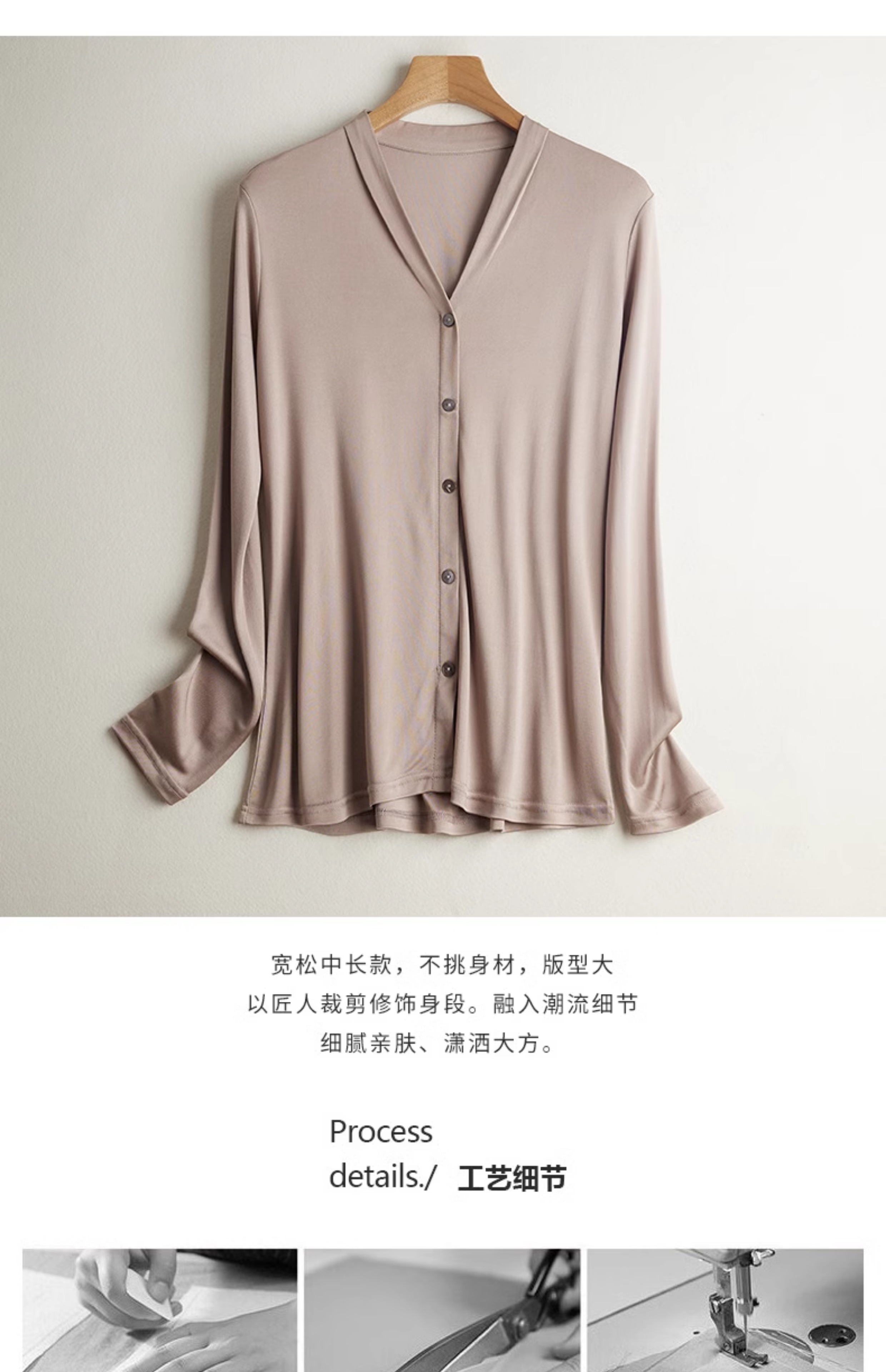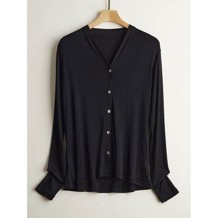 雙面針織桑蠶絲長袖打底衫黑色單排鈕釦外穿V領套頭衫真絲肌底衣