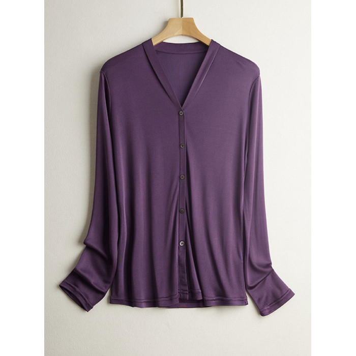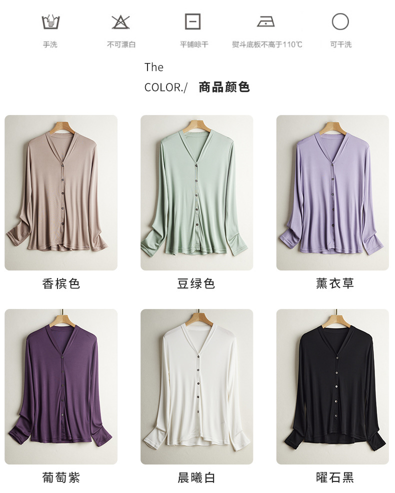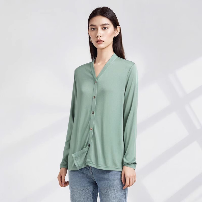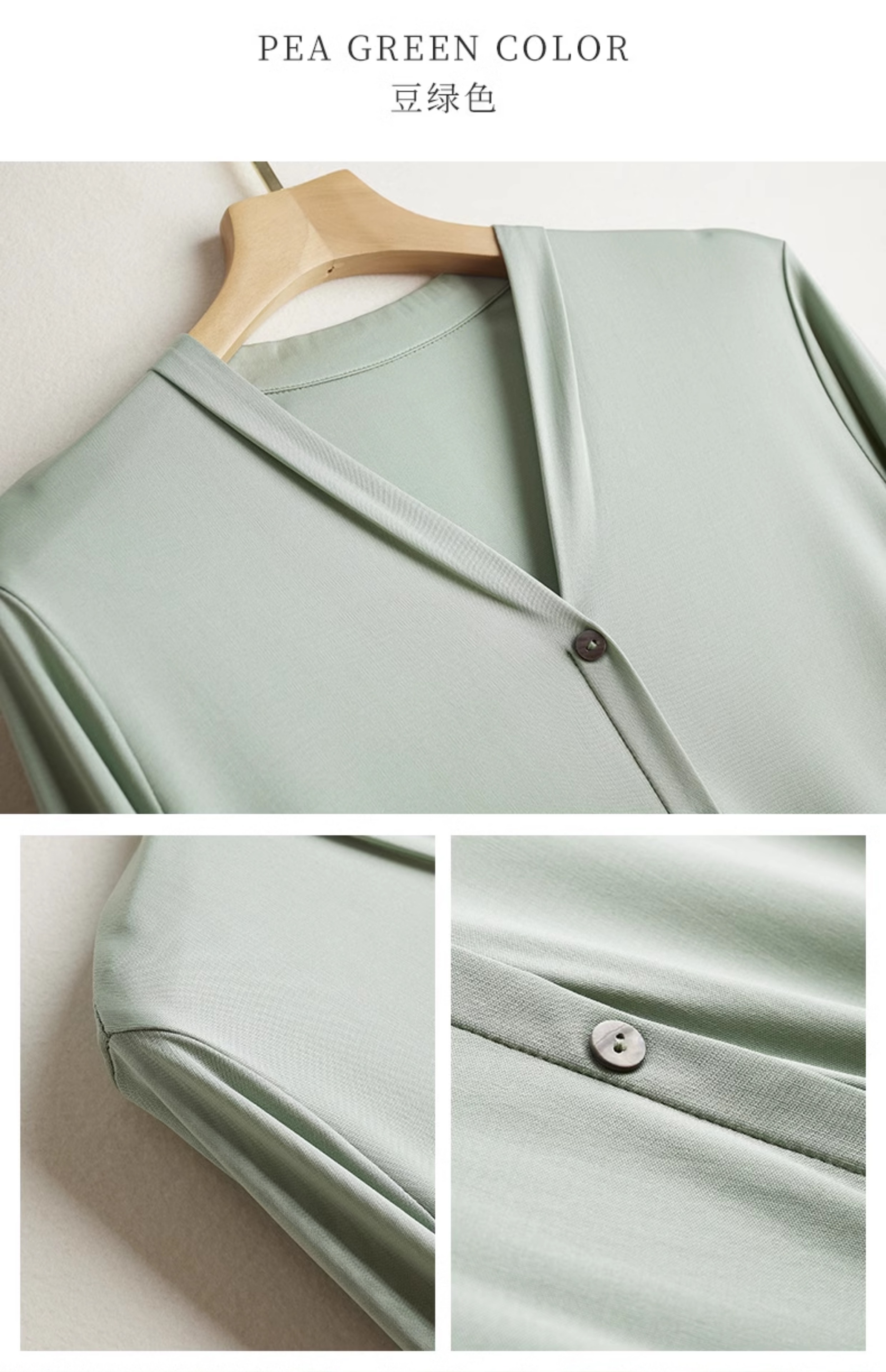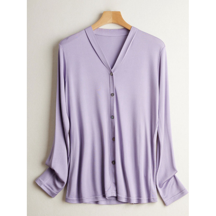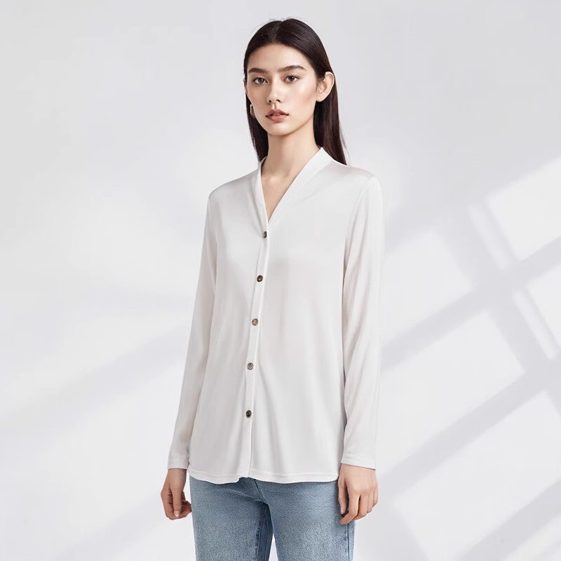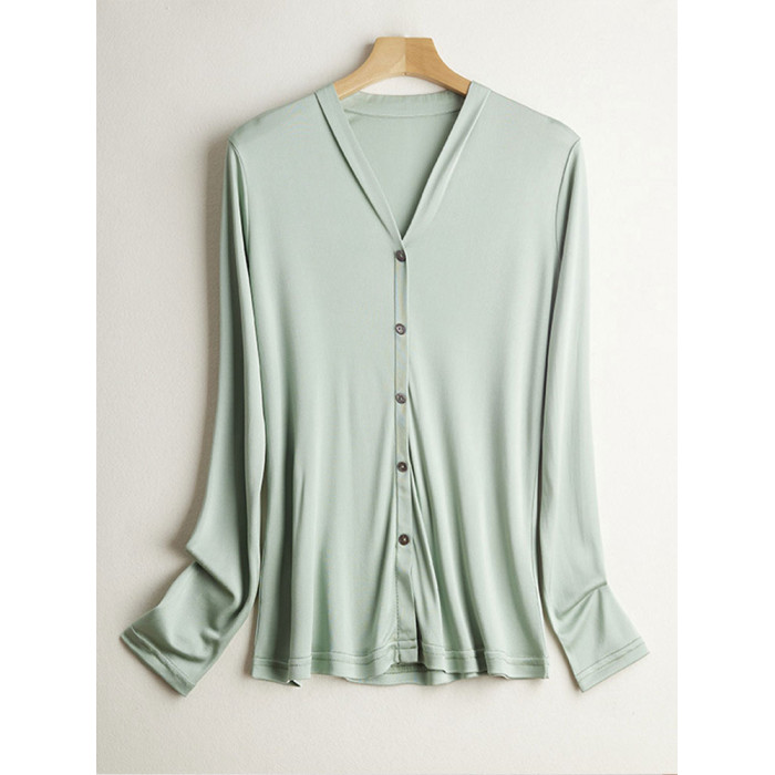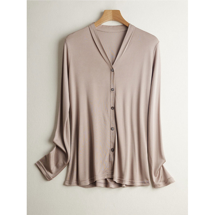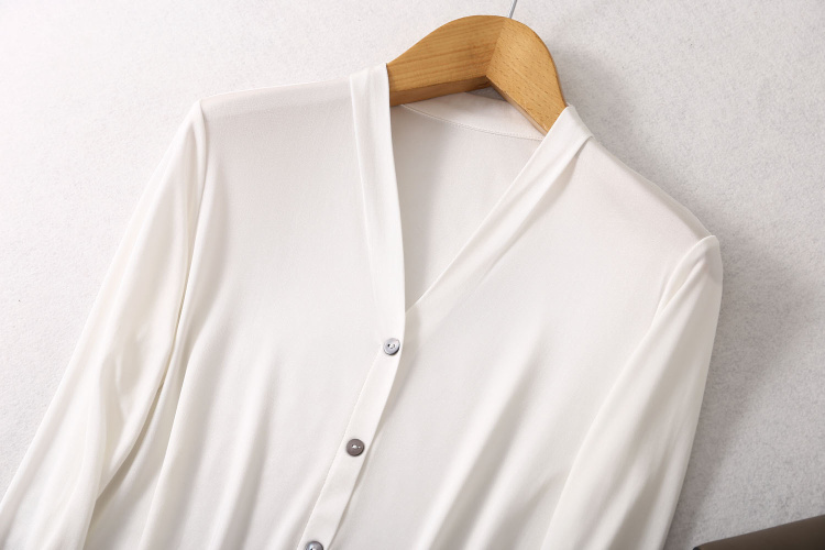 雙面針織桑蠶絲長袖打底衫黑色單排鈕釦外穿V領套頭衫真絲肌底衣