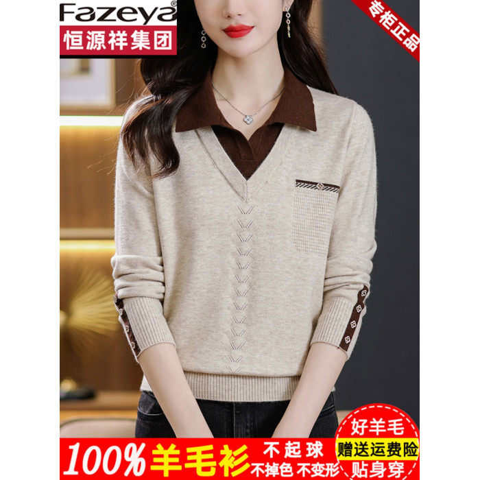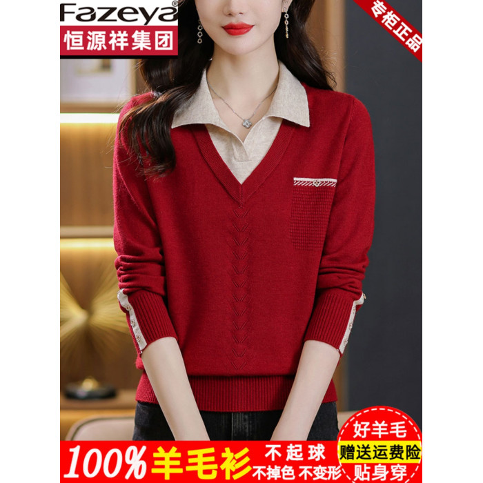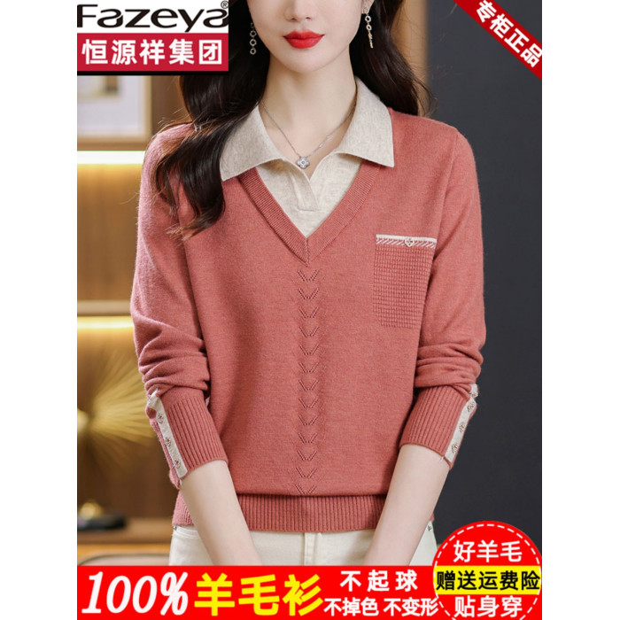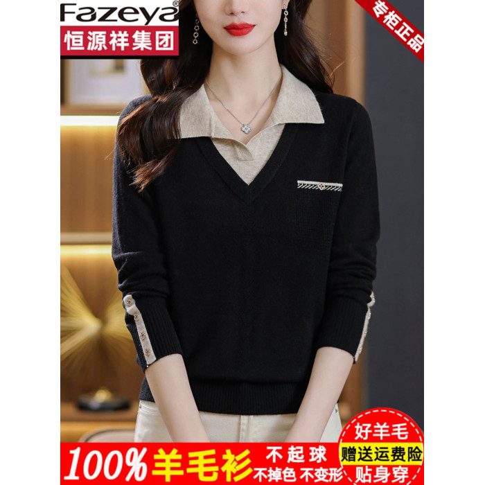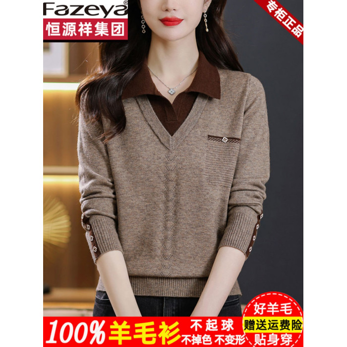 恒源祥集團彩羊翻領假兩件羊毛衫女士毛衣寬松春秋新款羊絨打底衫