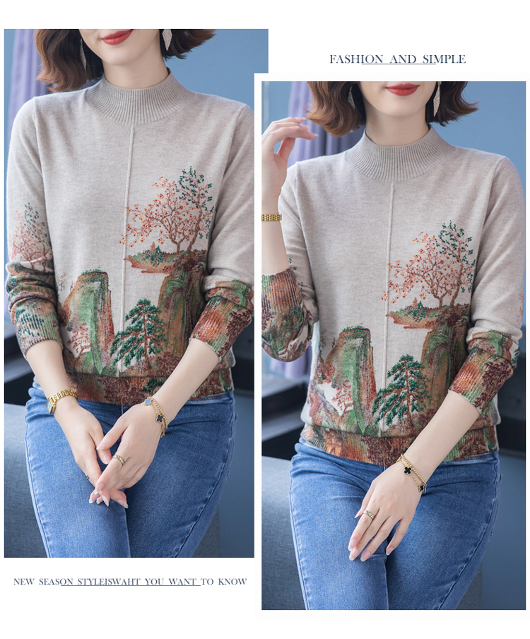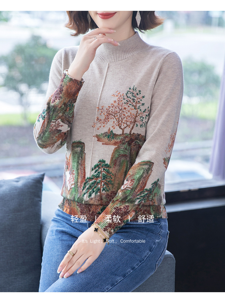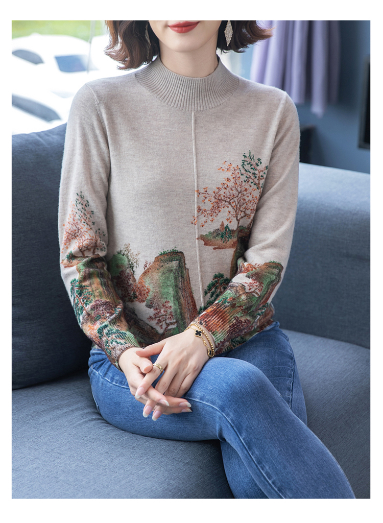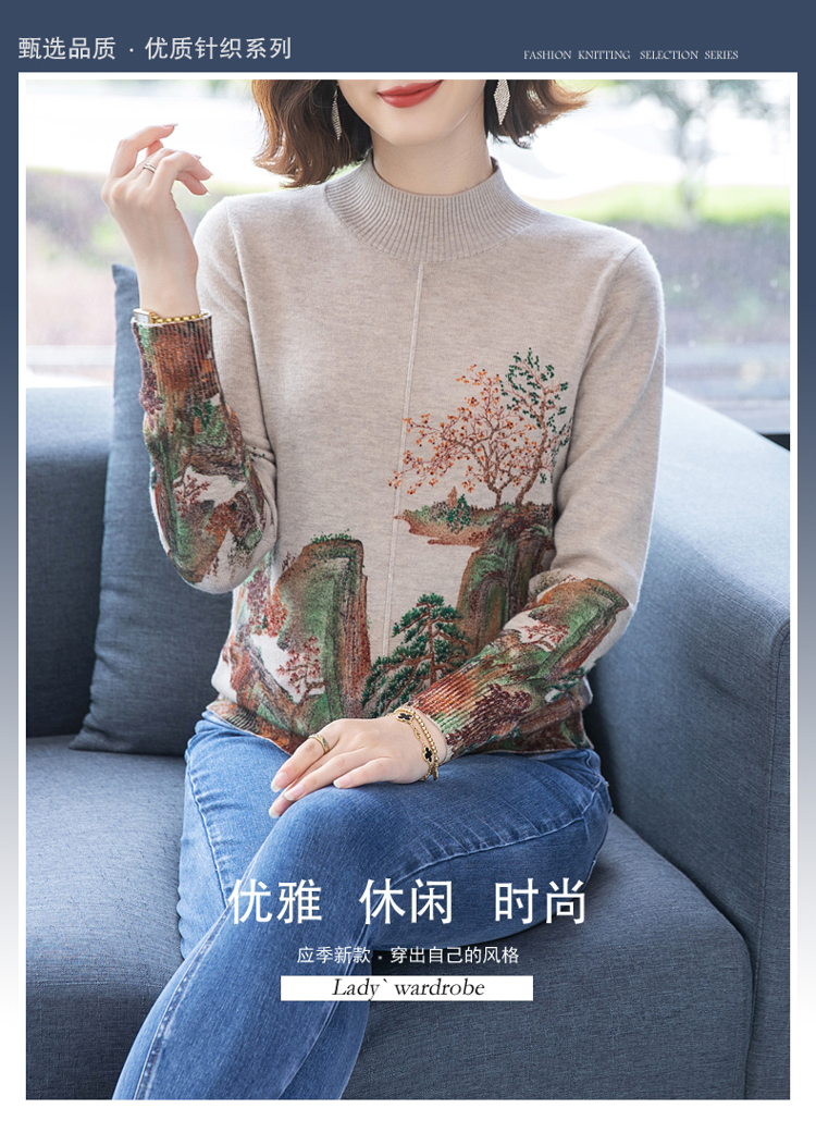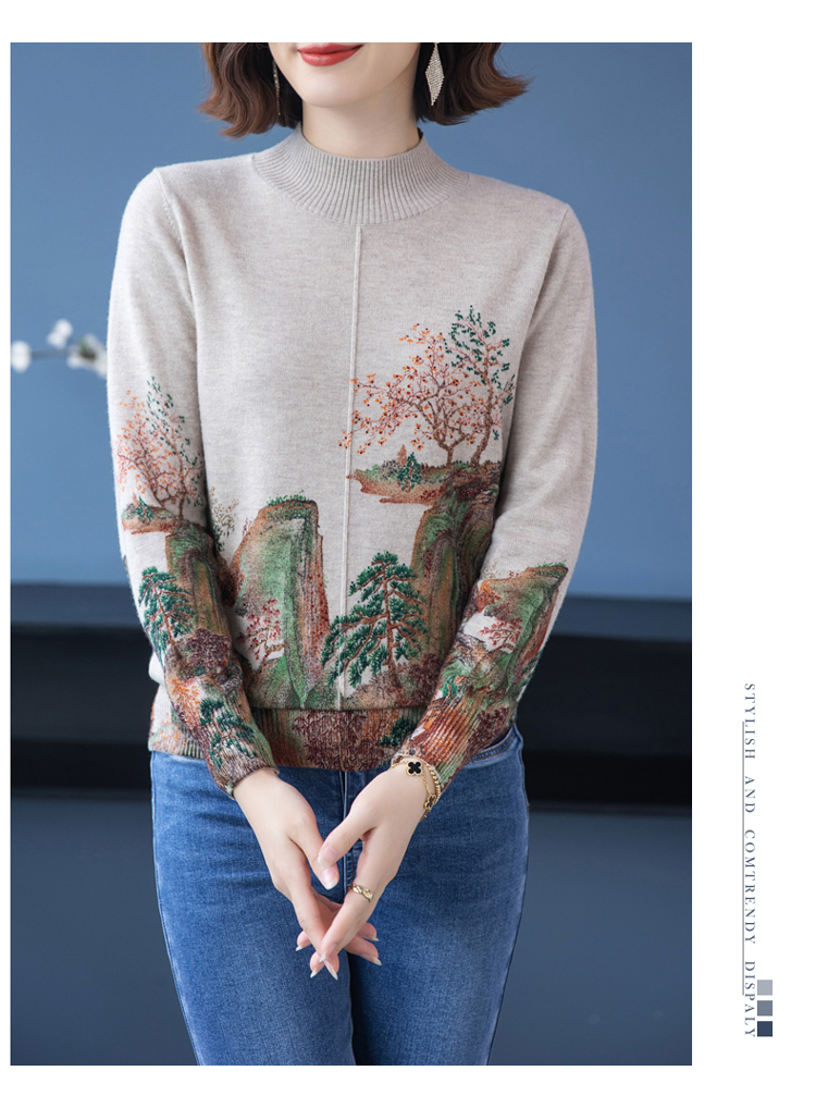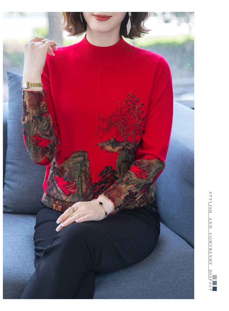 恒源祥媽媽裝羊毛衫女秋冬新款半高領印花寬松毛衣復古洋氣打底衫