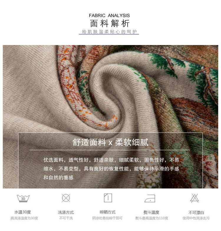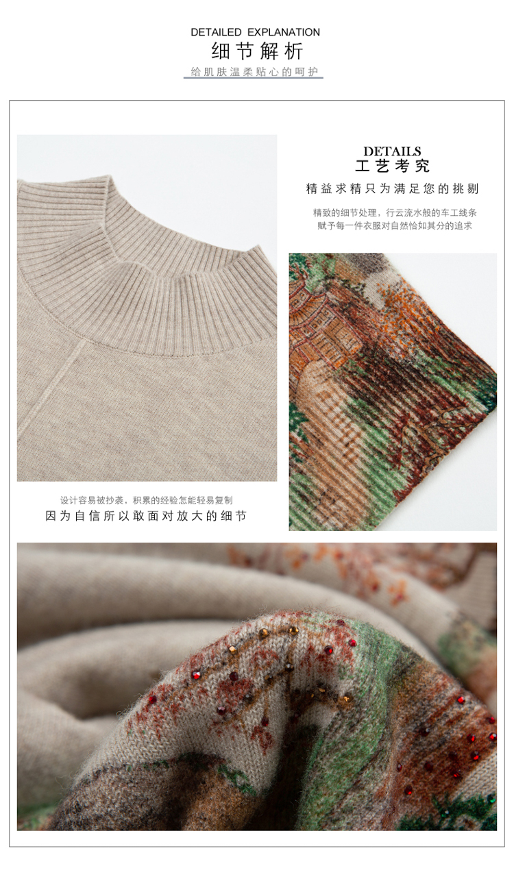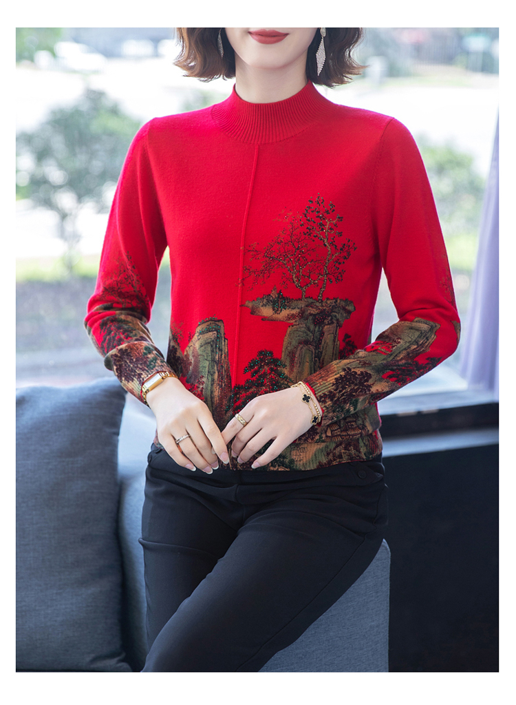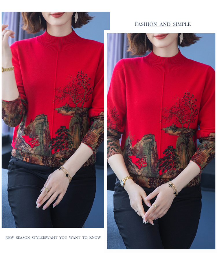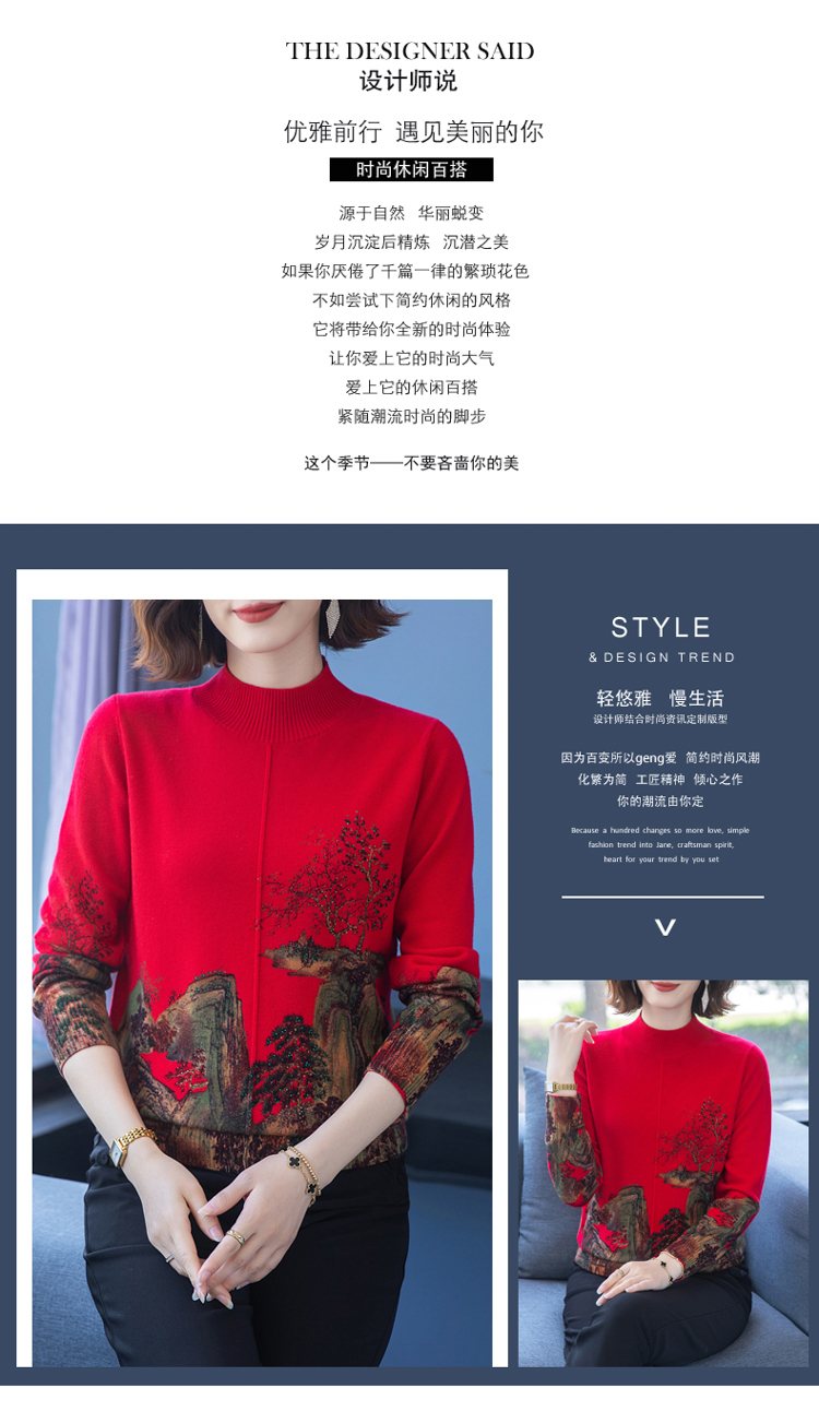 恒源祥媽媽裝羊毛衫女秋冬新款半高領印花寬松毛衣復古洋氣打底衫