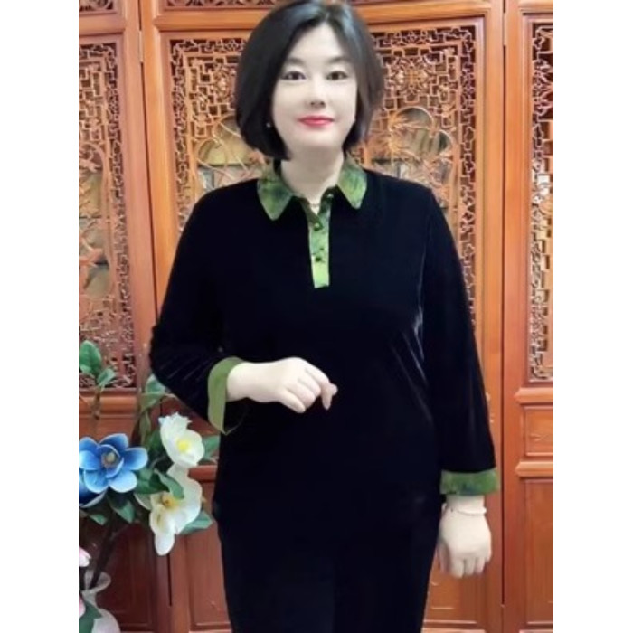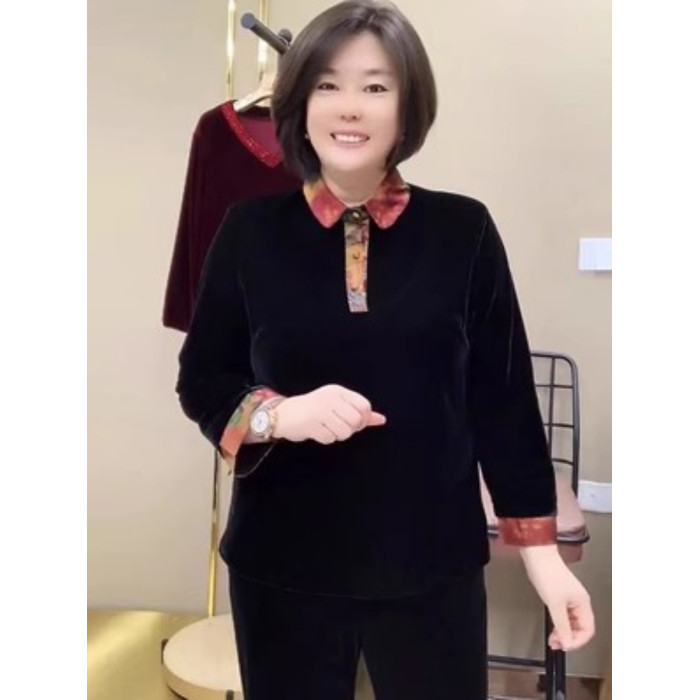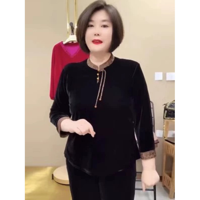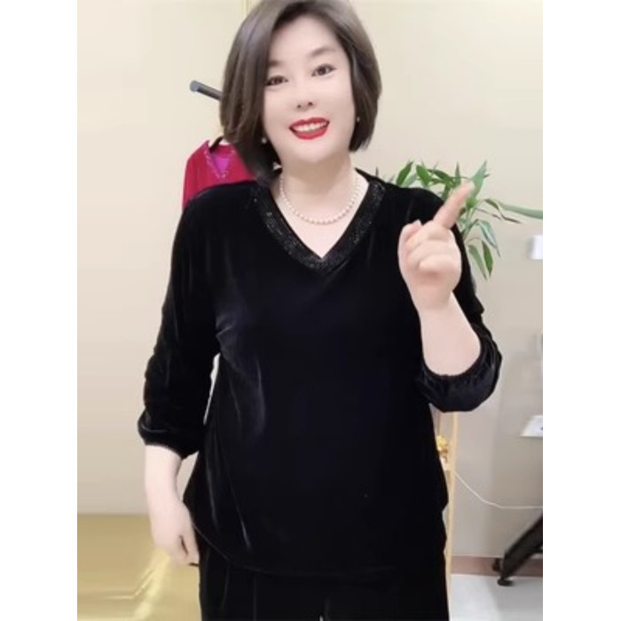 絲絨上衣秋季新款媽媽裝V領燙鑽時尚大碼寬松顯瘦打底衫高檔小衫