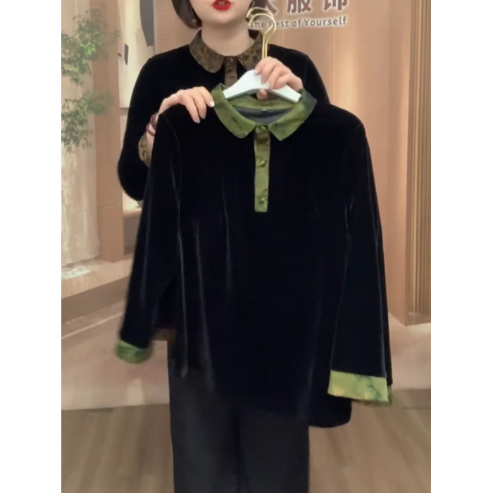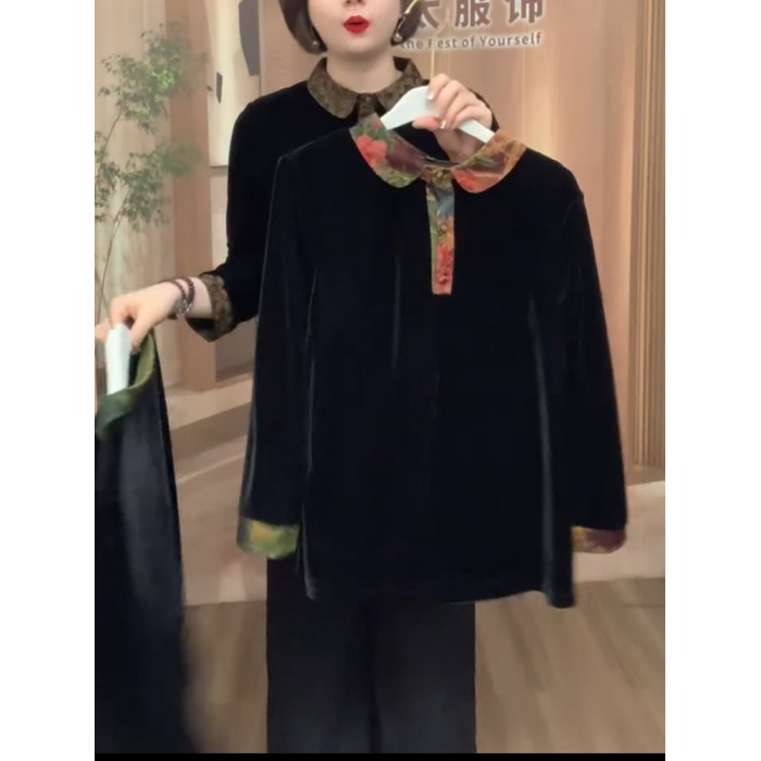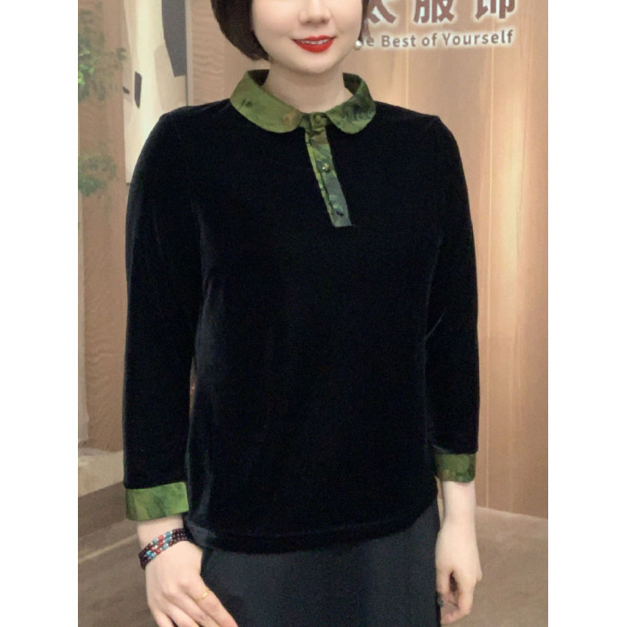 春季新款高檔金絲絨翻領大碼上衣媽媽襯衫顯瘦百搭中式小衫打底衫