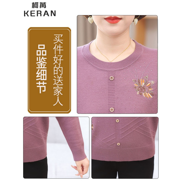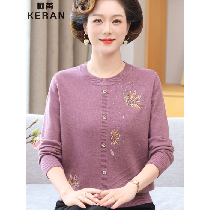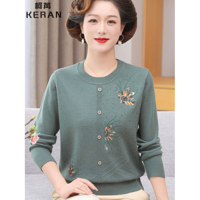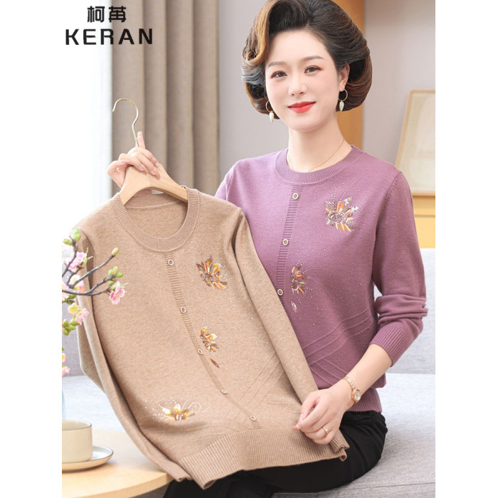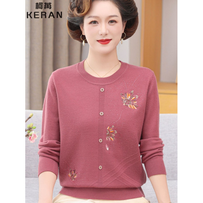 洋氣媽媽秋裝薄款圓領綉花針織衫50嵗60中老年外穿毛衣女打底衫