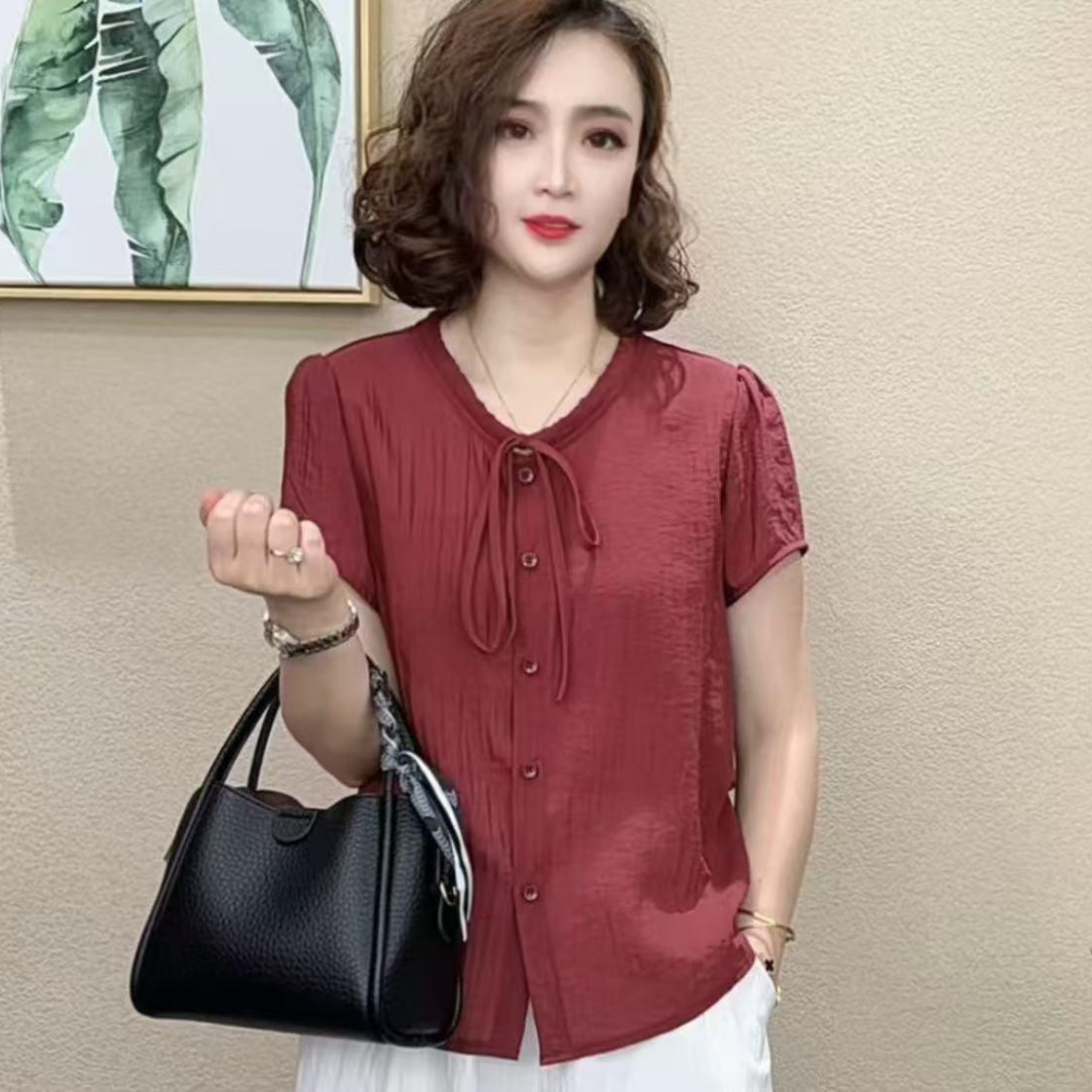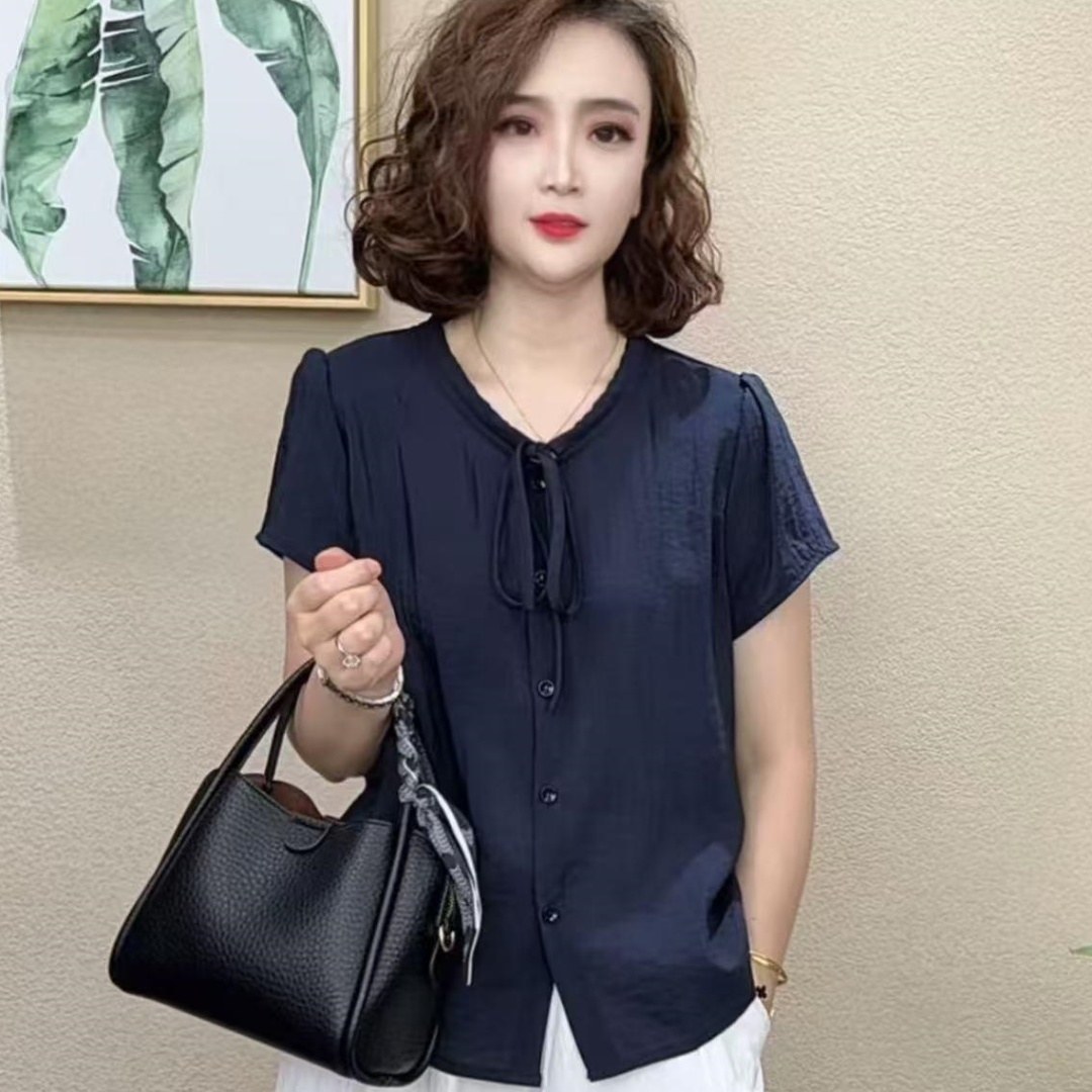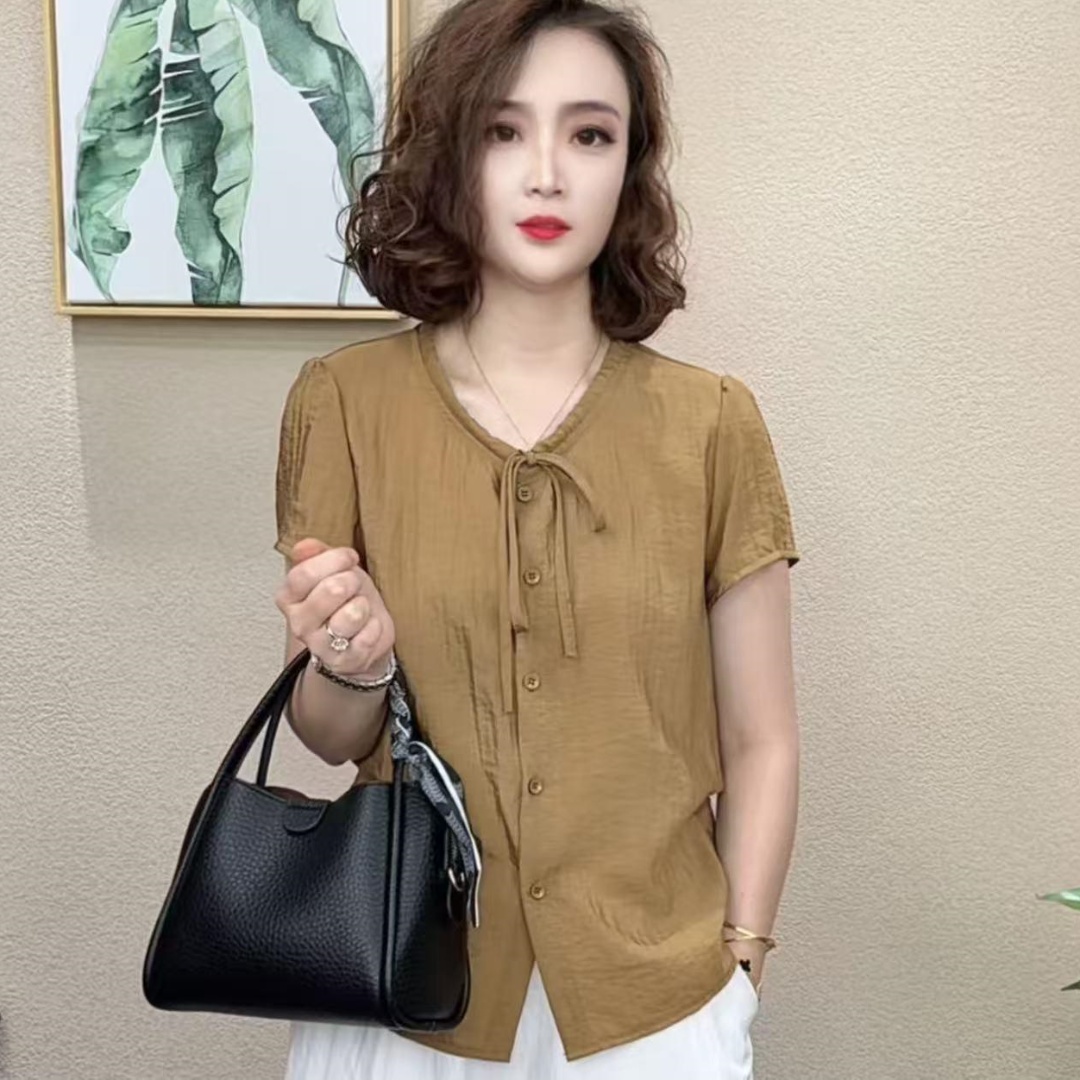洋氣系帶短袖T恤女2025夏季媽媽裝圓領時尚小衫純色減齡寬松上衣