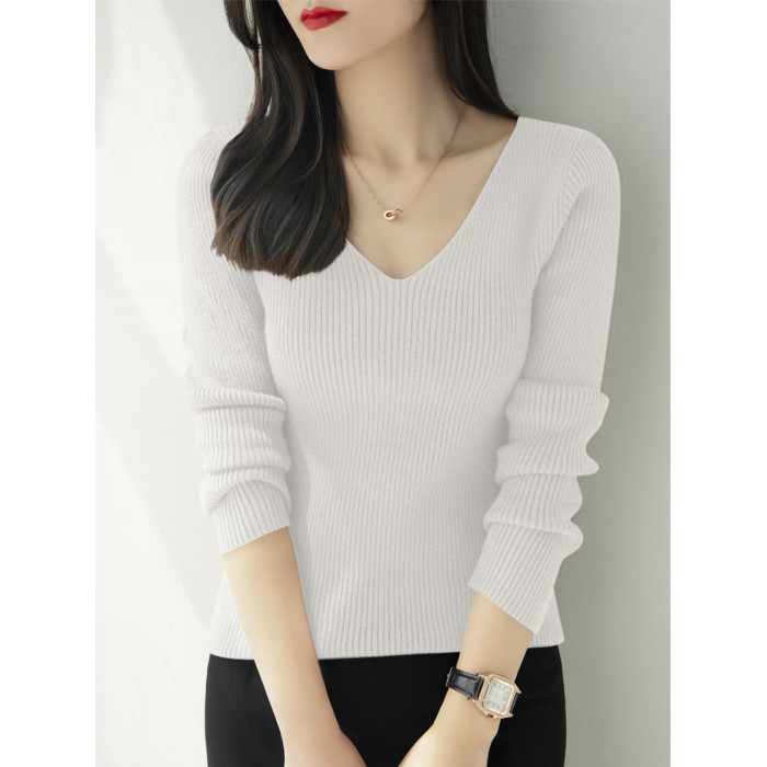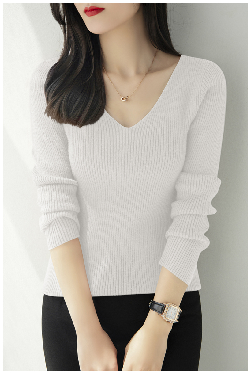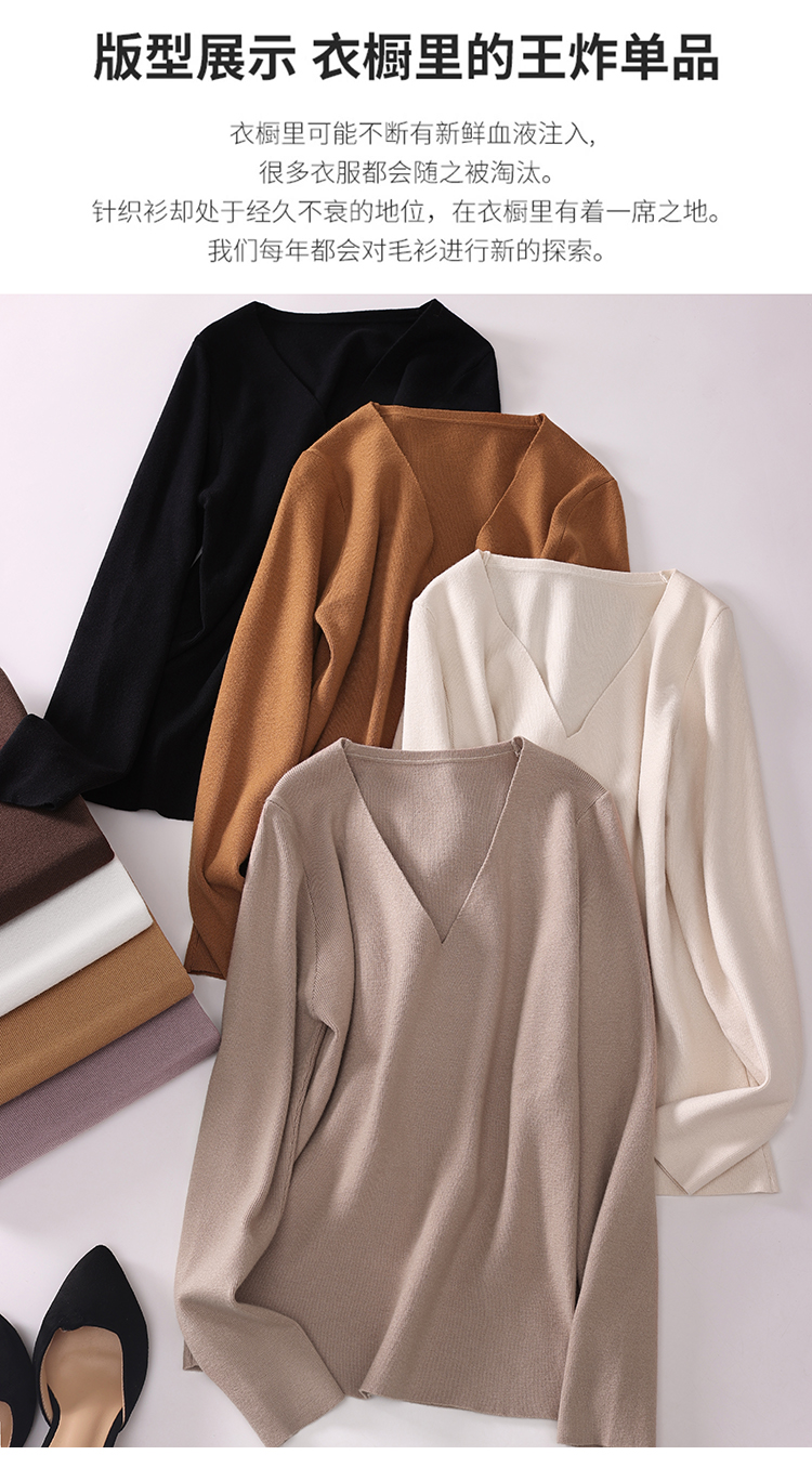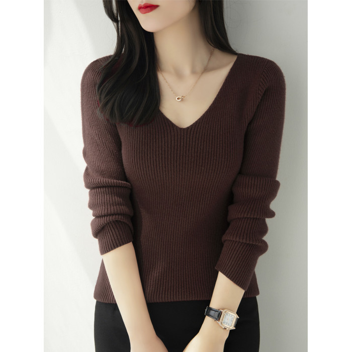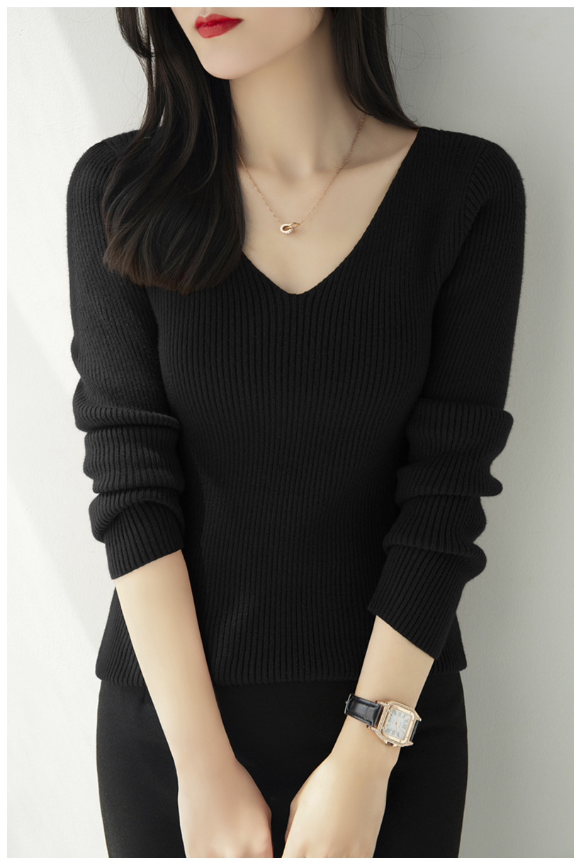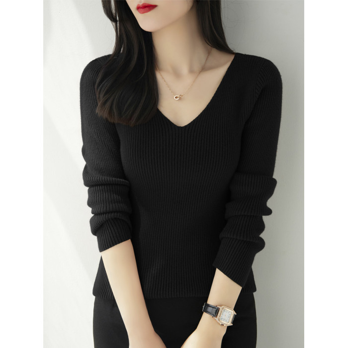 春秋高級感v領簡約長袖內搭打底衫毛衣時尚新款百搭修身針織衫女