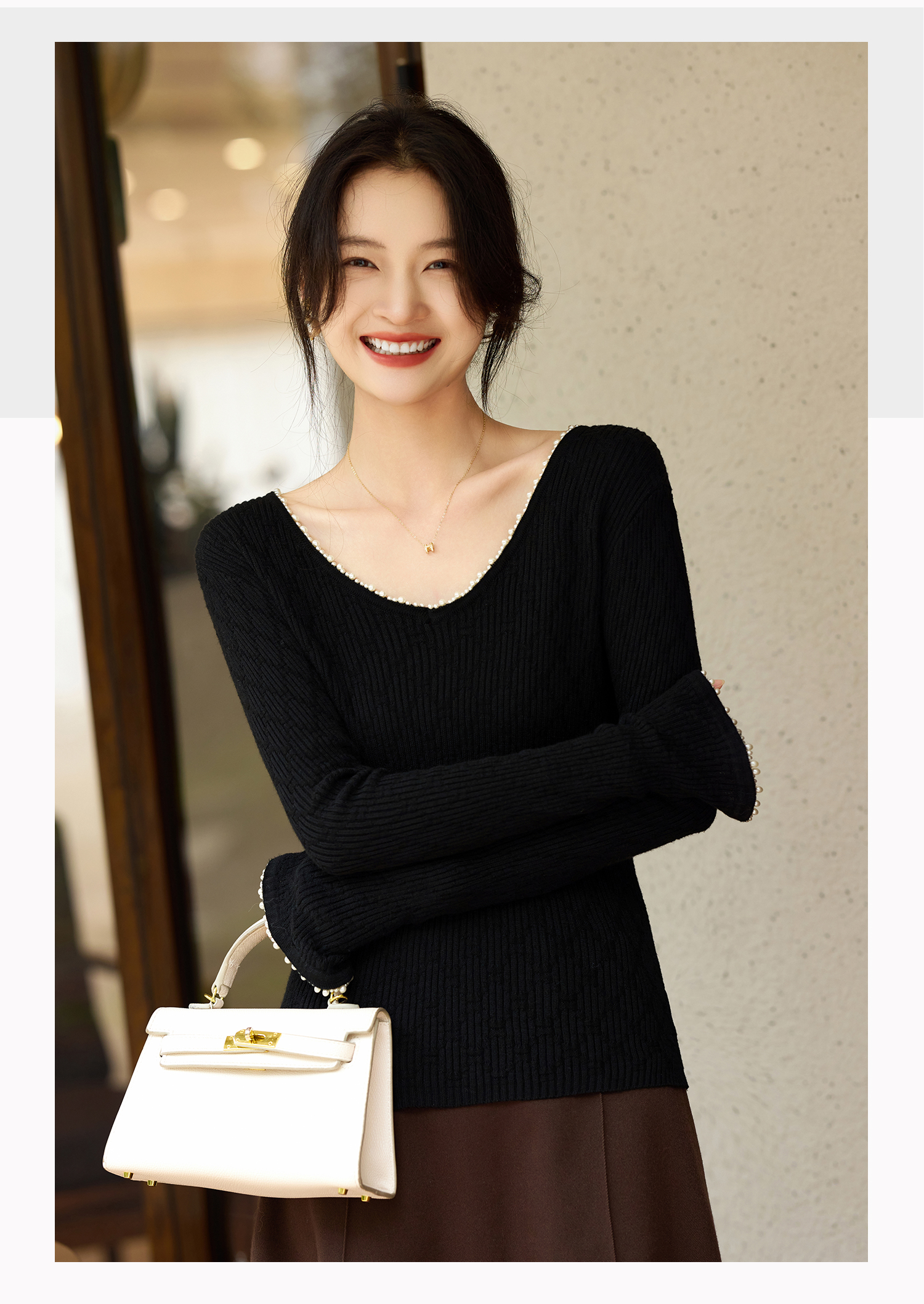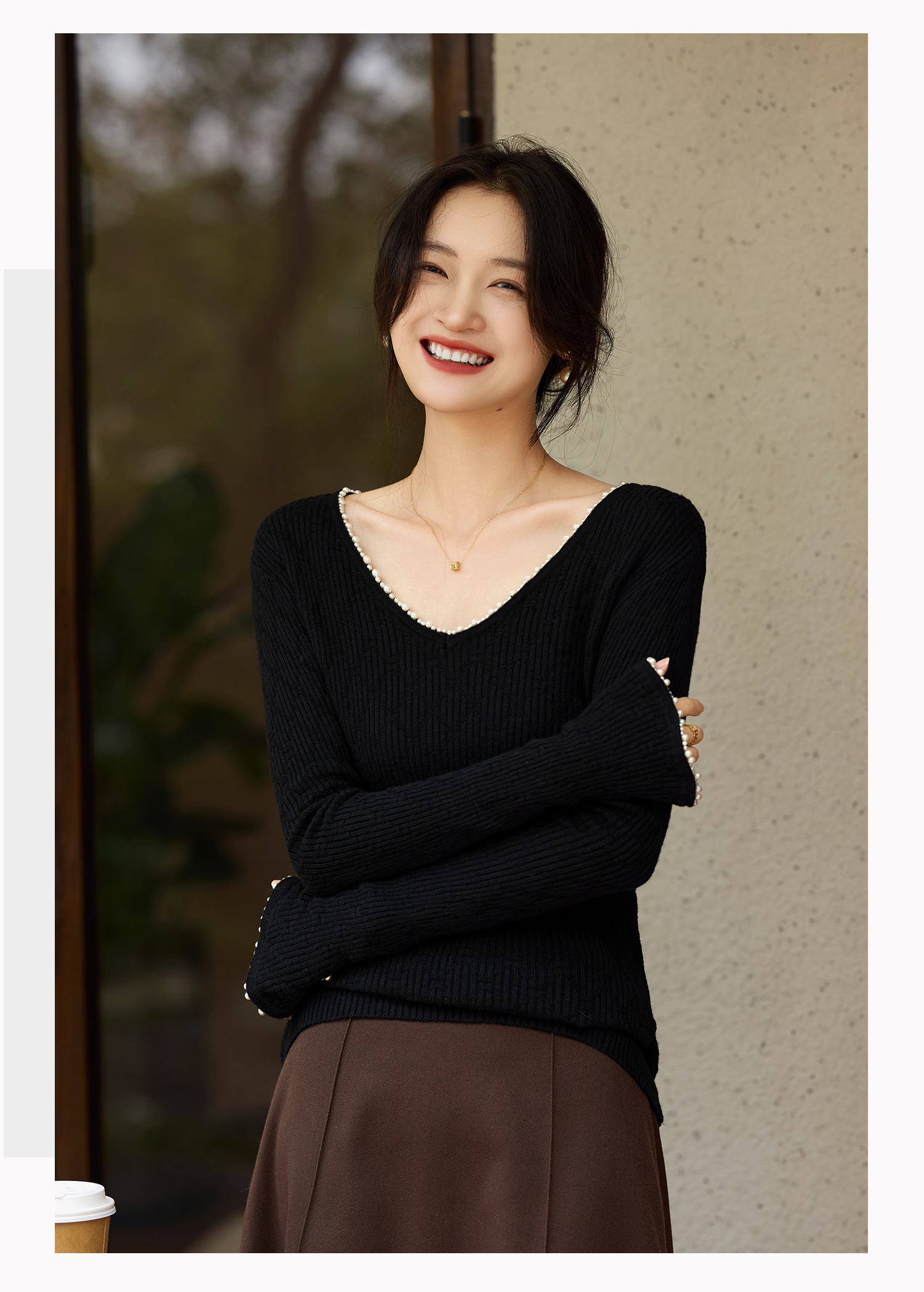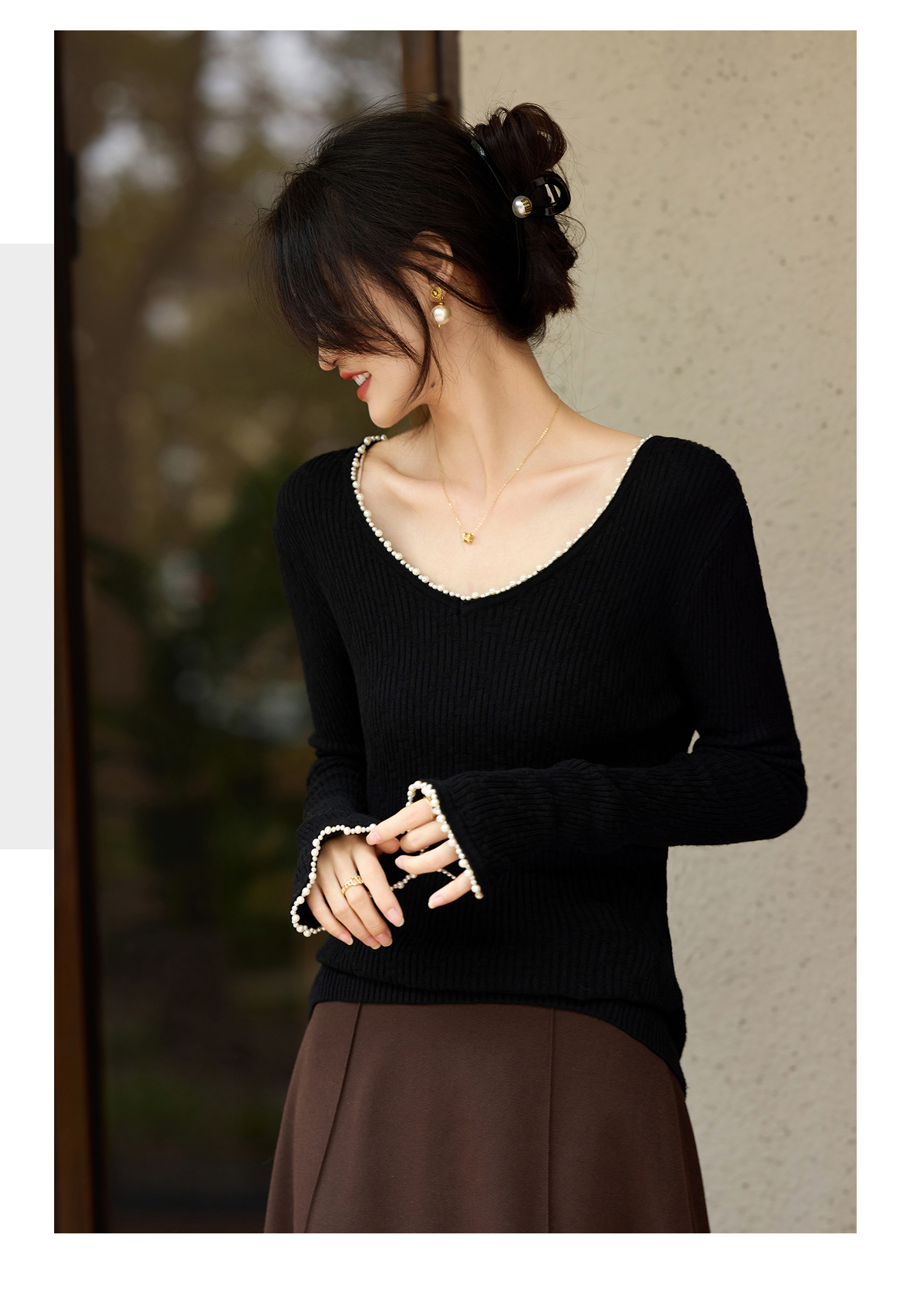 Basic House/百家好黑色喇叭袖珍珠鑲邊v領針織打底衫毛衣女春季