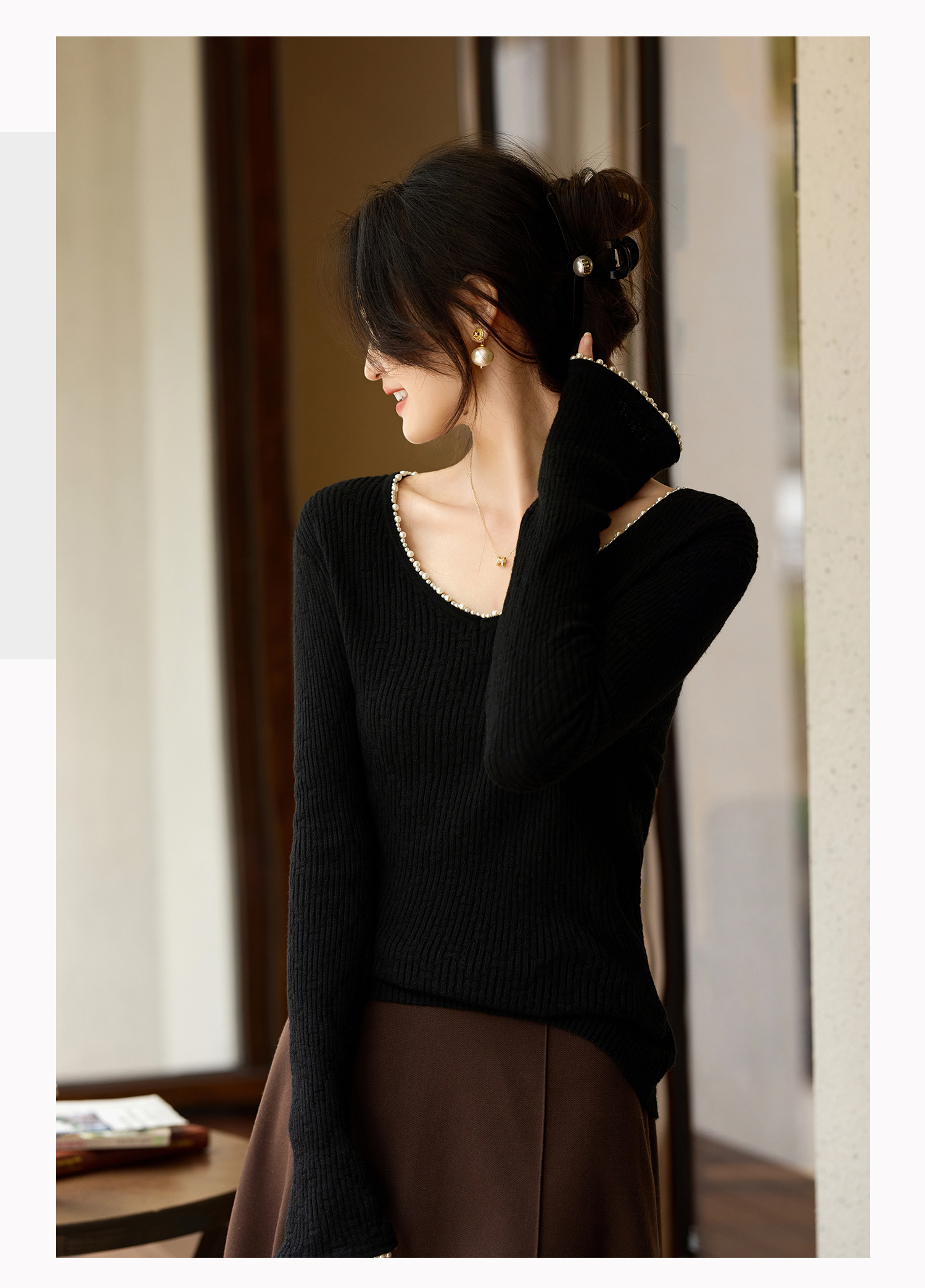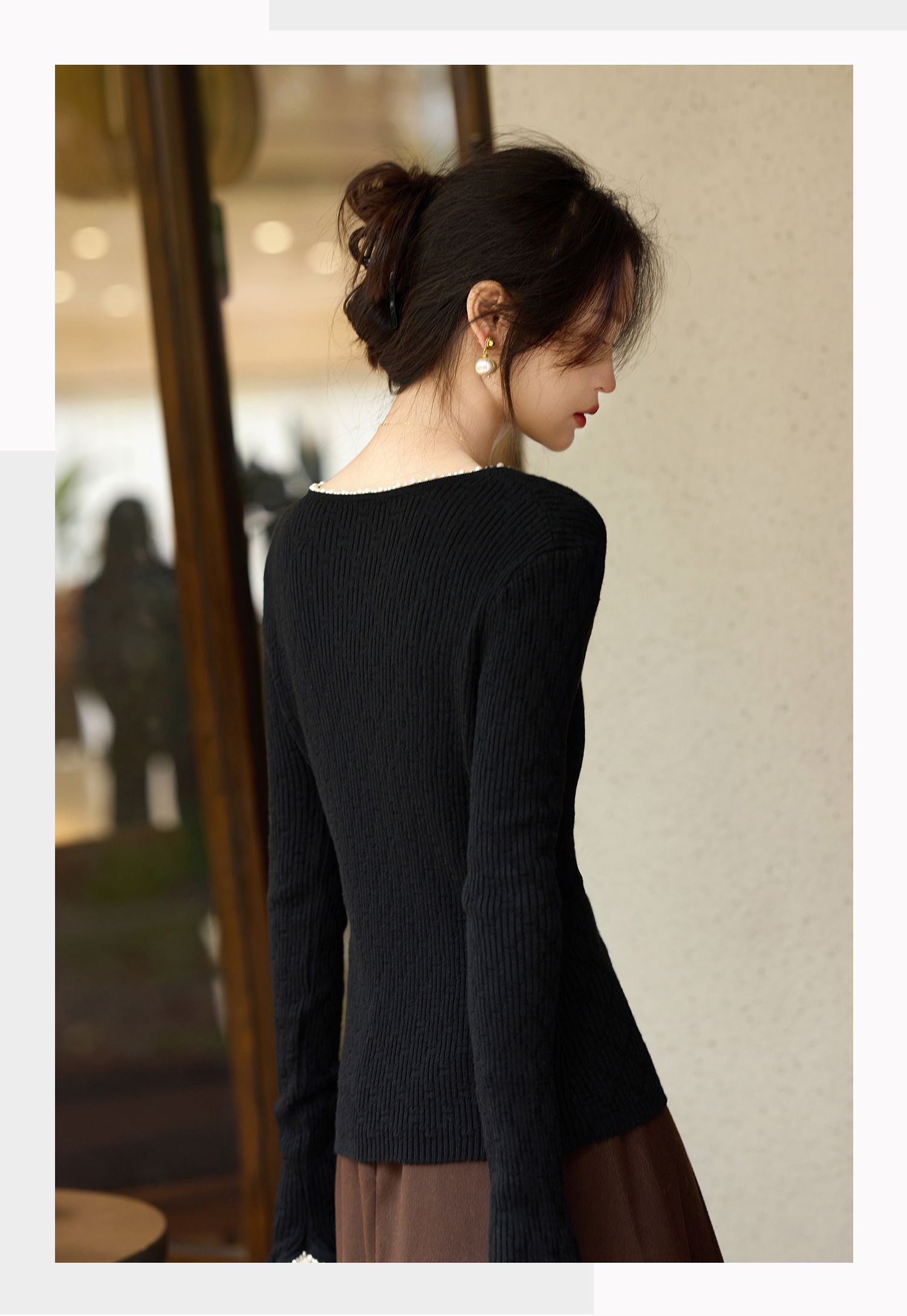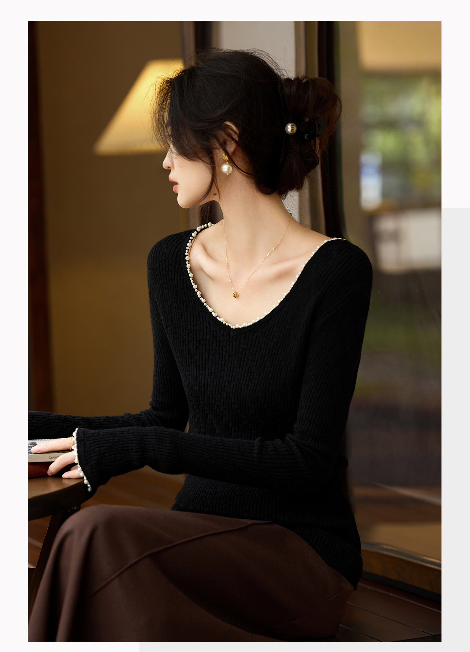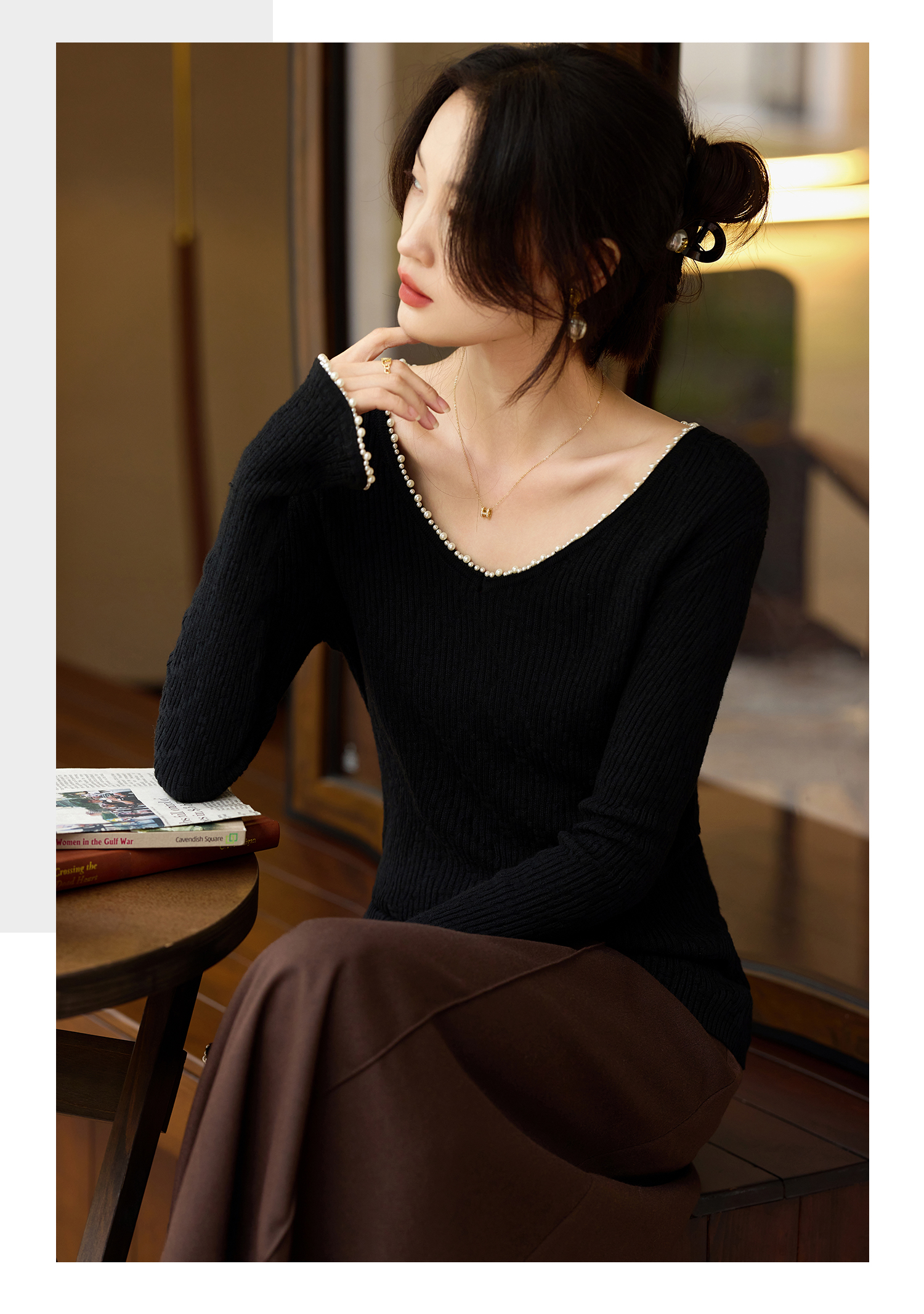 Basic House/百家好黑色喇叭袖珍珠鑲邊v領針織打底衫毛衣女春季