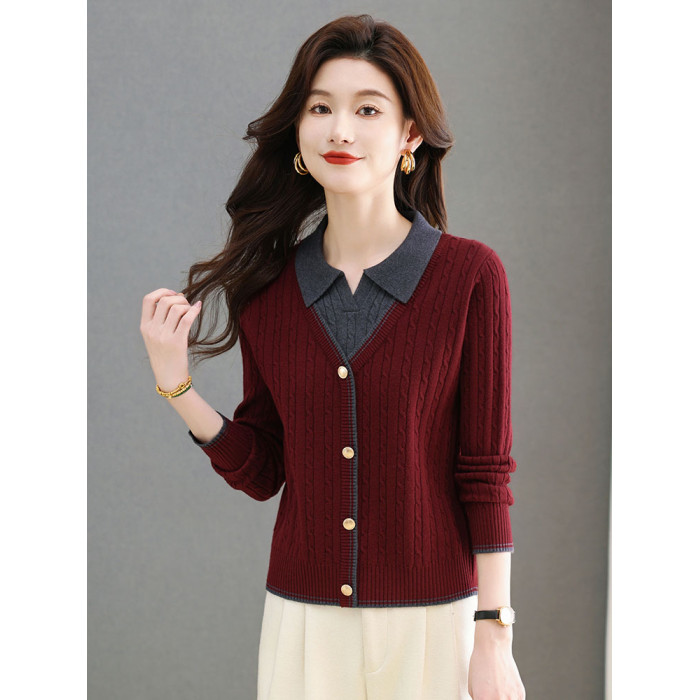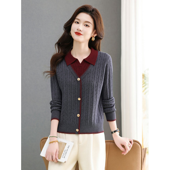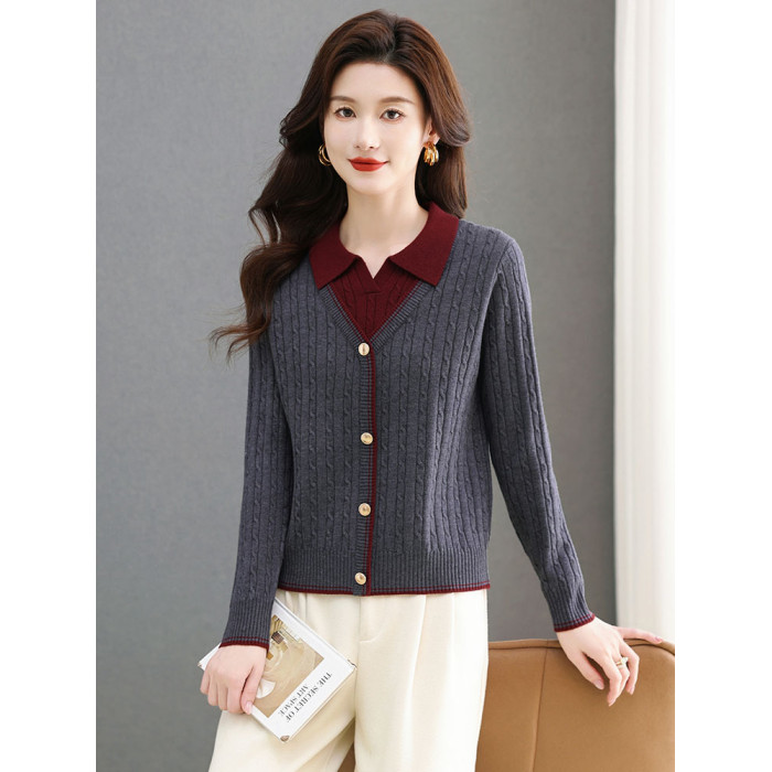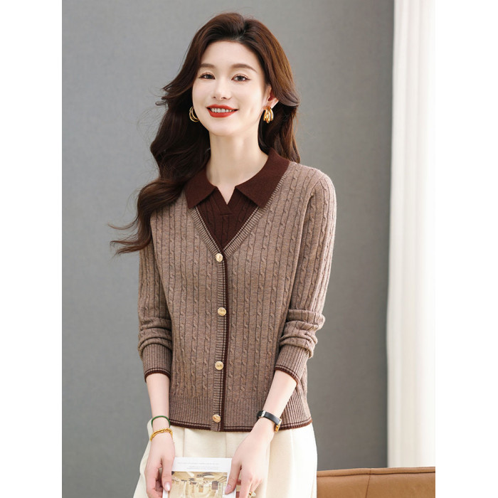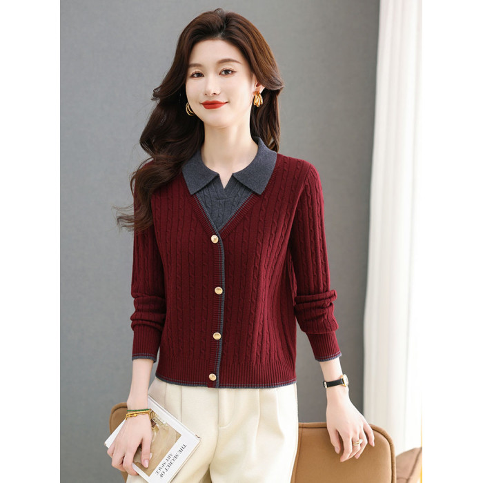 高級品牌秋冬時尚假兩件套頭毛衣女2024爆款洋氣翻領羊毛打底衫