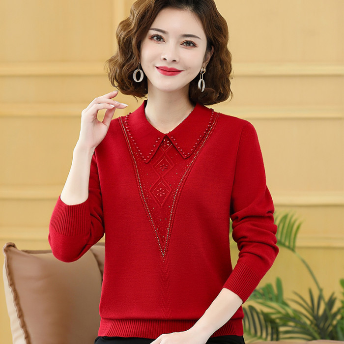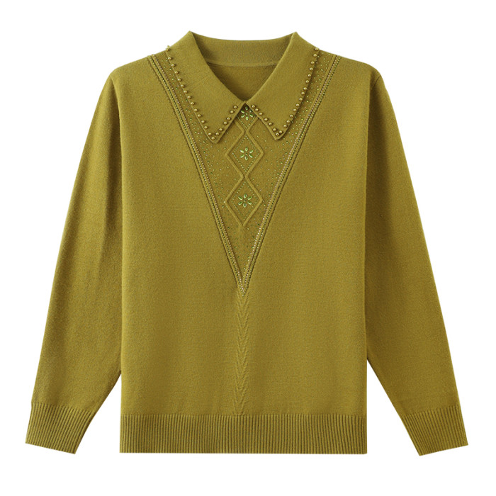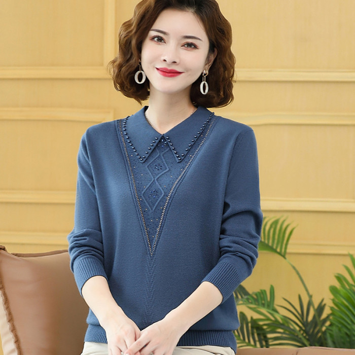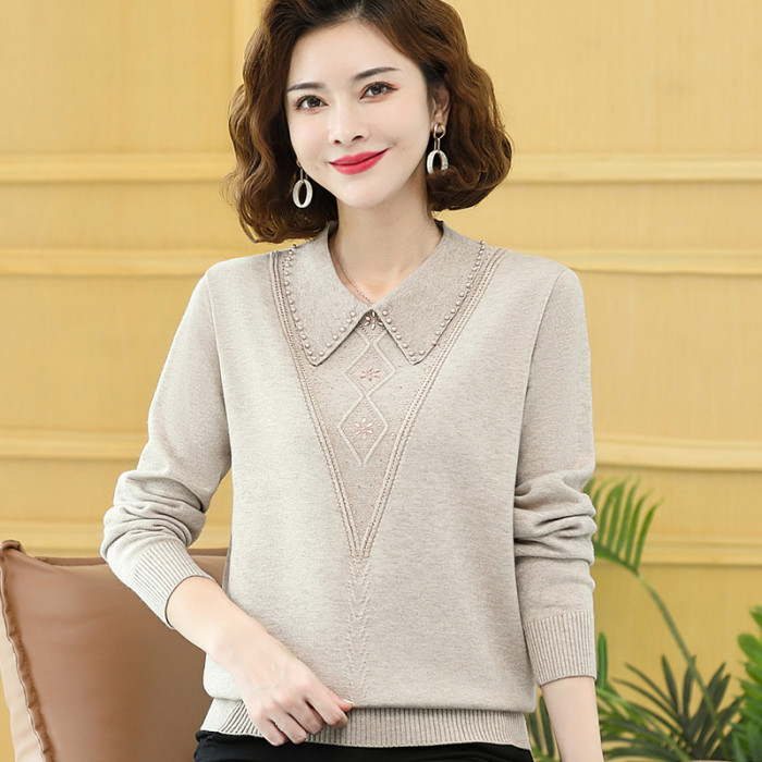 媽媽裝翻領針織打底衫40嵗中年女裝春秋純色上衣洋氣大碼釘珠小衫