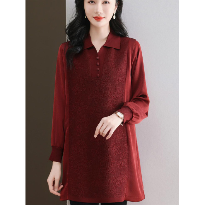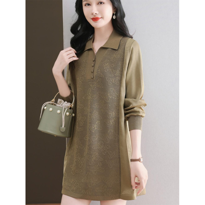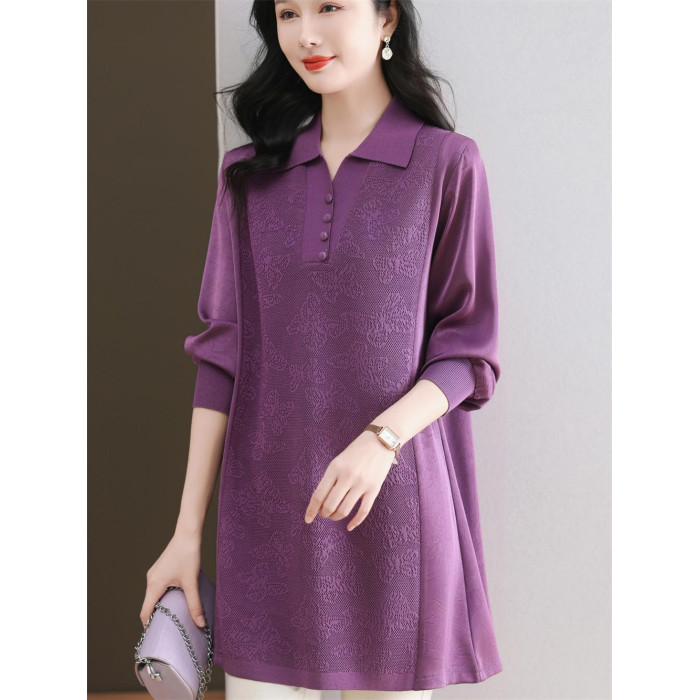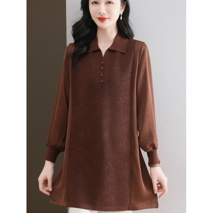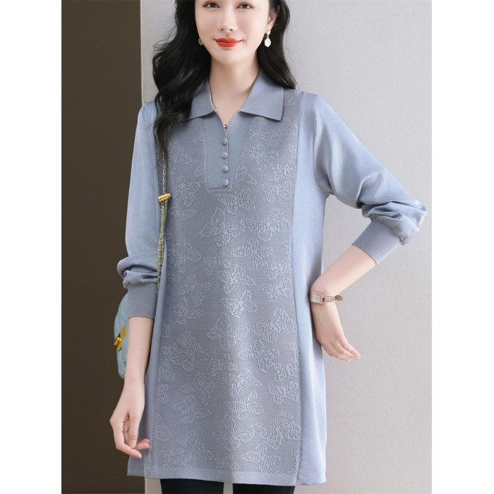 中老年人新款翻領提花中長款打底衫套頭春秋薄上衣雪紡拼接針織衫