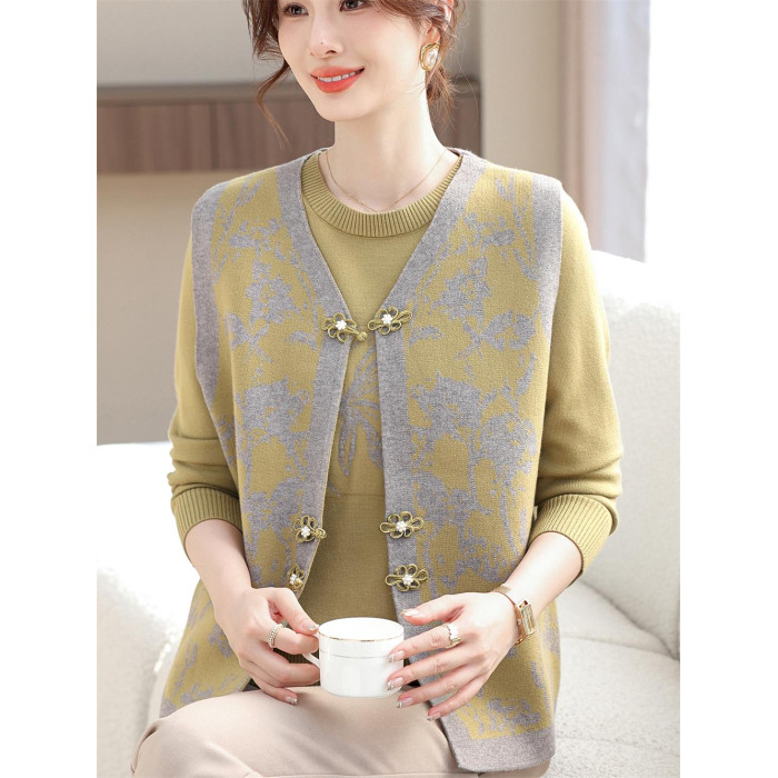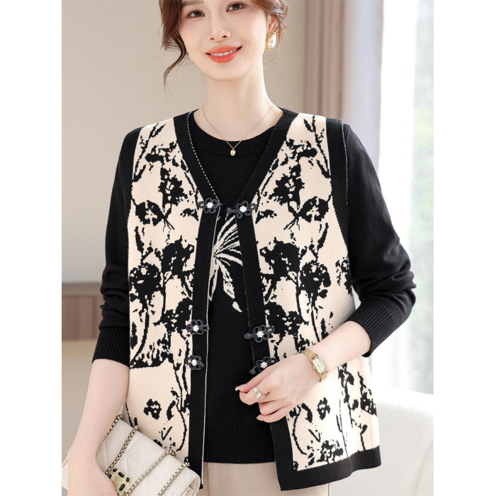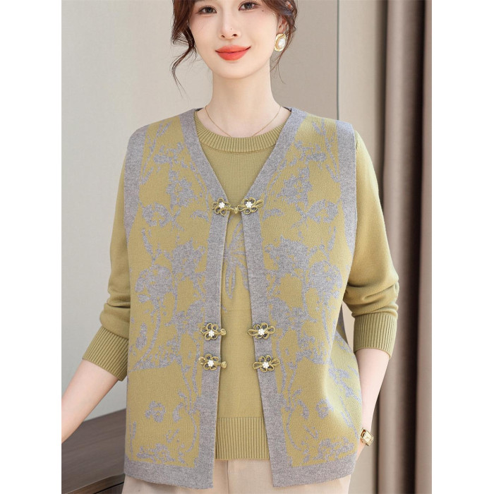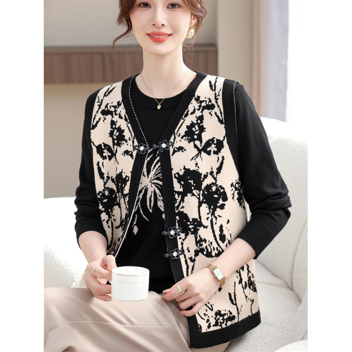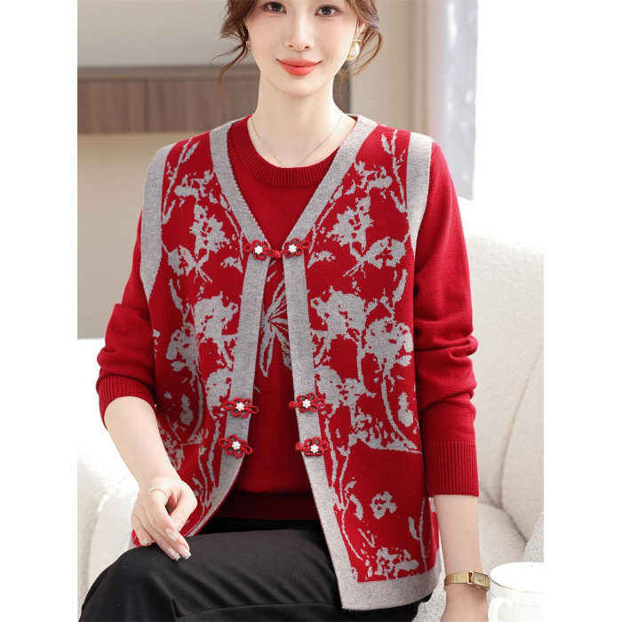 洋氣質媽媽春裝針織兩件套裝打底衫上衣中老年女春夏花色馬甲開衫