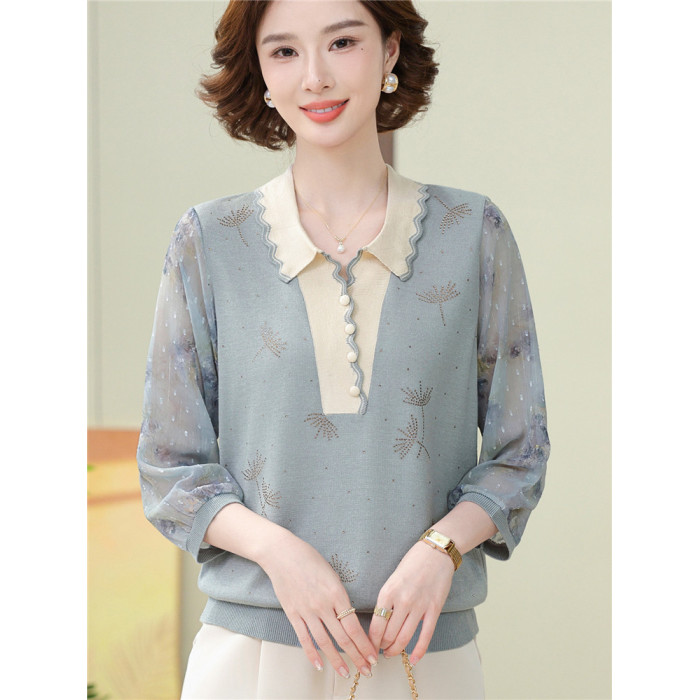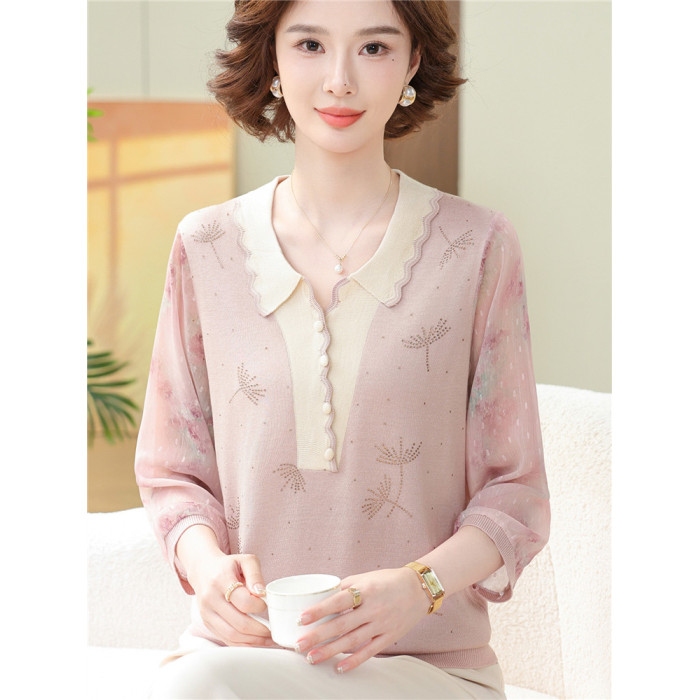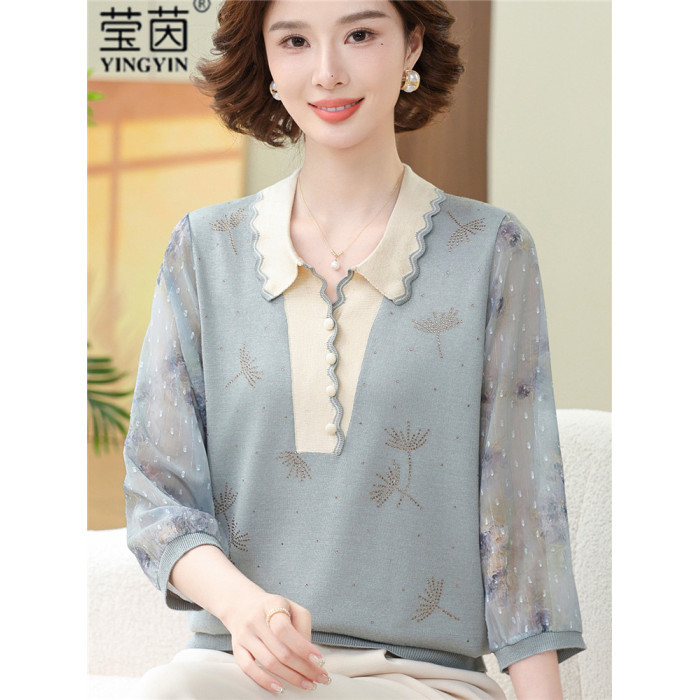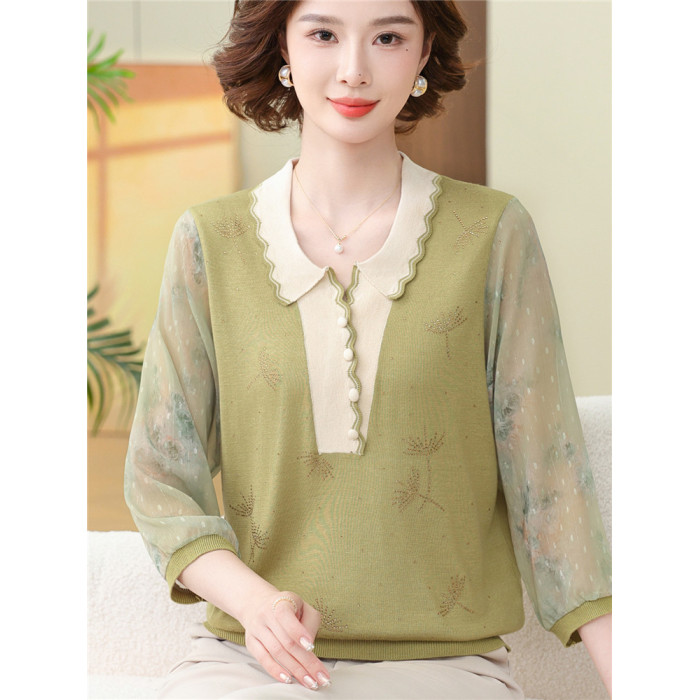 媽媽春裝新款時尚薄款紗袖上衣中老年女夏季洋氣七分袖針織打底衫