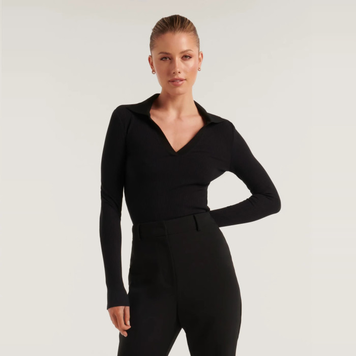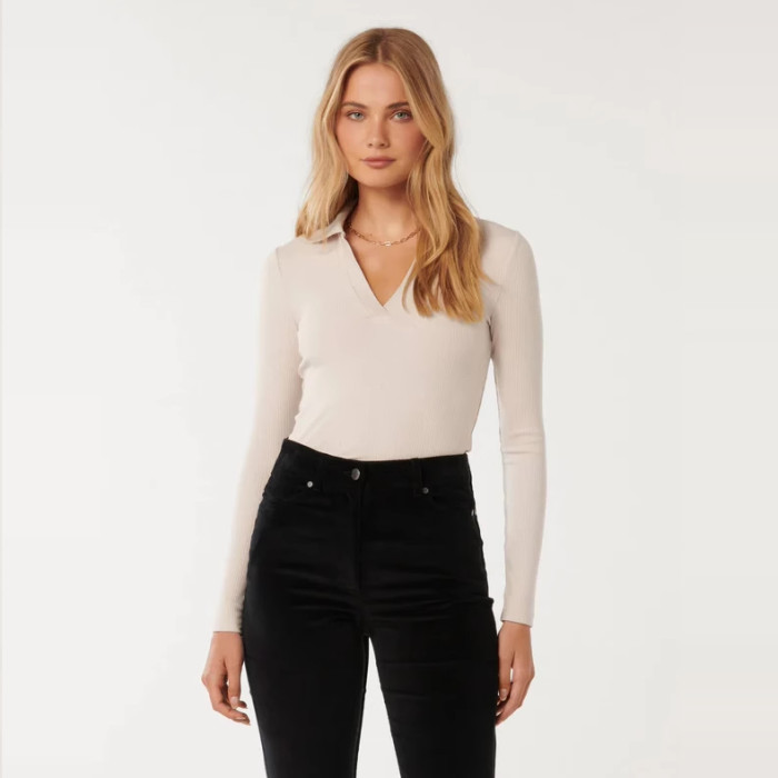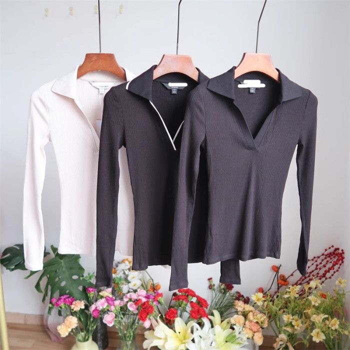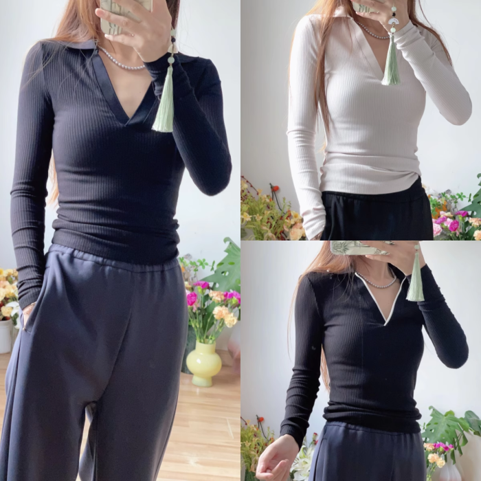 FN純元 坑條顯瘦針織衫 翻邊V領打底衫 微壓收腰長袖上衣 3色
