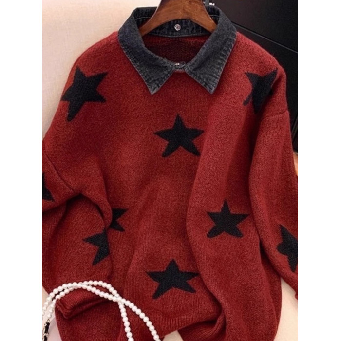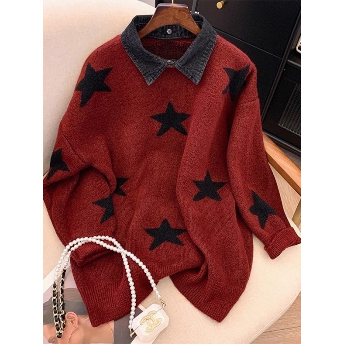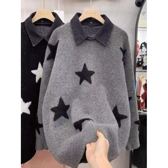 假兩件牛仔領毛衣女裝秋冬季高中初中學生大童加絨加厚針織打底衫