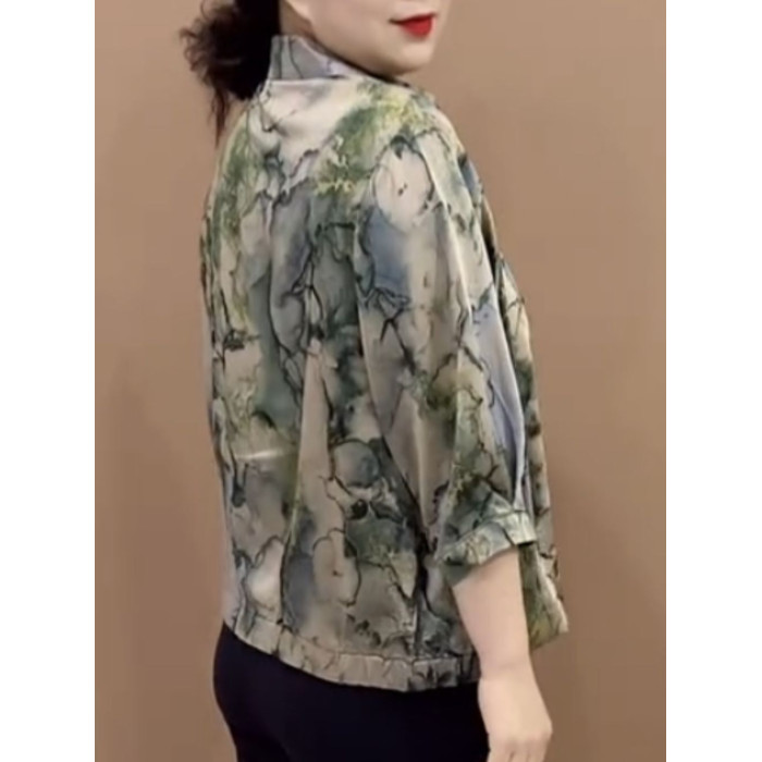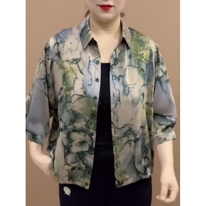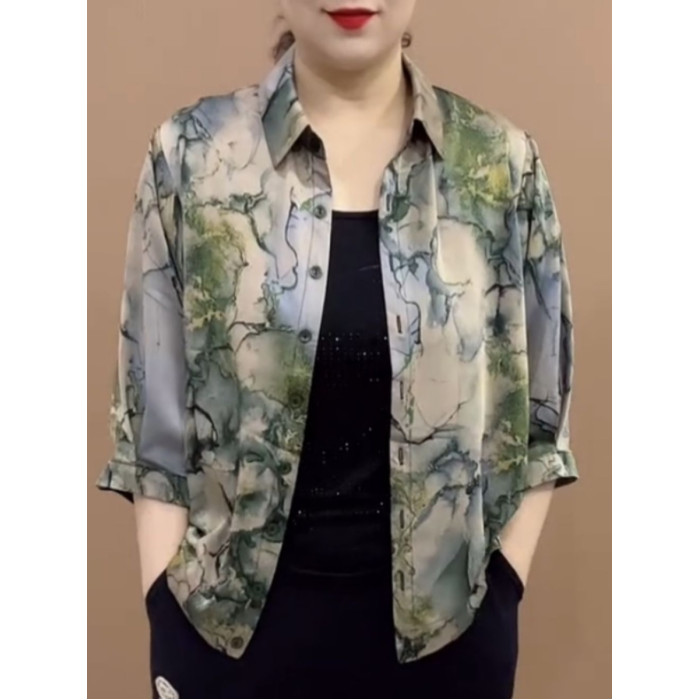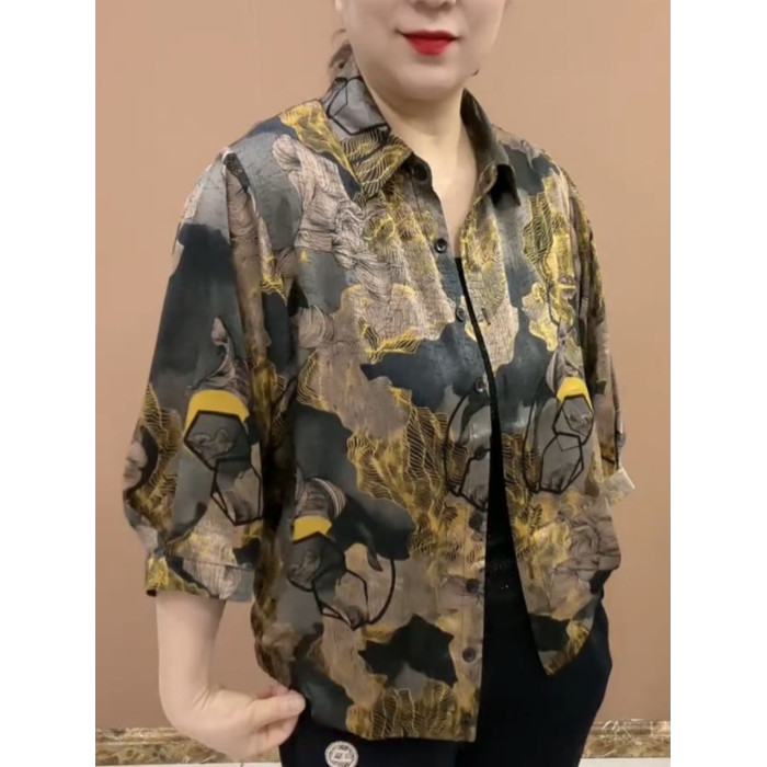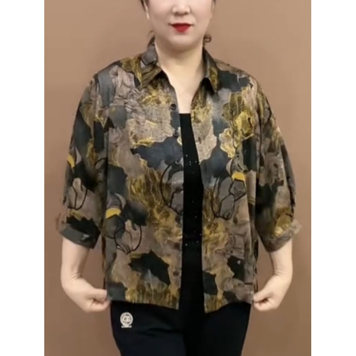夏季中老年寬松小衫印花翻領襯衫媽媽裝顯瘦打底衫大碼七分袖開衫