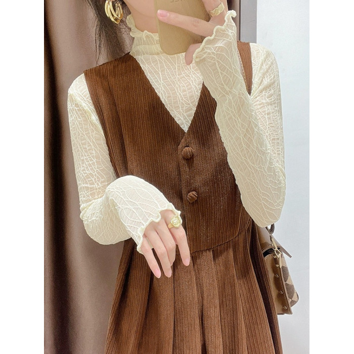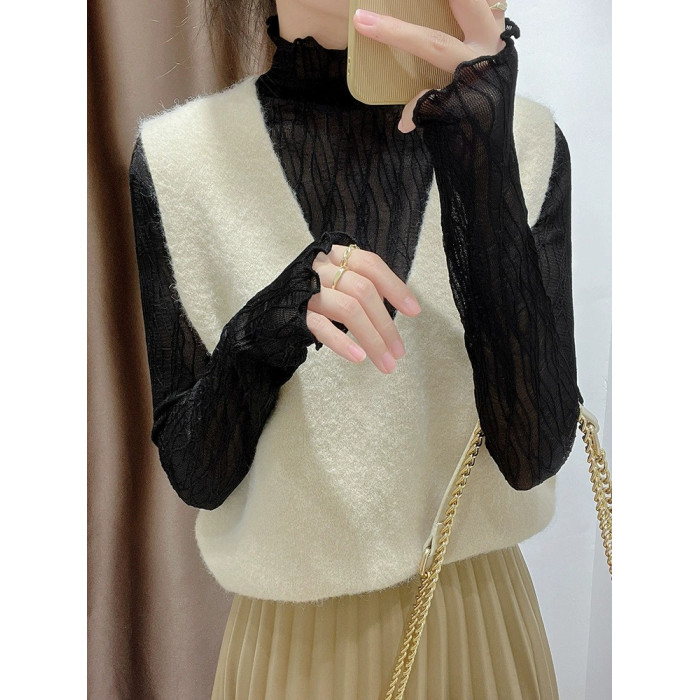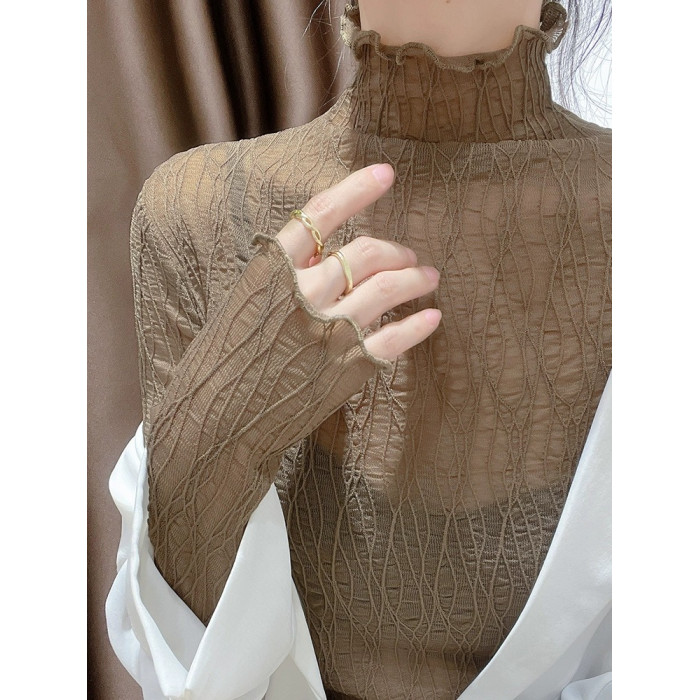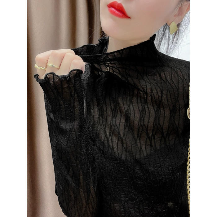 BEBE NOBLE荷葉邊網紗打底衫女秋冬季配毛衣紗衣內搭長袖蕾絲上衣