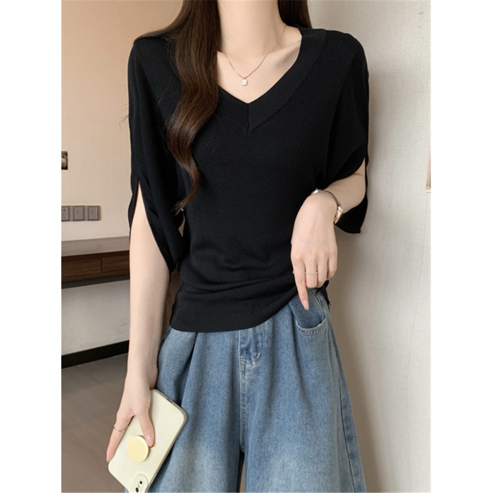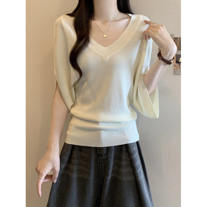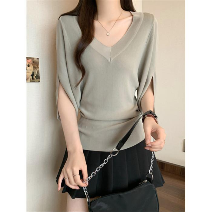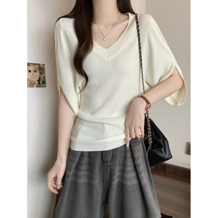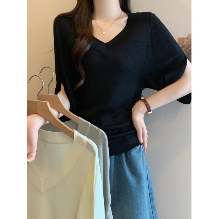 大碼胖mm設計感遮肚顯瘦v領蝙蝠袖上衣女夏季洋氣減齡短袖打底衫