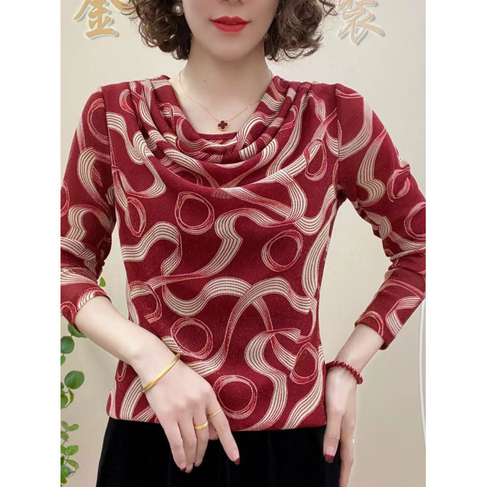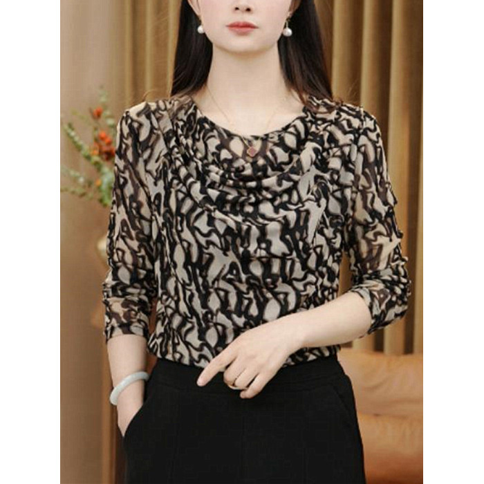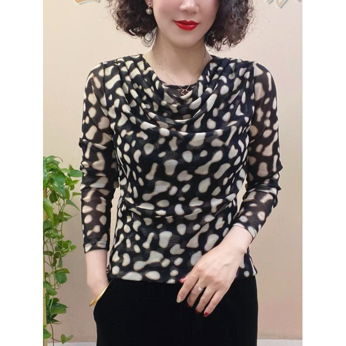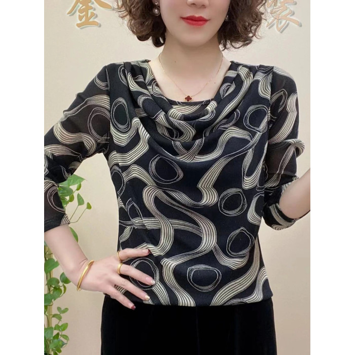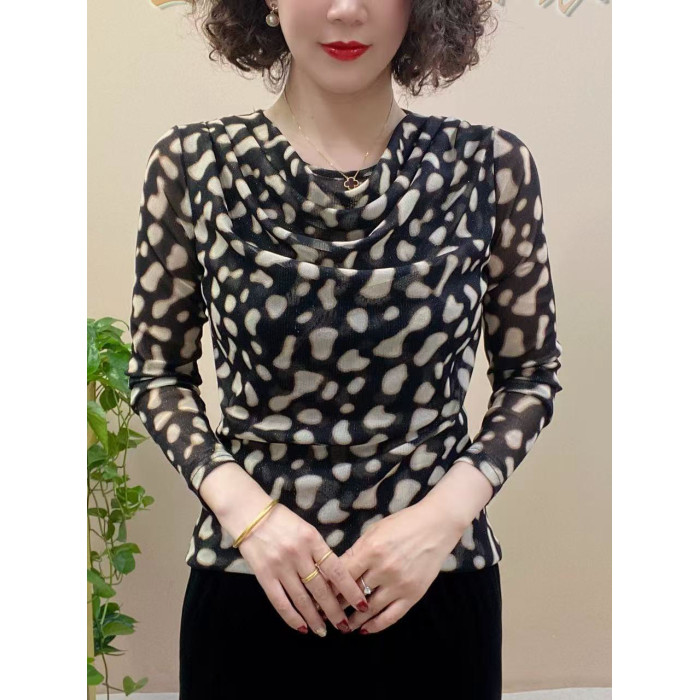 春秋兜兜領長袖彈力網紗薄福祿打底衫水珠扭條字母印花時尚中年女