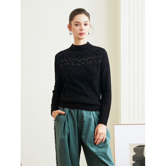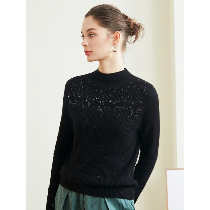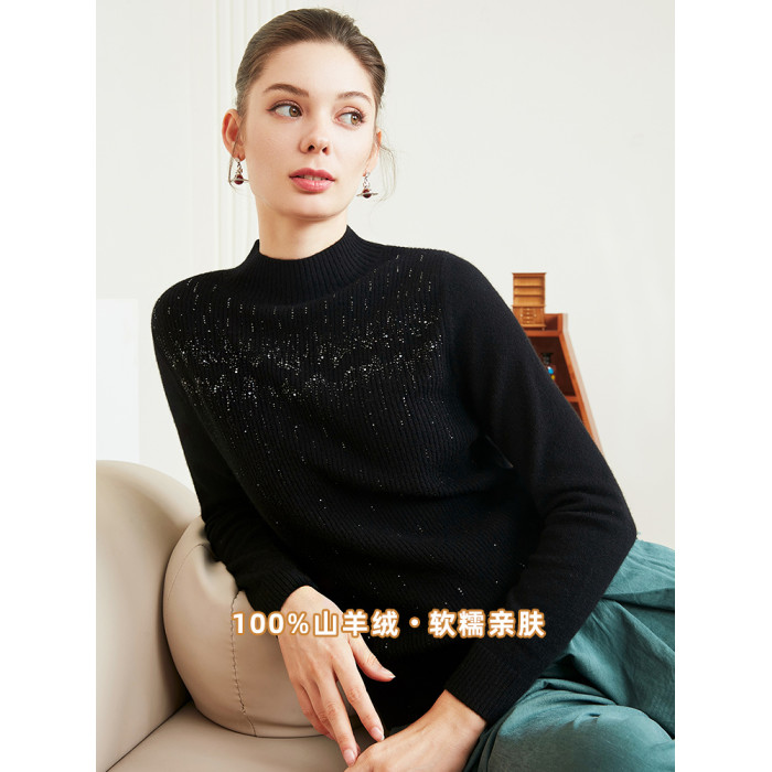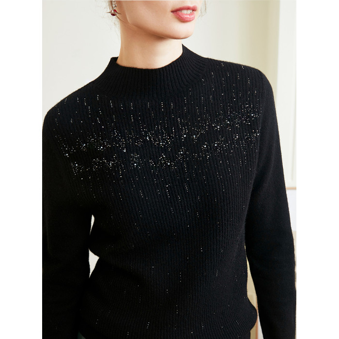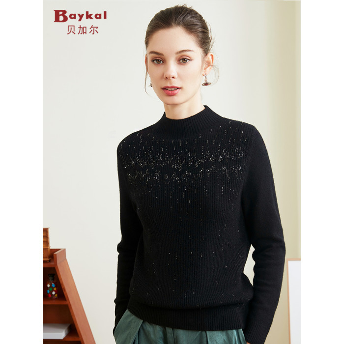 貝加爾秋冬黑色保暖打底衫簡約水鑽修身顯瘦長袖純羊絨針織衫
