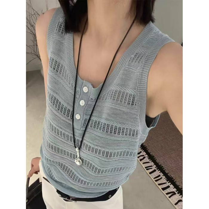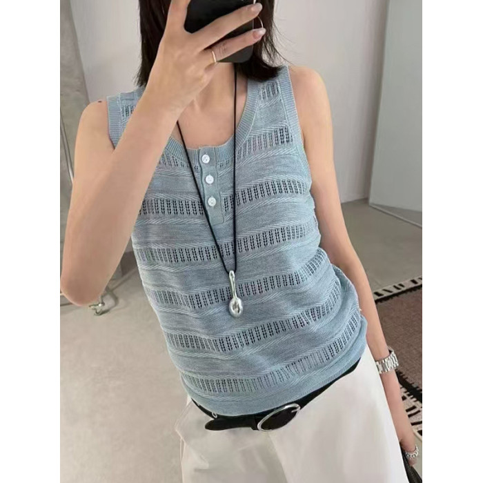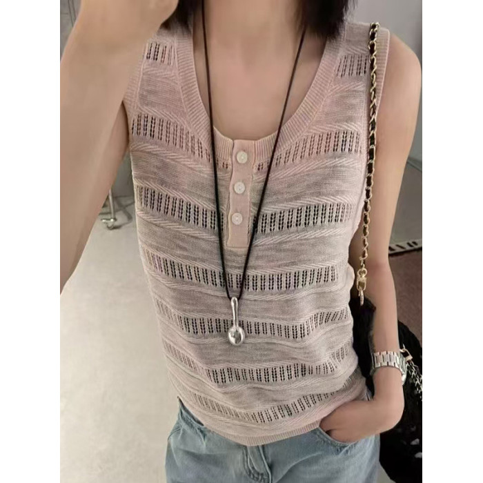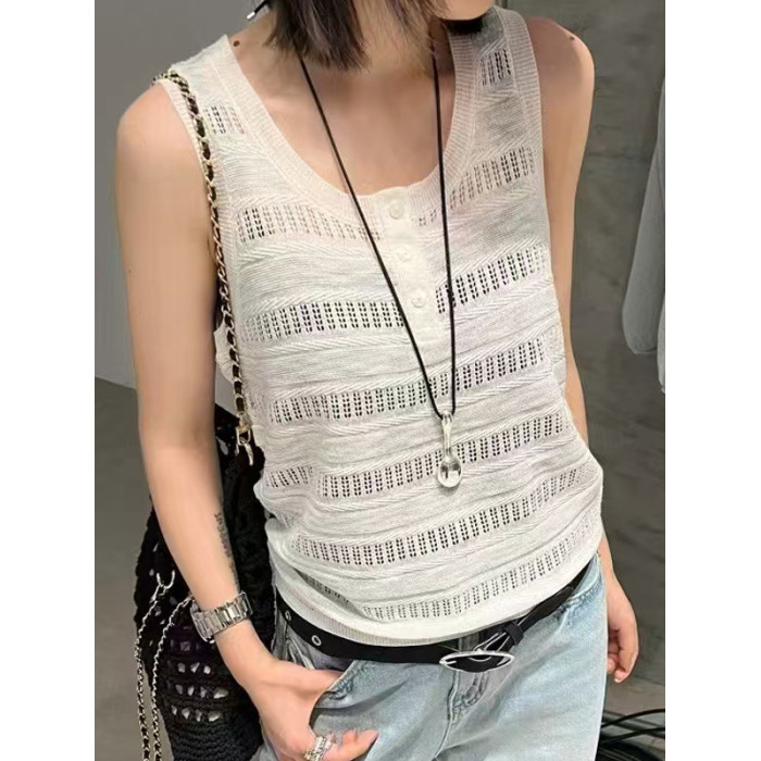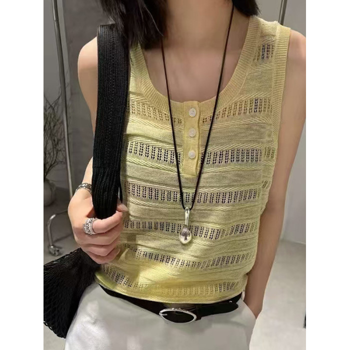 歐洲站鉤花鏤空單排釦無袖背心2025夏季新款亞麻針織背心打底衫女