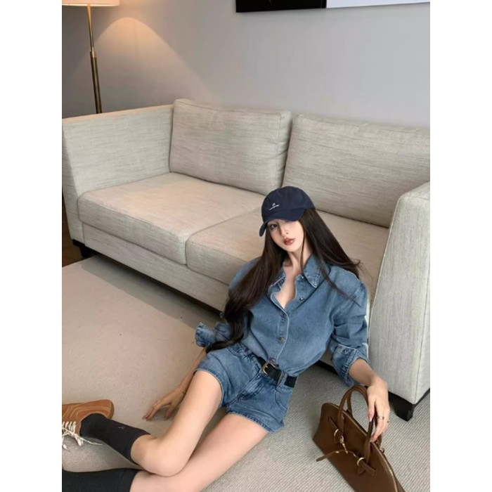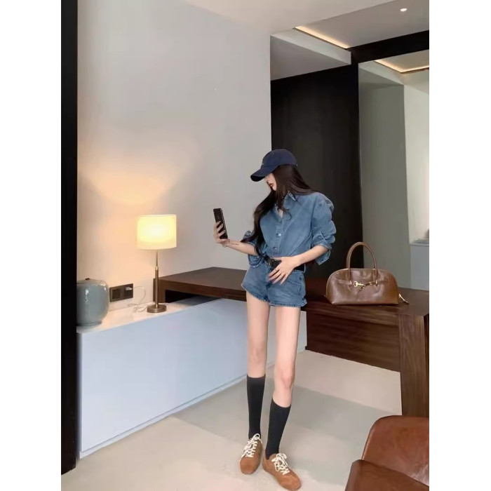 Soeur Lovely早秋新款復古藍色長袖襯衫女簡約百搭曡穿打底衫上衣