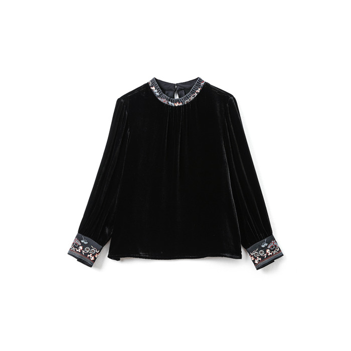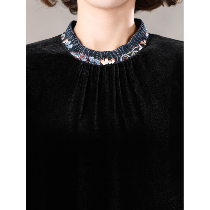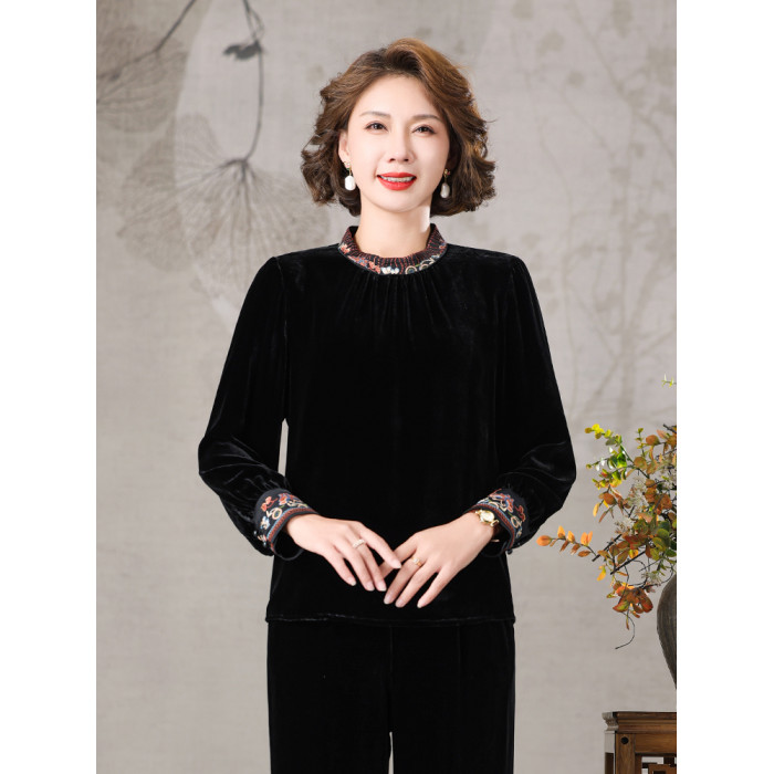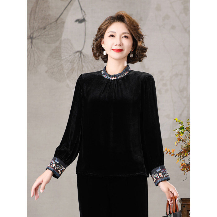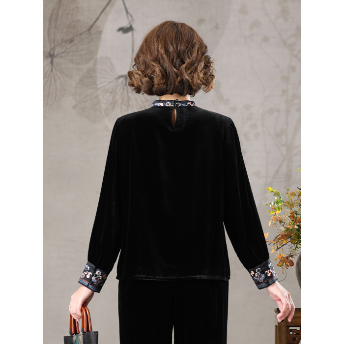 真絲絨黑色上衣高級感媽媽秋冬新款刺綉立領新中式女裝長袖打底衫