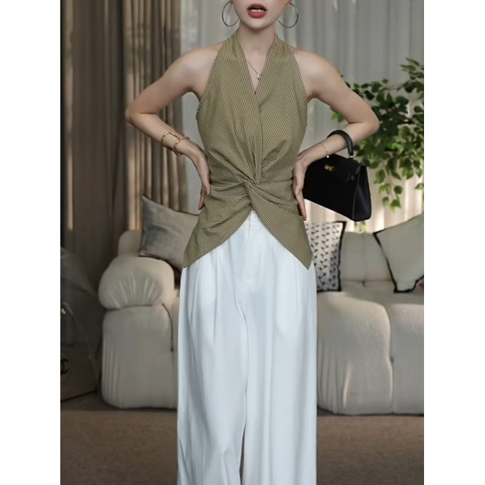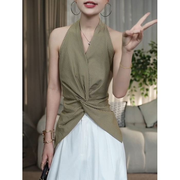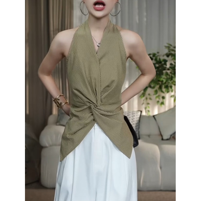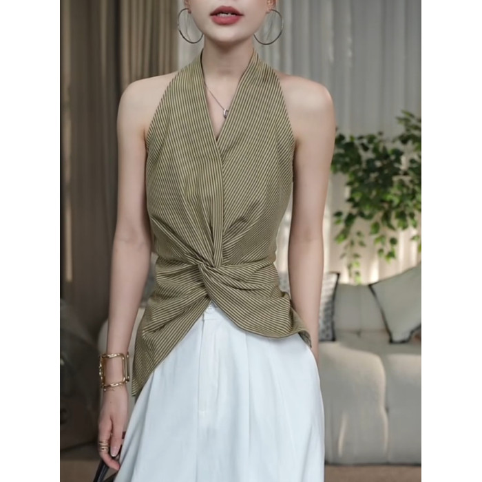 2025夏季新款無袖V領交叉綁帶條紋上衣女夏新款修身短款打底衫