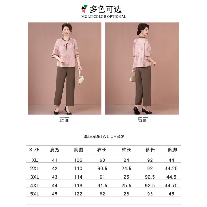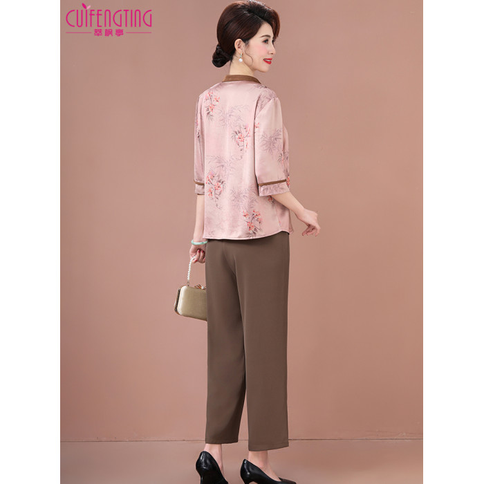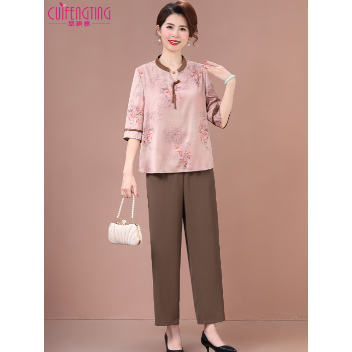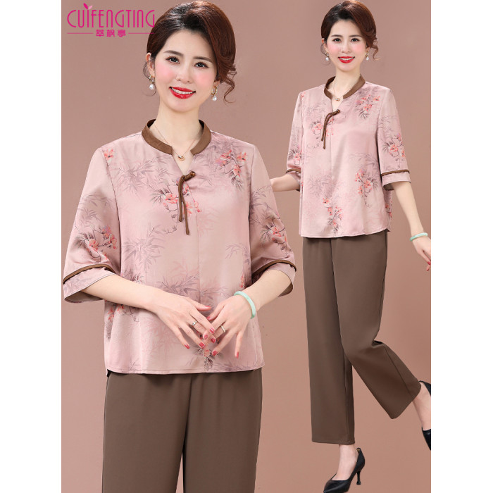 50嵗60中老年套裝夏季七分袖小衫濶腿褲時尚寬松媽媽兩件套打底衫