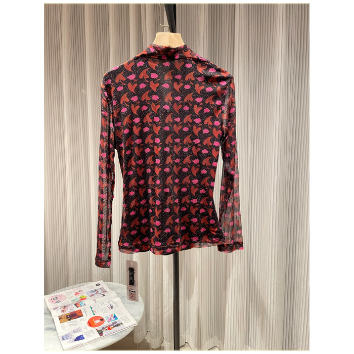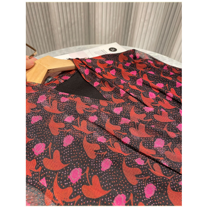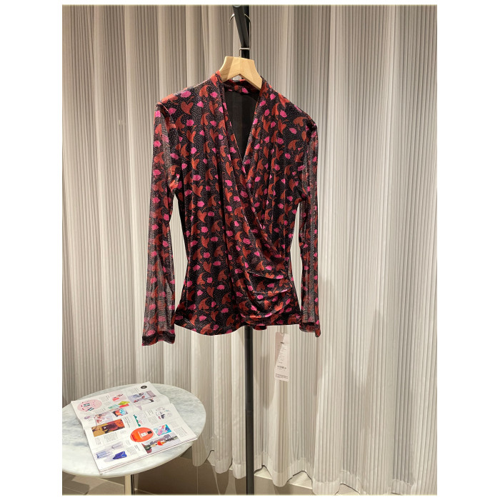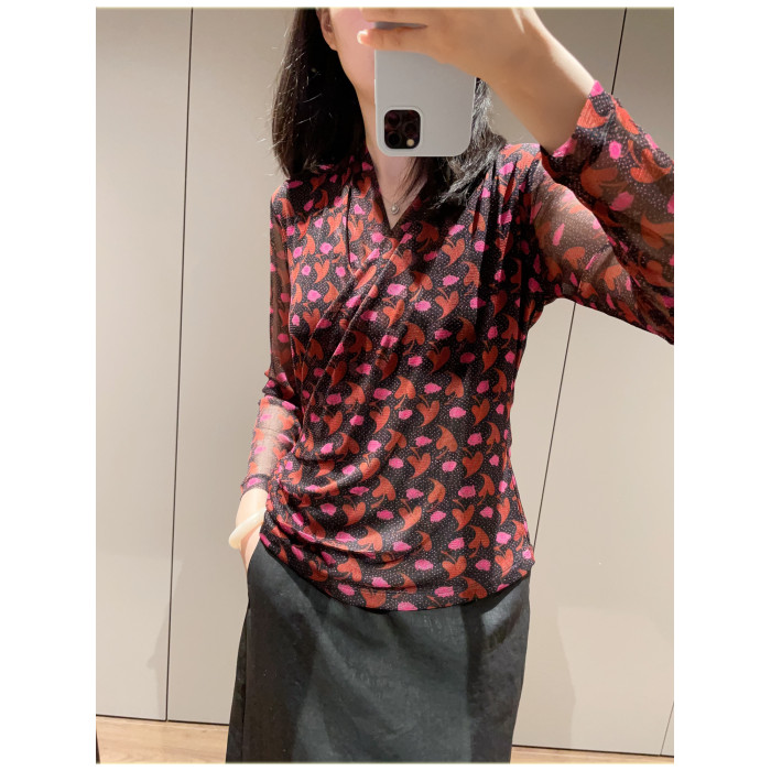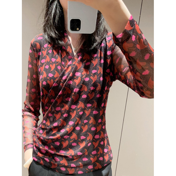 2025春季新品交叉V領印花網紗真絲針織長袖上衣桑蠶絲氣質打底衫