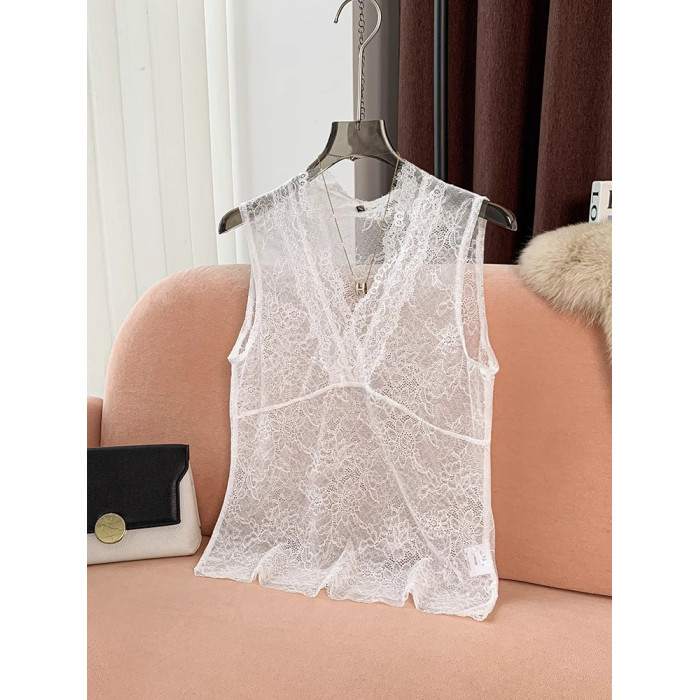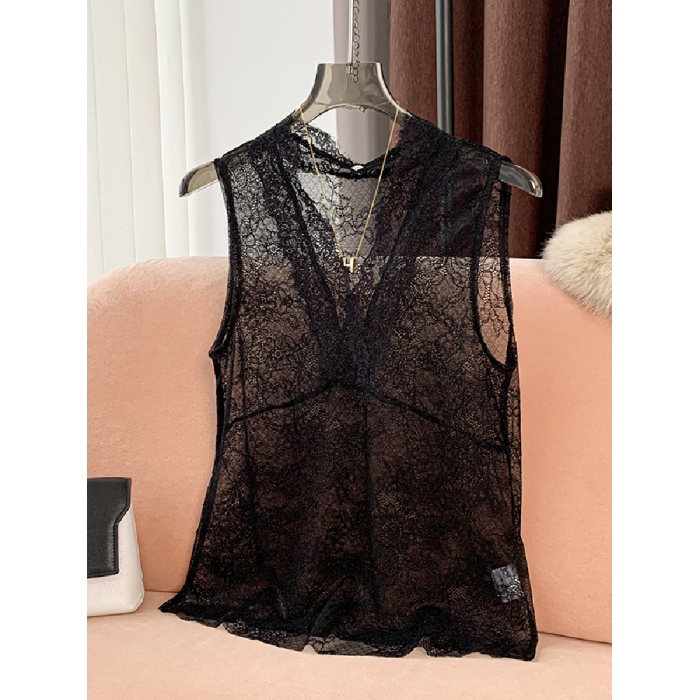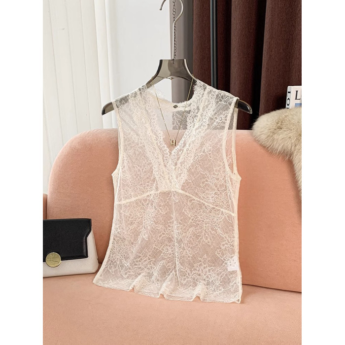 【馥鬱優雅】鉤花鏤空V領蕾絲背心女春夏新款薄款微透打底衫上衣
