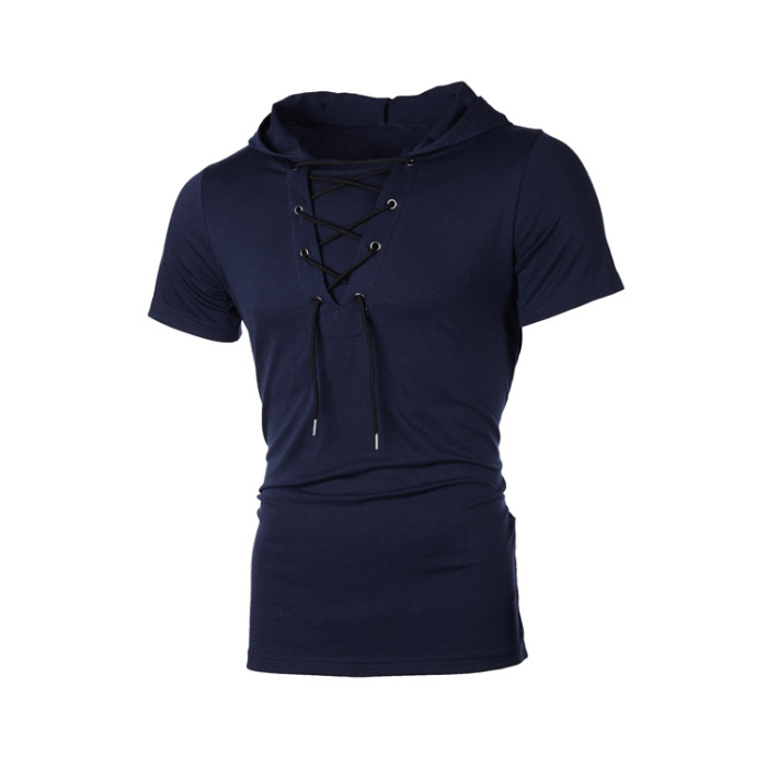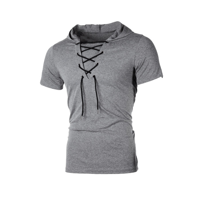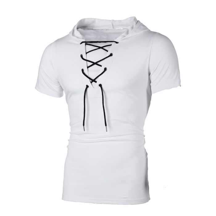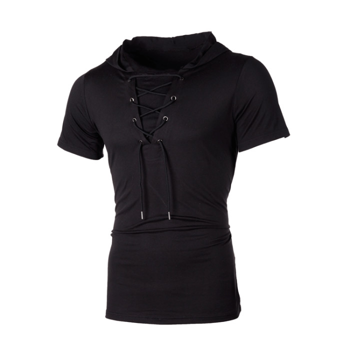 四季新款男士連帽歐碼寬松鞋帶嘻哈休閒短袖T恤