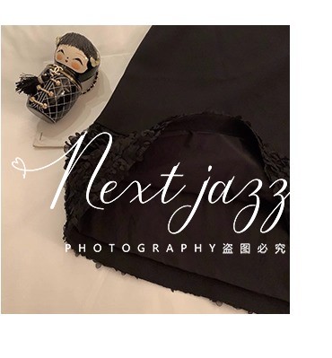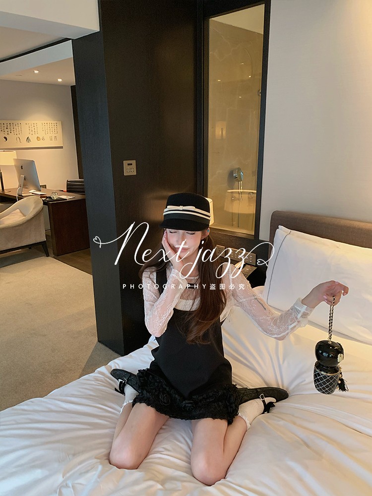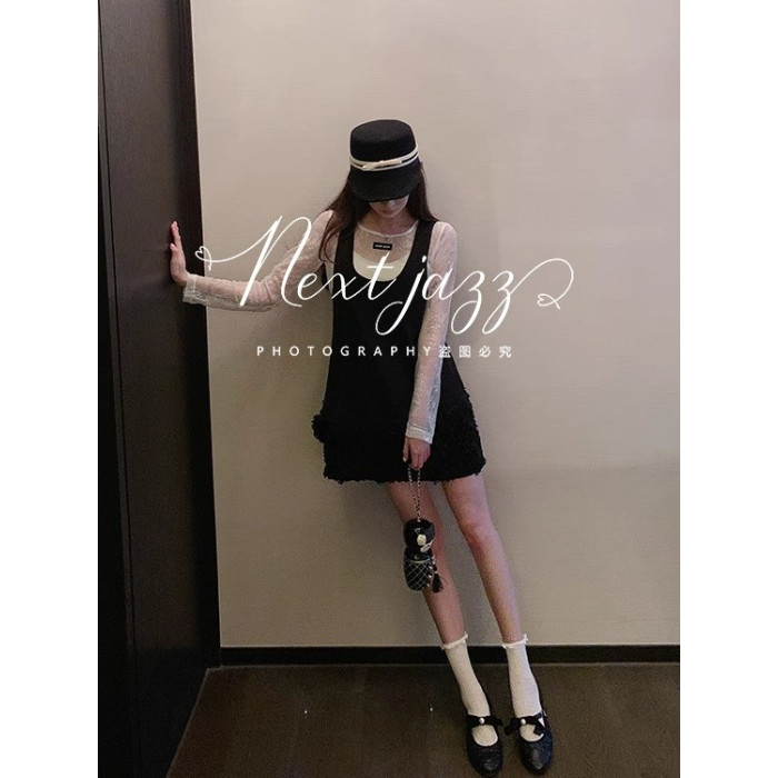 next jazz miu系玫瑰立體花朵拼接小黑裙女a字背心裙蕾絲打底衫