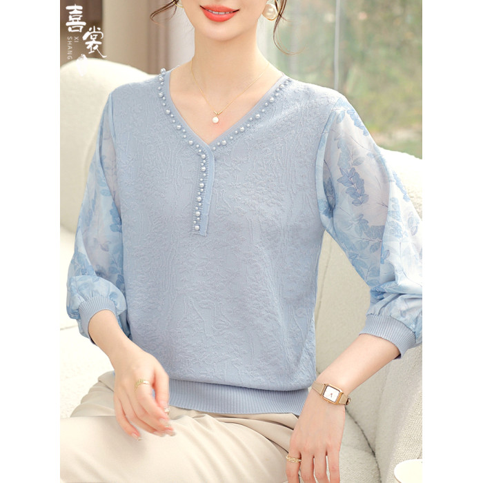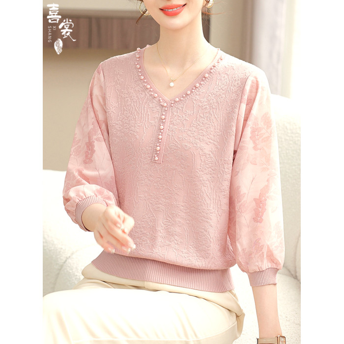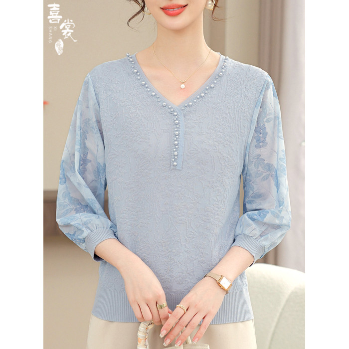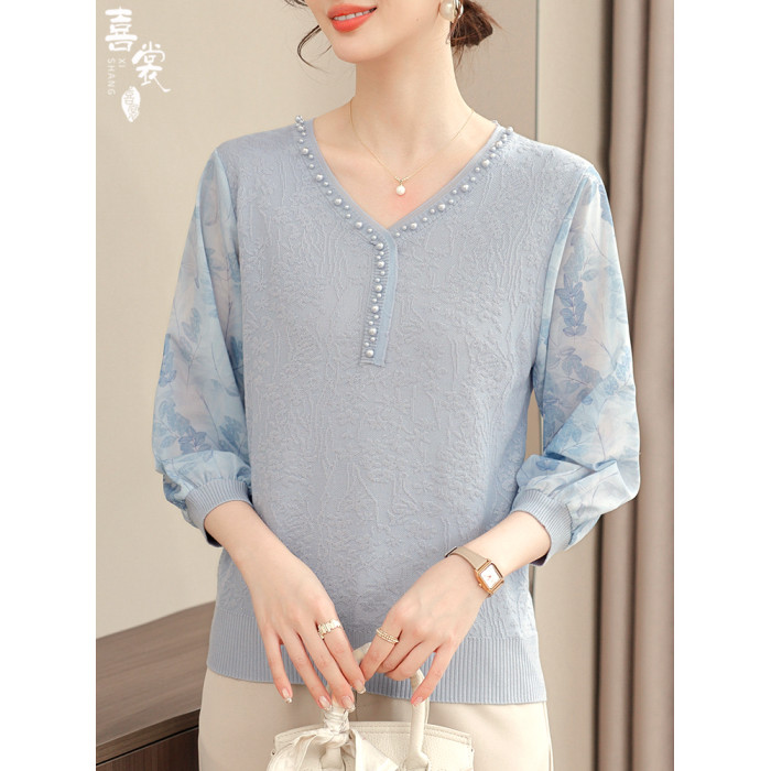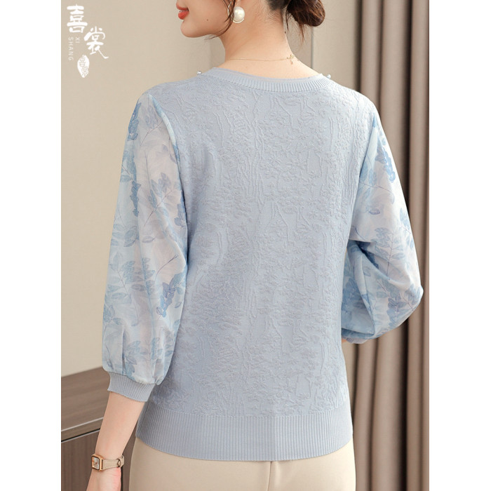 喜裳時尚洋氣雪紡針織衫女媽媽裝春裝新款上衣氣質中老年打底衫薄