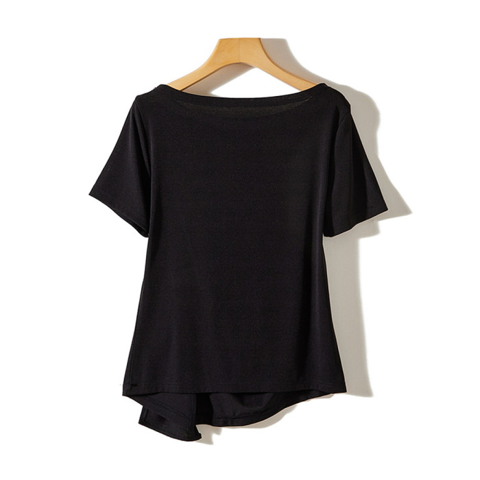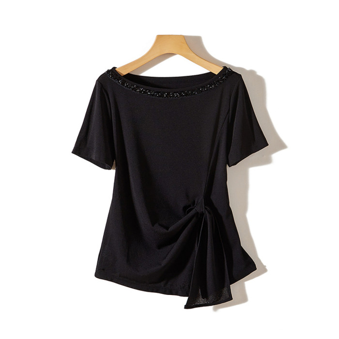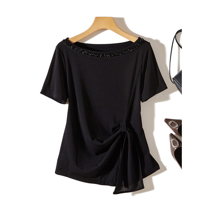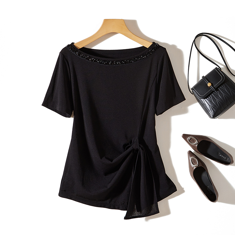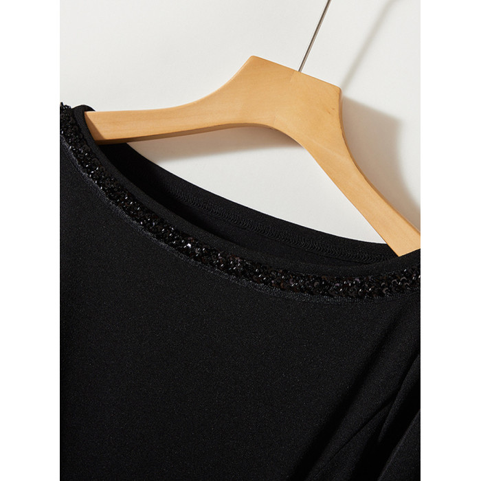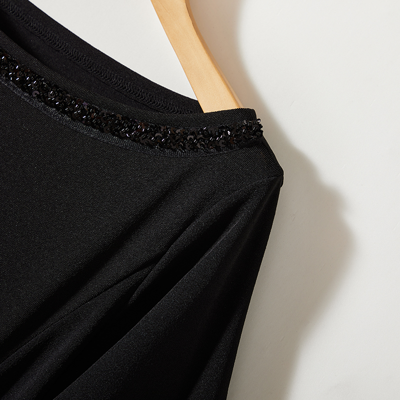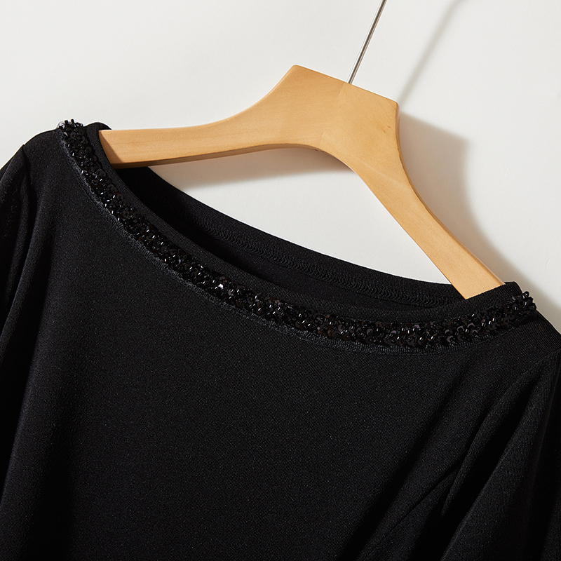 高級輕奢~亮片釘珠一字領優雅設計感不規則醋酸針織打底衫上衣女