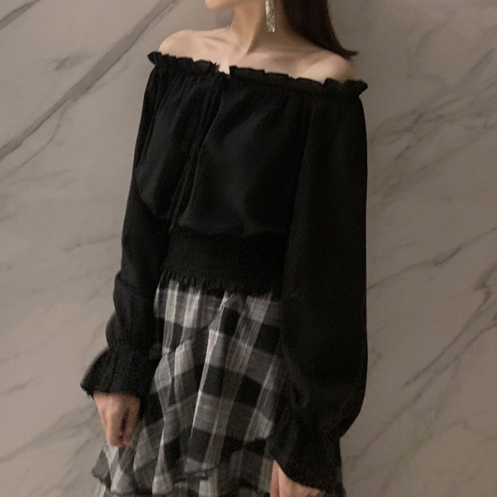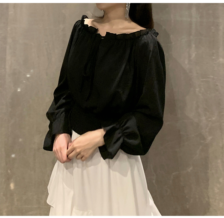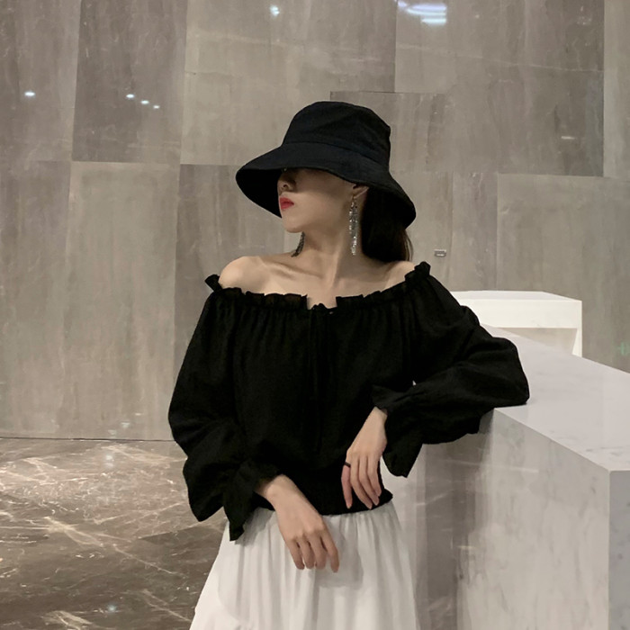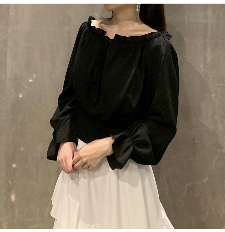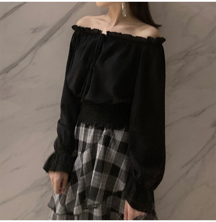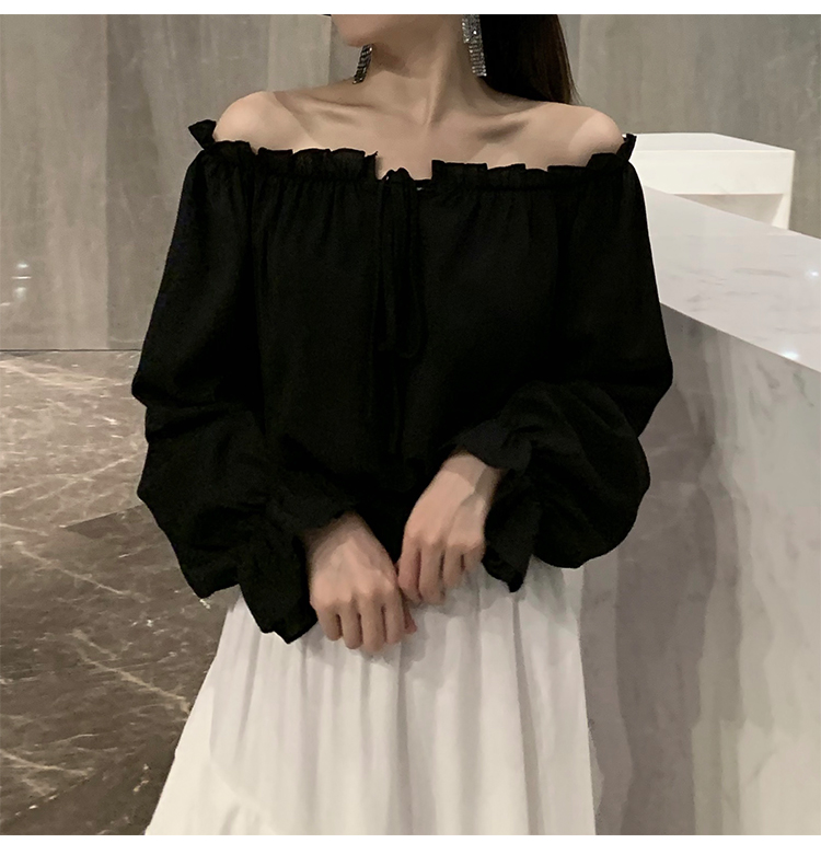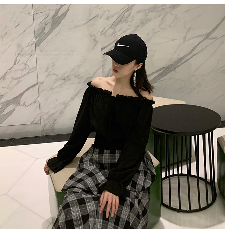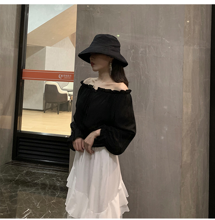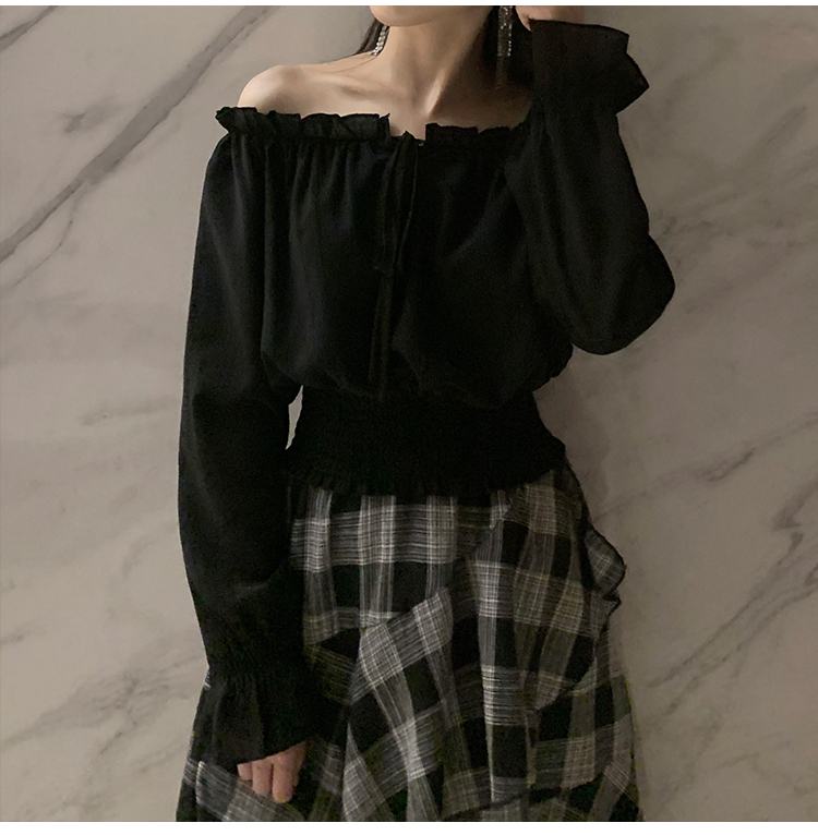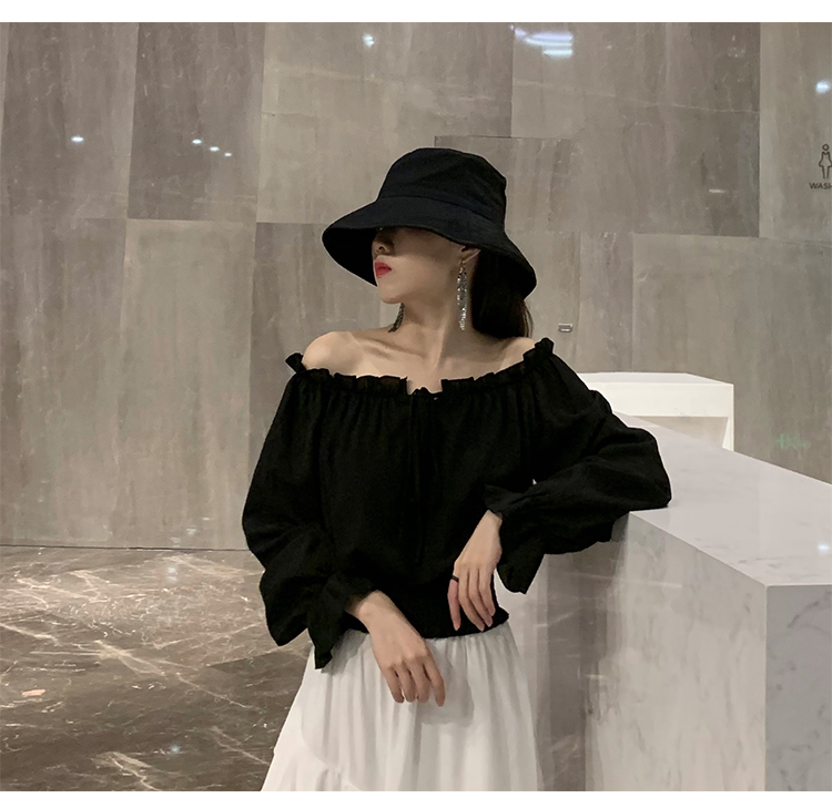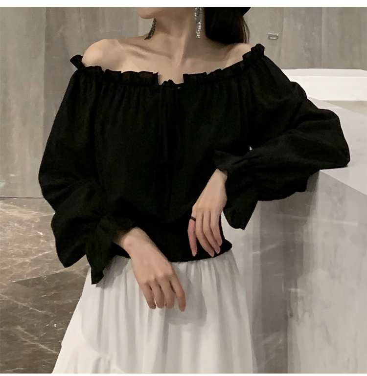 YS大石黑色一字肩上衣女早春季新款鎖骨露肩長袖設計感小衆打底衫