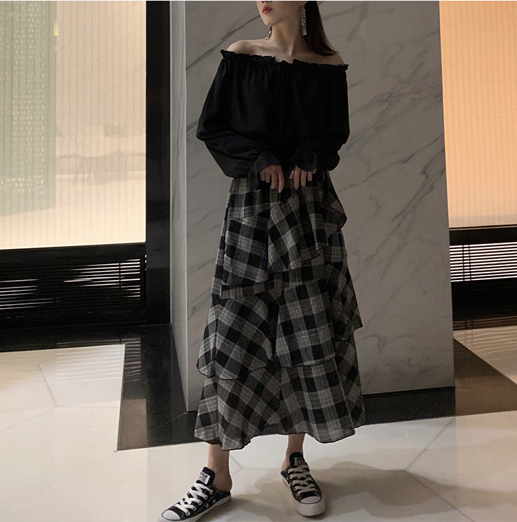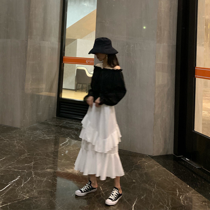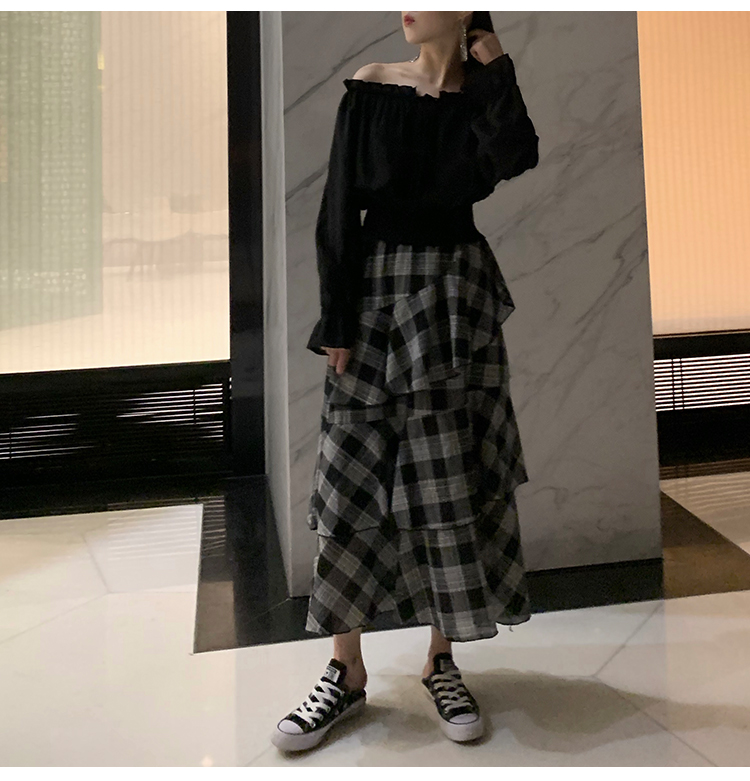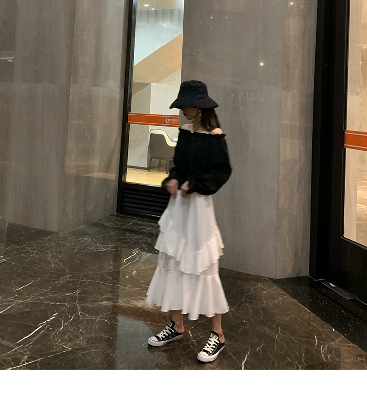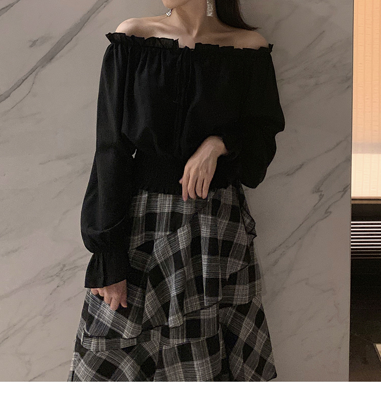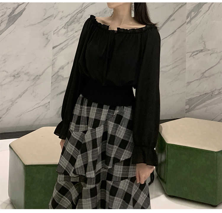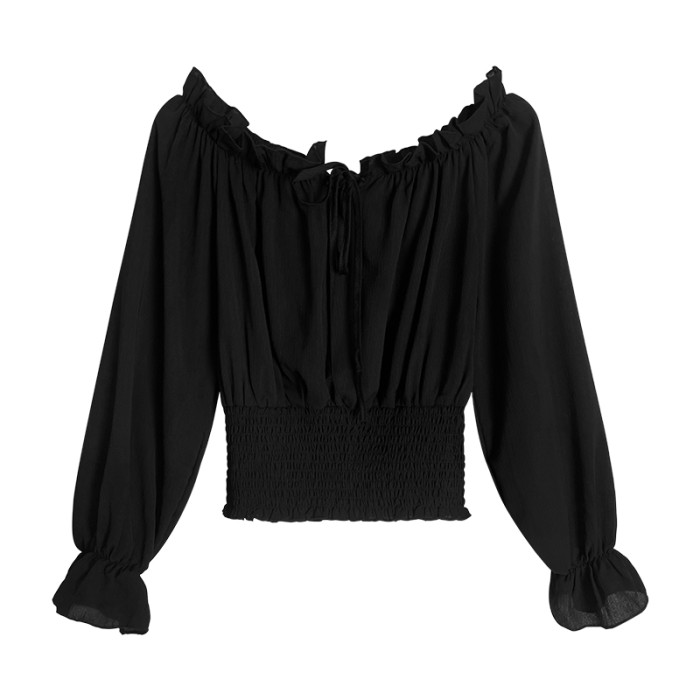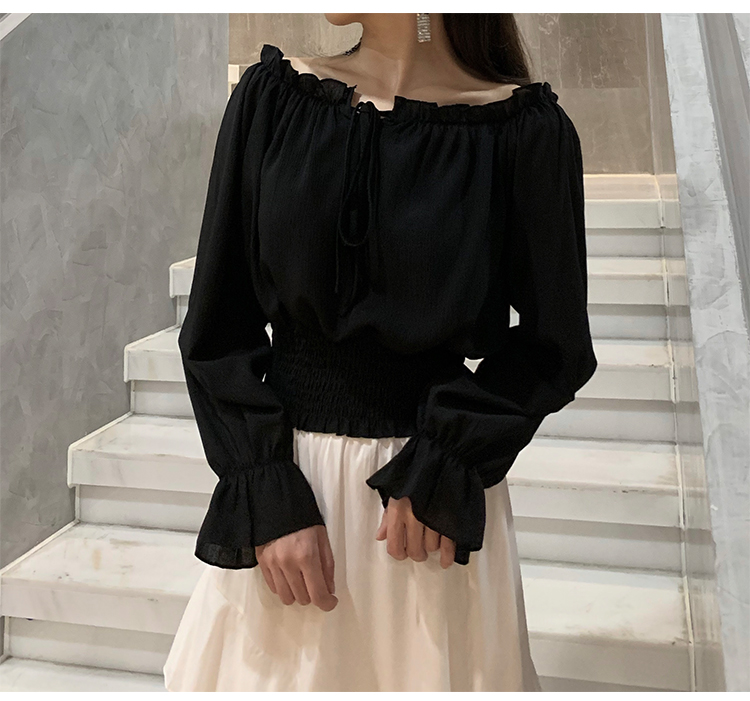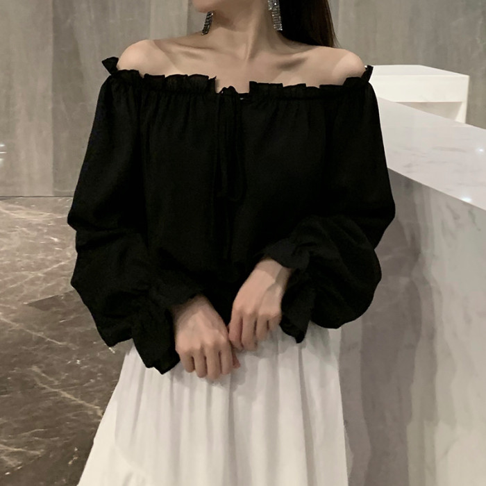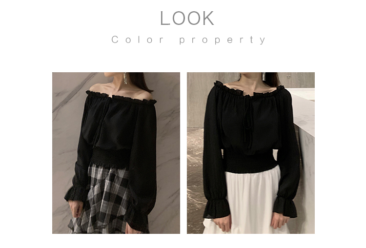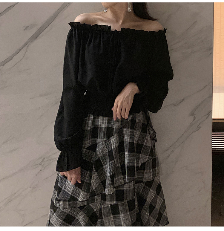 YS大石黑色一字肩上衣女早春季新款鎖骨露肩長袖設計感小衆打底衫