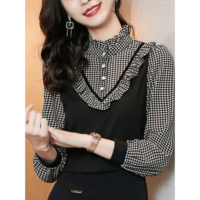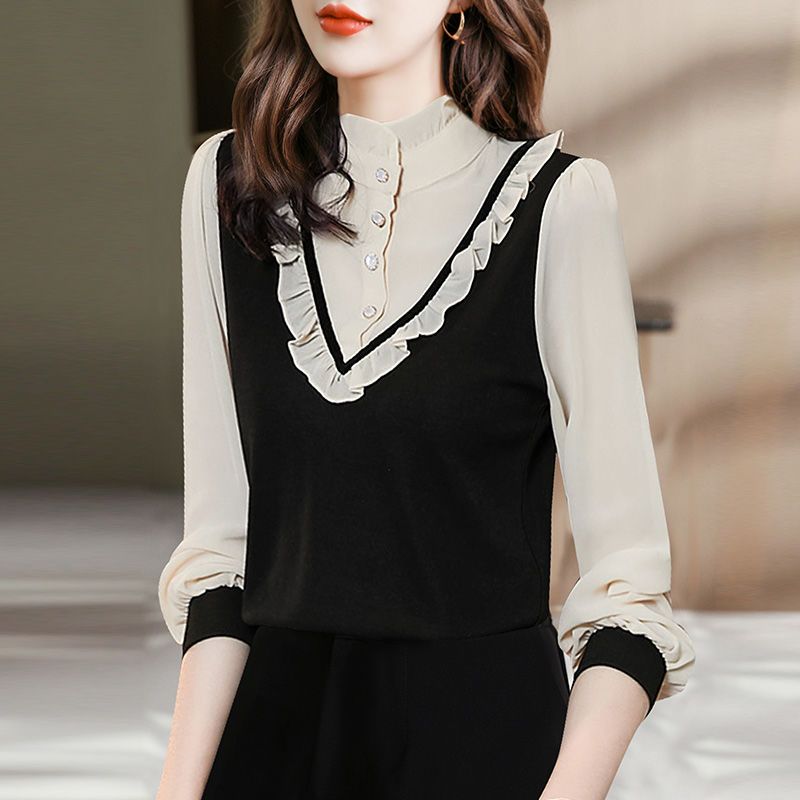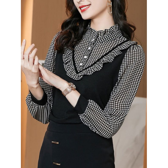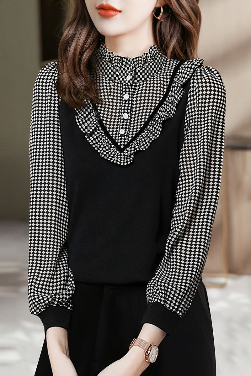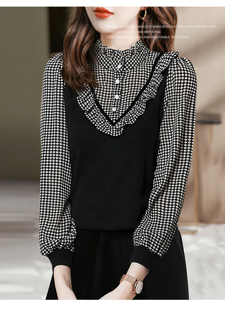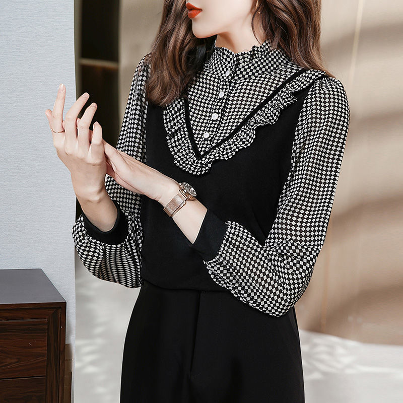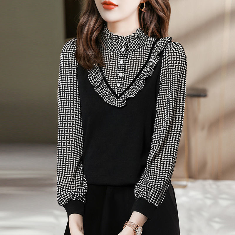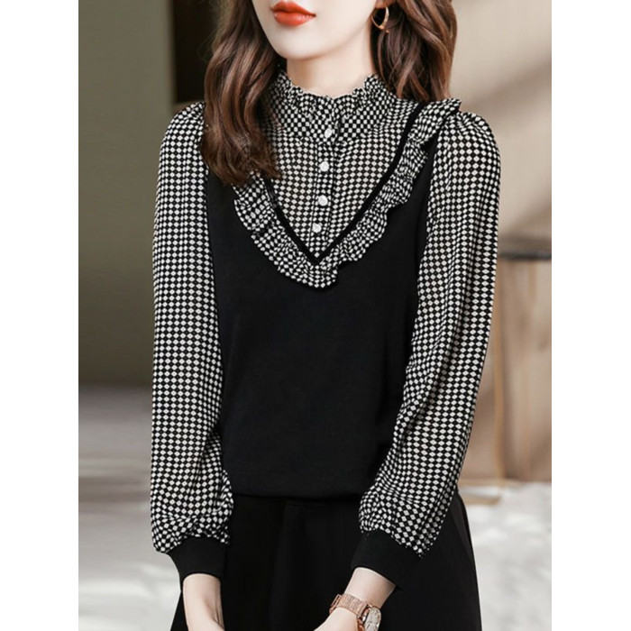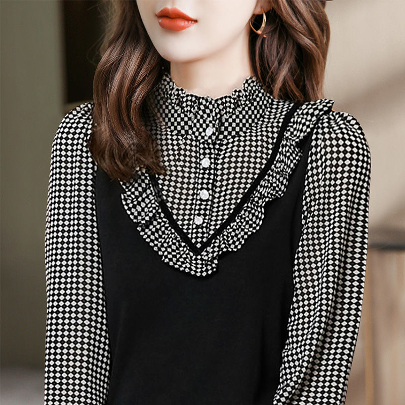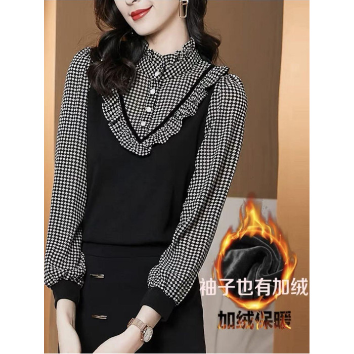 加絨/不加絨 立領假兩件女2025春季長袖格紋打底衫木耳邊顯瘦襯衫