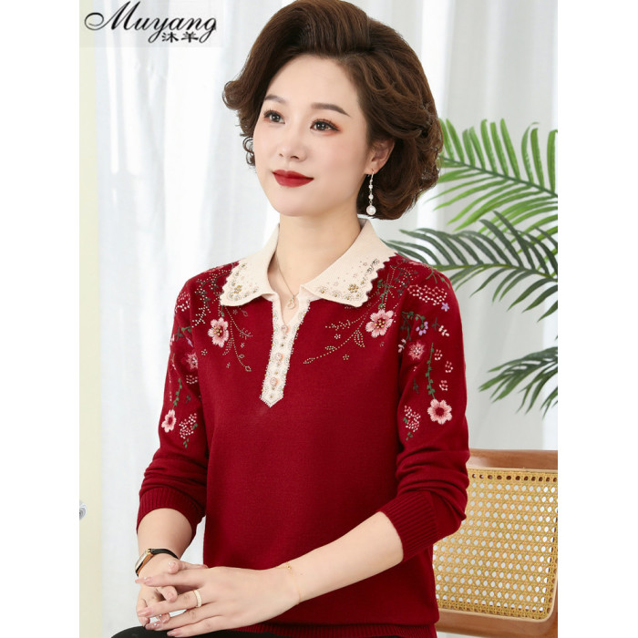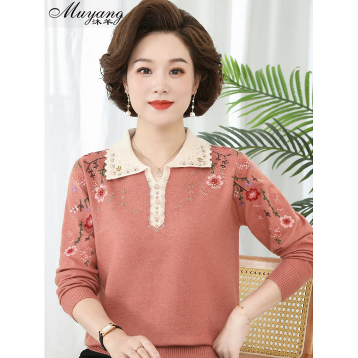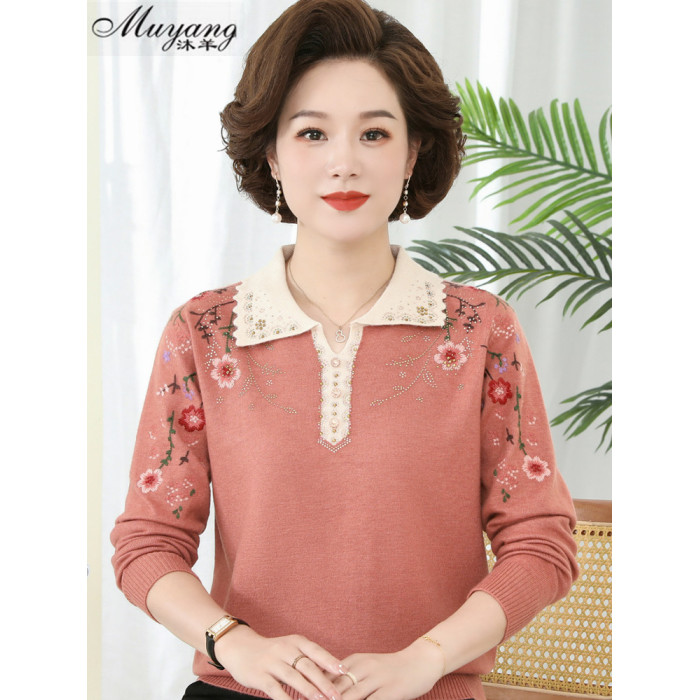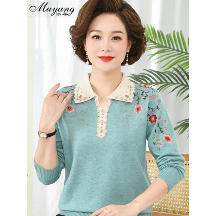 2023年新款媽媽秋裝打底衫洋氣質上衣中年女裝毛衣春秋翻領羊毛衫