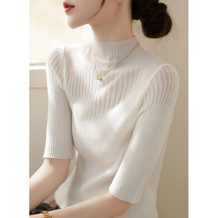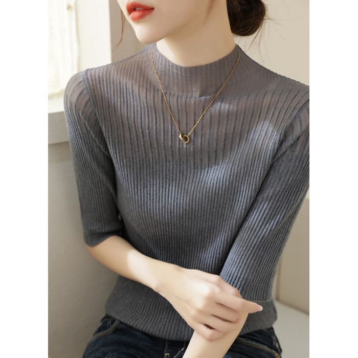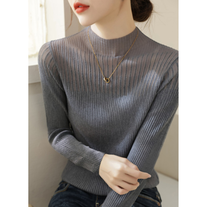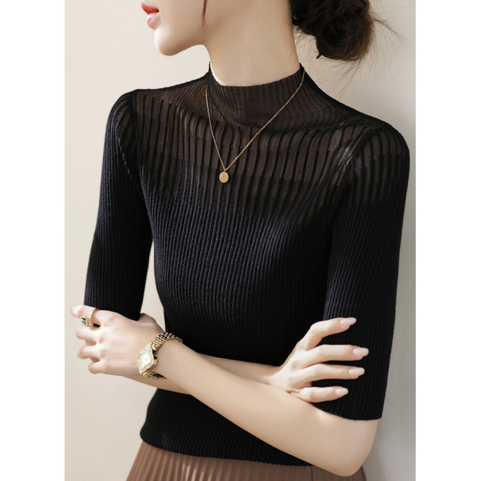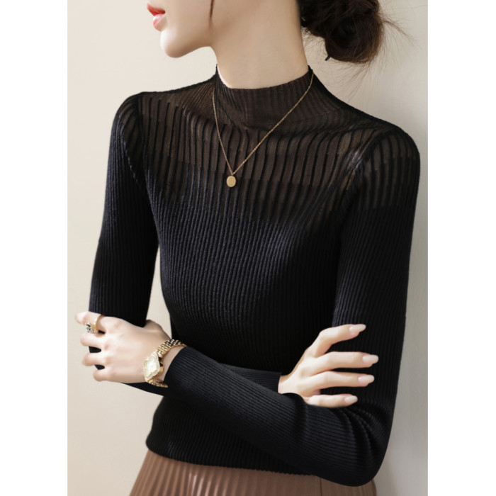 春季新款半高領高級蕾絲網紗長袖針織打底衫上衣女裝黑色內搭毛衣
