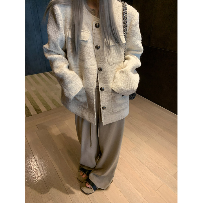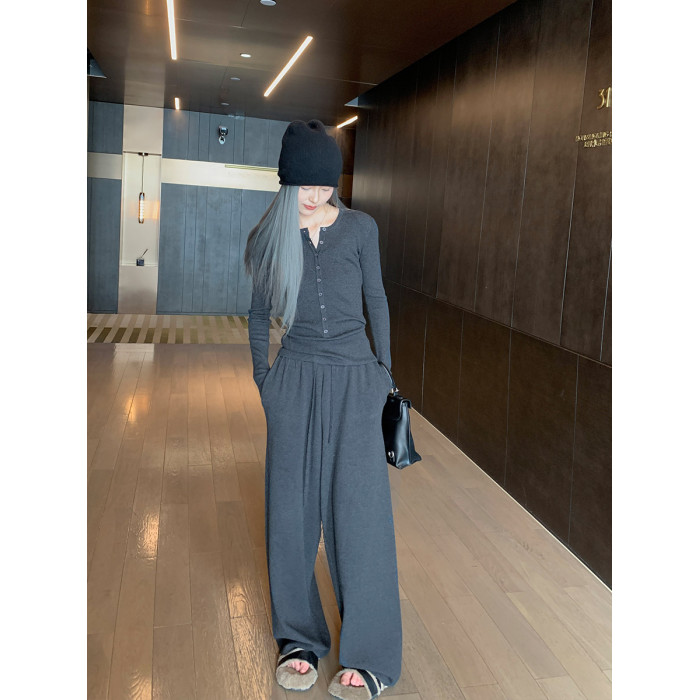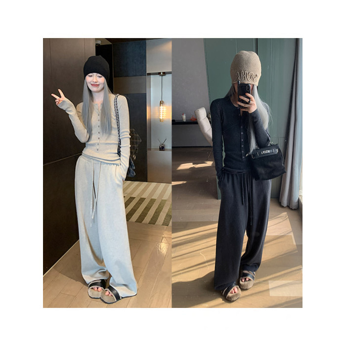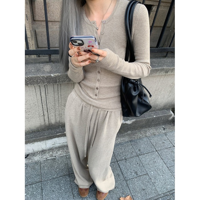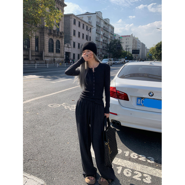 洛邊紐釦設計感輕熟半開領顯瘦百搭針織毛衣打底衫針織褲兩件套女