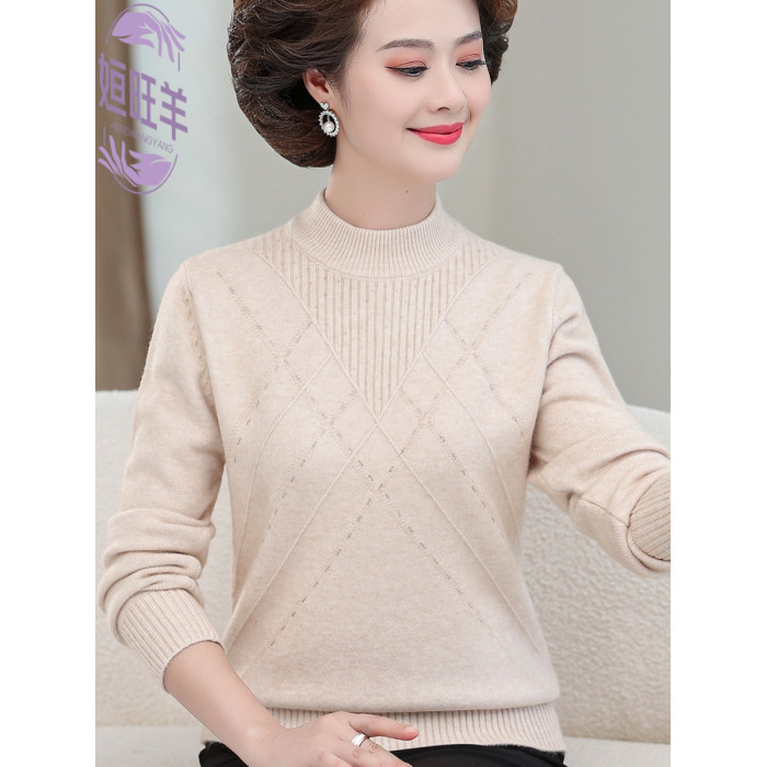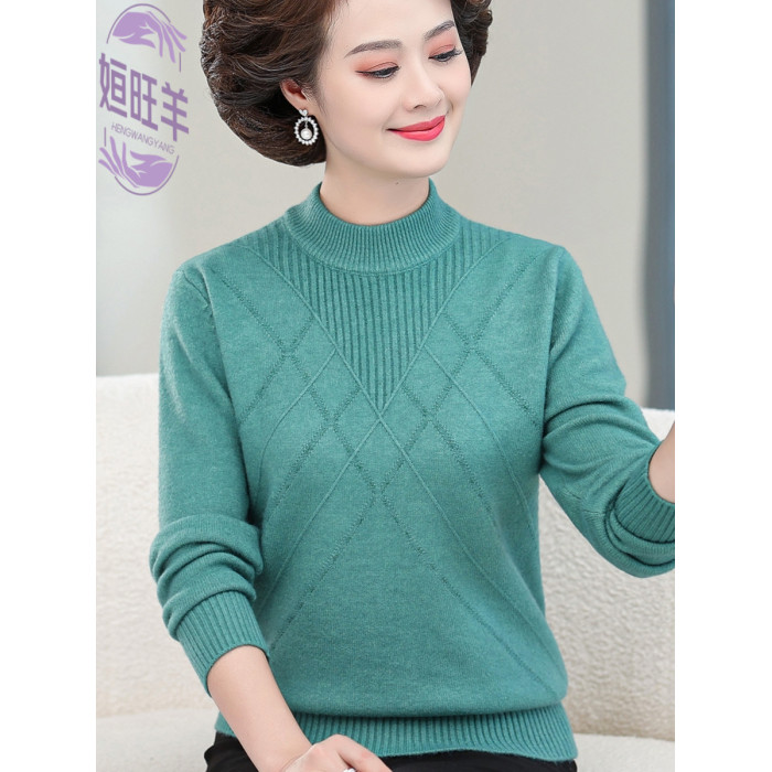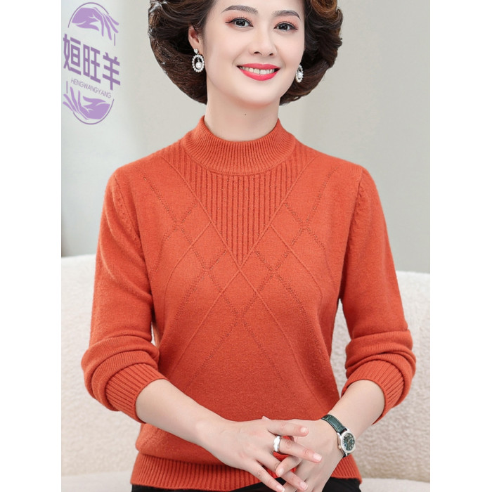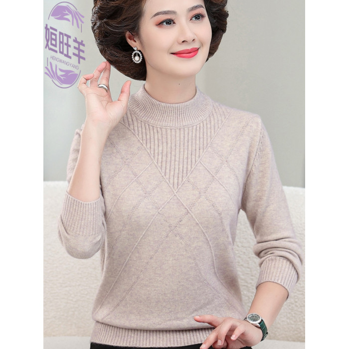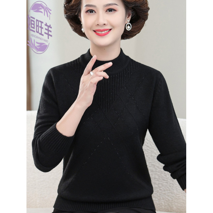 新款媽媽裝秋冬針織長袖上衣中老年冬季厚款半高領打底衫純色毛衣