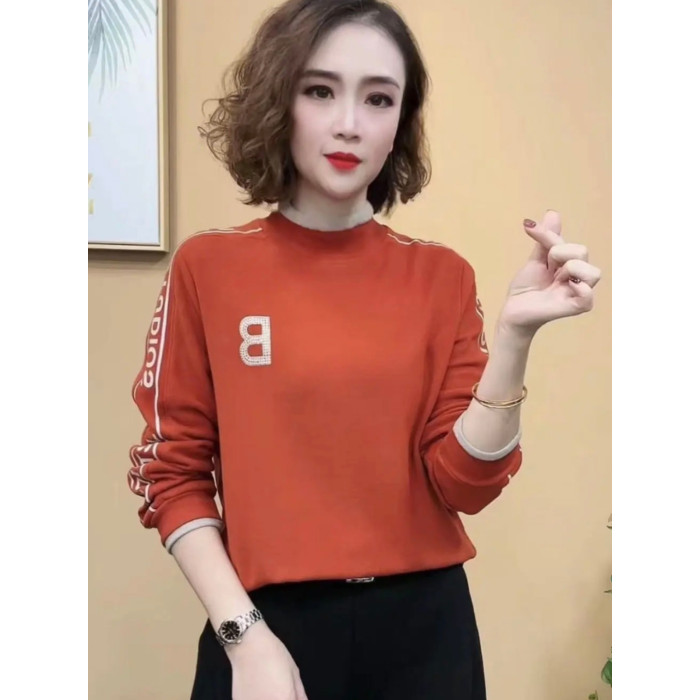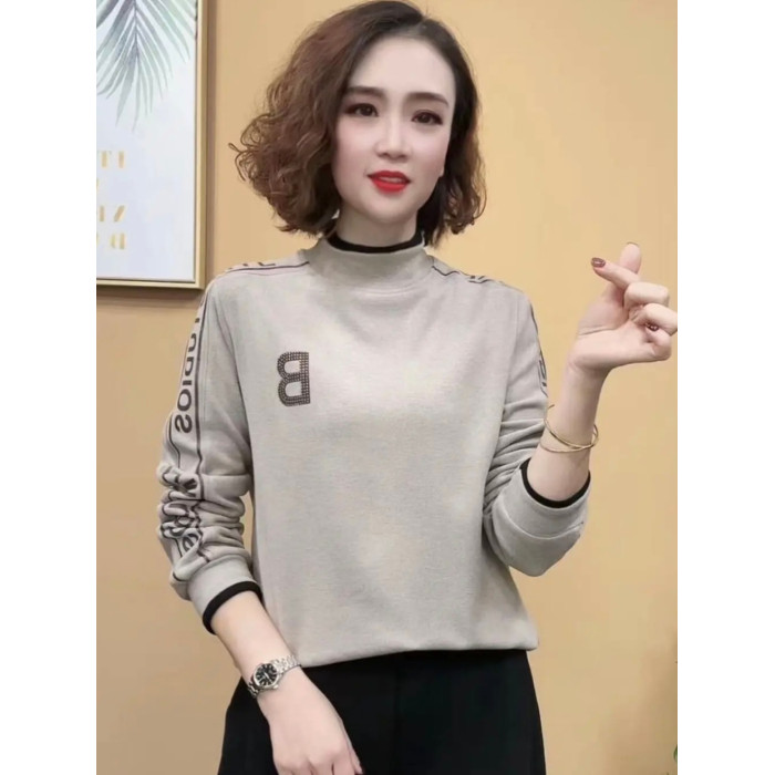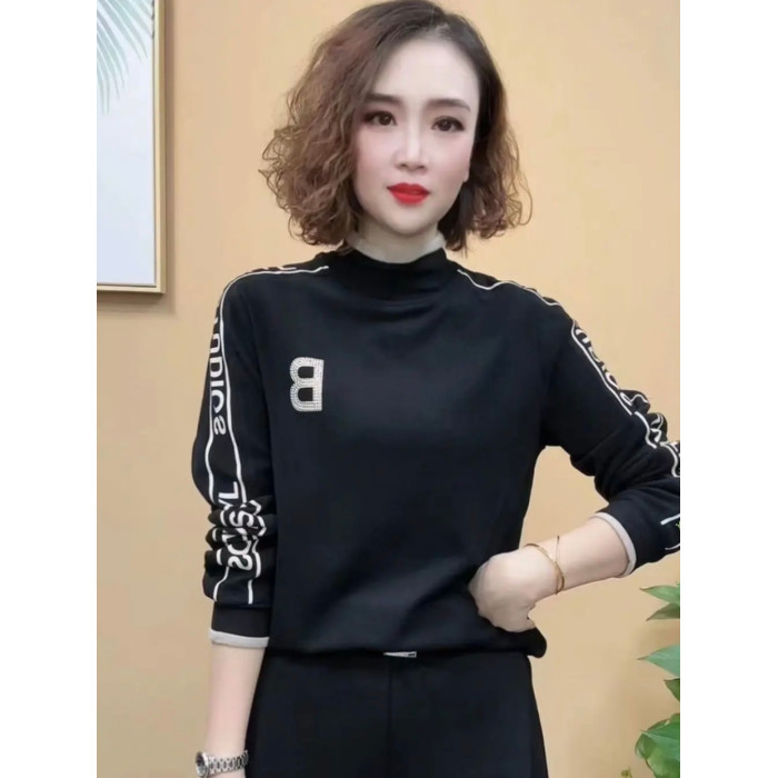 秋冬新款半高領雙面絨打底衫氣質百搭字母燙鑽減齡寬松拼接上衣女