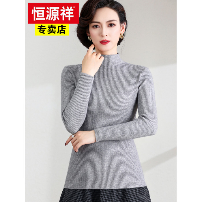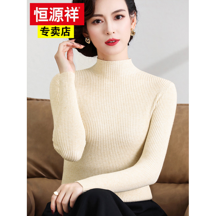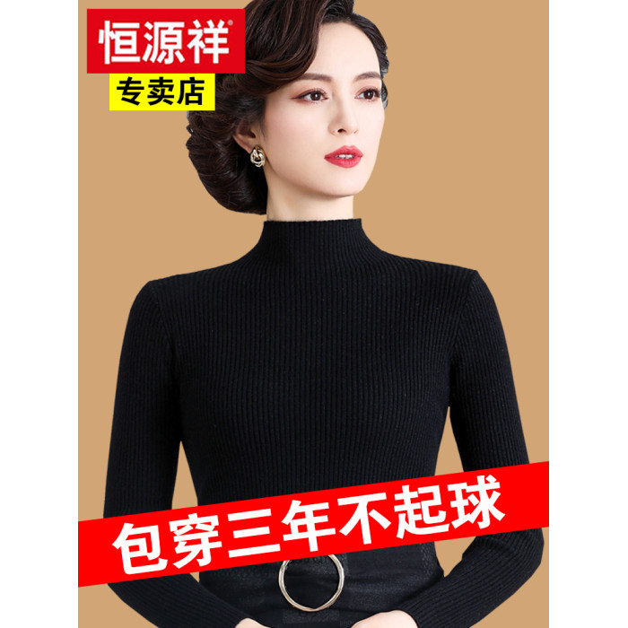 恒源祥羊毛衫女秋冬半高領純色打底衫毛衣套頭修身彈力黑色針織衫