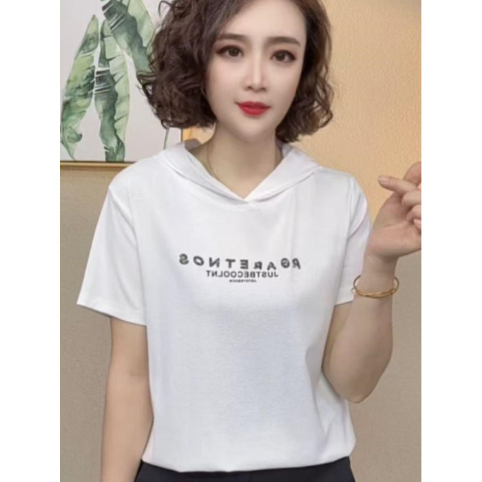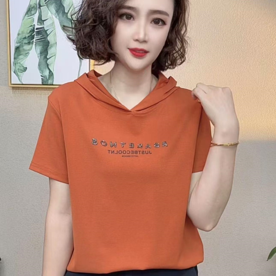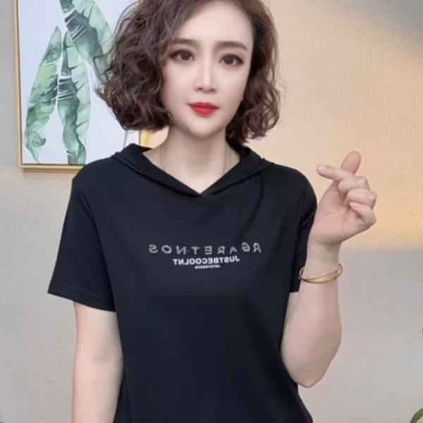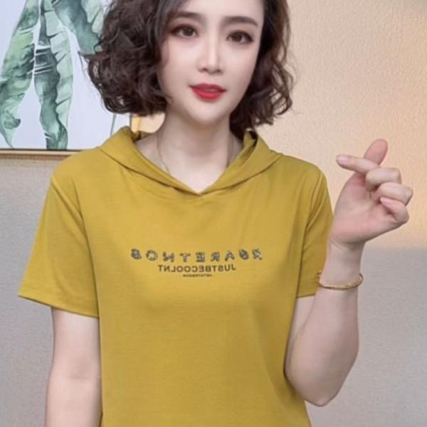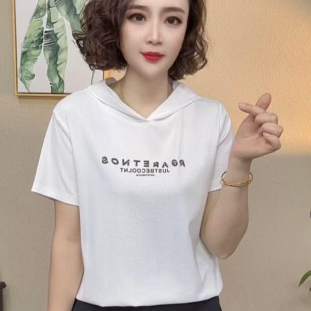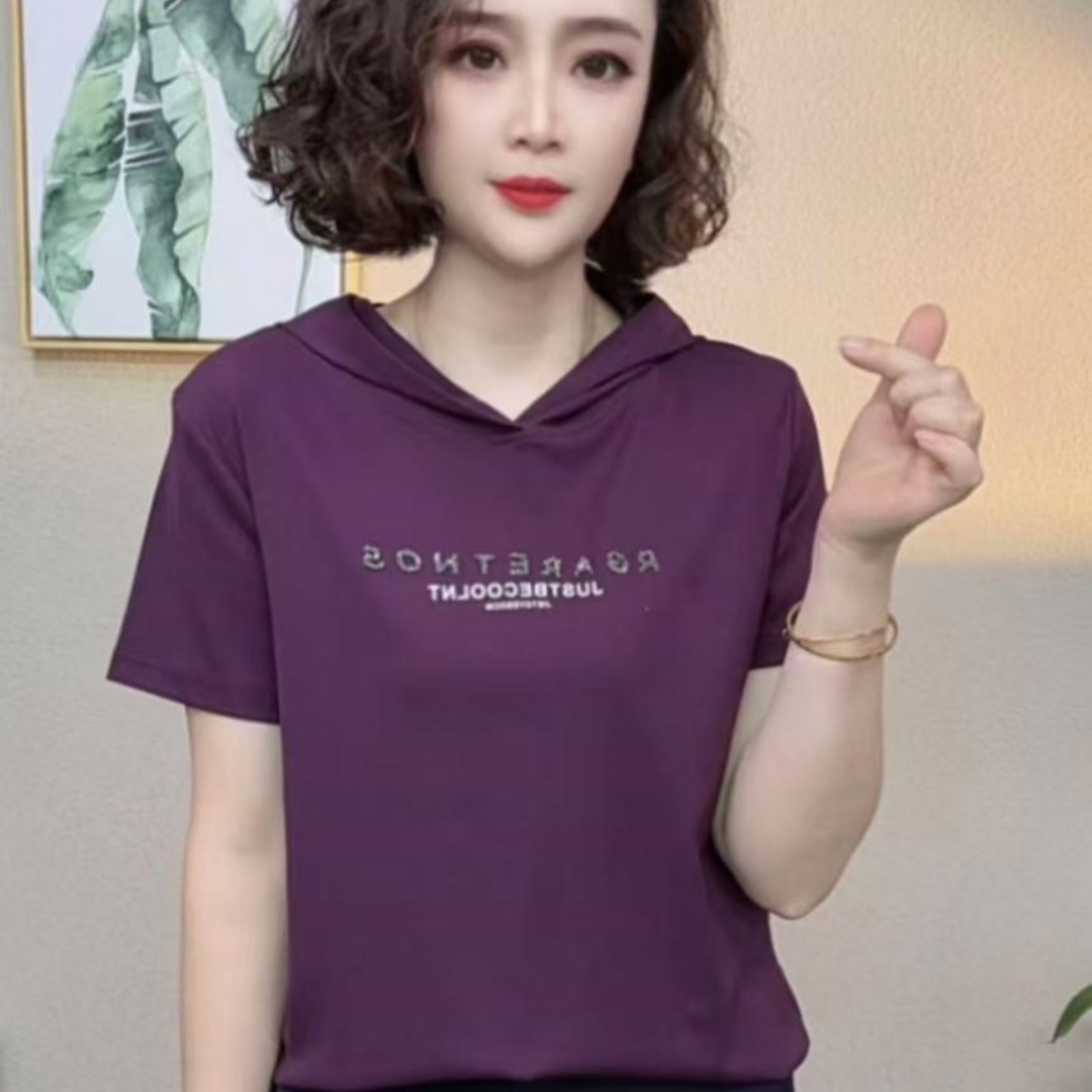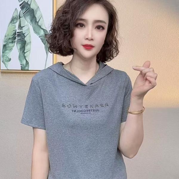 2025夏季新款連帽短袖t恤女打底衫時尚媽媽裝純色休閒減齡上衣
