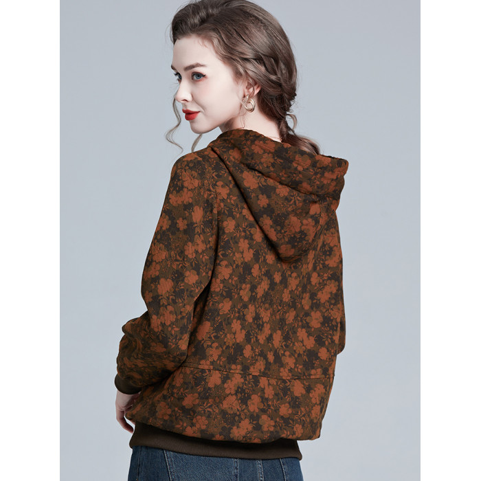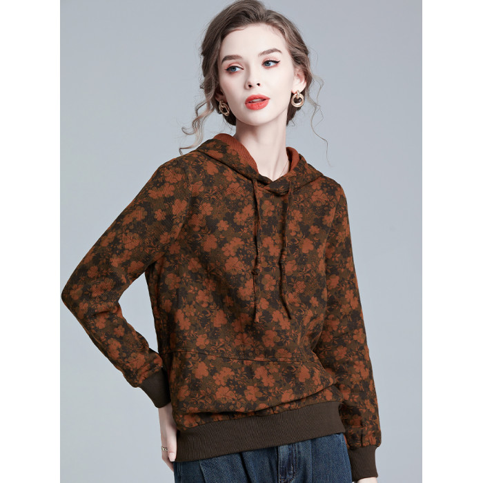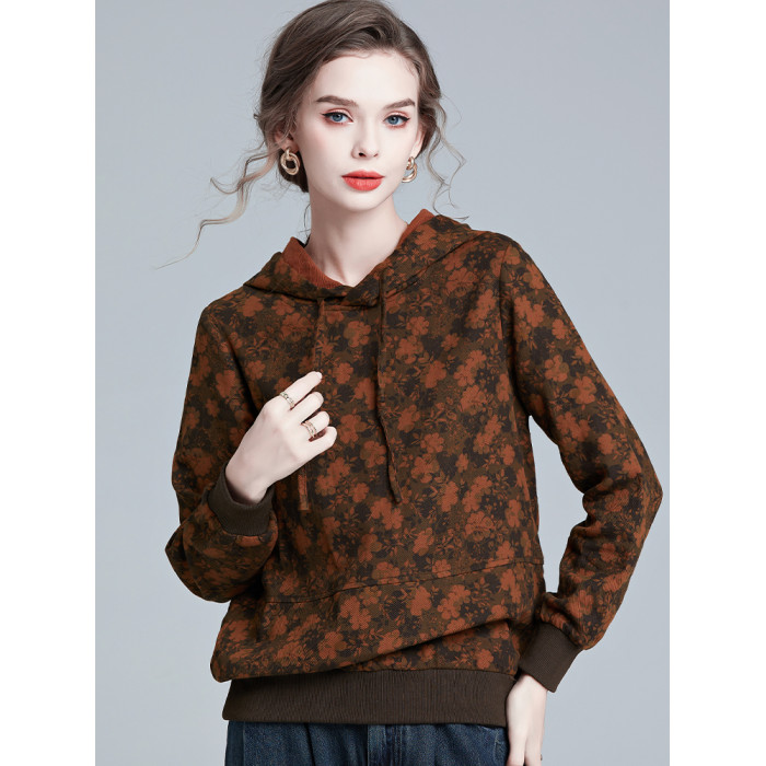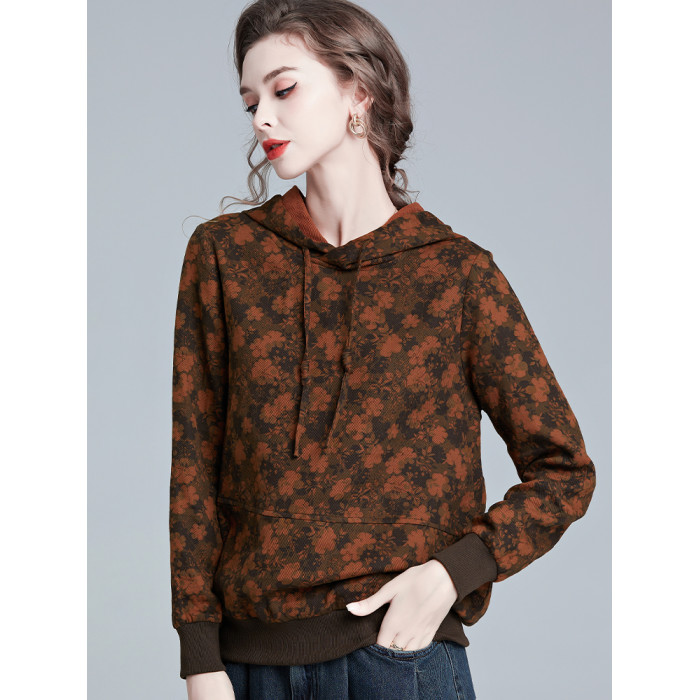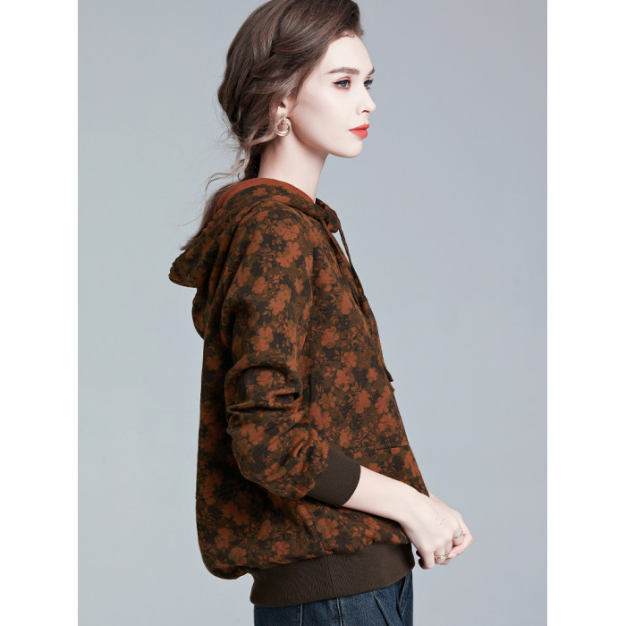印花連帽衛衣女2025秋季復古時尚百搭大碼套頭洋氣顯瘦寬松打底衫